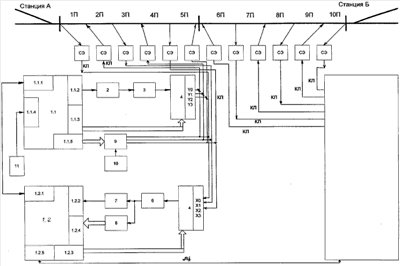 В устройство введен демультиплексор 4 и мультиплексор 5. Выход второго порта последовательной передачи данных 1.1.2 через модем с угловой модуляцией 2 и путевой усилитель 3 подключен к информационному входу демультиплексора 4, выходы которого Y0, Y1, Y2, …, Yk подключаются к соответствующей кабельной линии (КЛ), и через согласующий элемент (СЭ) к питающему концу рельсовой цепи. Адресные входы демультиплексора 4 подключены к порту адреса 1.1.3 первого 1.1 управляющего микропроцессорного контроллера. Приемный конец рельсовой цепи через соответствующее согласующее устройство и кабельную линию подключается к соответствующему информационному входу Х0, X1, Х2, …, Xk мультиплексора 5, выход которого подключен к входу приемника, включающего в себя фильтр 6, демодулятор угловой модуляции 7 и аналого-цифровой преобразователь 8. Выход фильтра 6 подключен к входам демодулятора 7 и аналого-цифрового преобразователя 8. Выход демодулятора 7 подключается ко второму порту последовательной передачи данных 1.2.2 второго 1.2 управляющего микропроцессорного контроллера, а выходы аналого-цифрового преобразователя 8 к порту параллельного ввода информации 1.2.4 того же контроллера. Адресные входы мультиплексора 5 подключены к порту адреса 1.2.3 второго 1.2 управляющего микропроцессорного контроллера. Выходы схемы выбора кодовых сигналов 9 подключаются к кабельной линии, ее первые входы соответственно соединены с путевыми устройствами автоматической локомотивной сигнализации 10, а вторые входы подключаются к порту вывода 1.1.5 первого 1.1 управляющего микропроцессорного контроллера. Линейные цепи (ЛЦ), соединяющие аппаратуру двух станций, подключаются к порту 1.2.5 ввода-вывода информации второго 1.2 управляющего микропроцессорного контроллера, а входы порта 1.1.4 ввода-вывода информации подключаются к цепям электрической централизации 11. Первый 1.1 и второй 1.2 управляющие микропроцессорные контроллеры соединены между собой через первые 1.1.1 и 1.2.1 порты последовательной передачи данных.