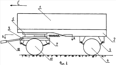 Известен тракторный самосвальный прицеп, описанный в брошюре «Прицеп тракторный 2ПТС-4-793-01. Техническое описание и инструкция по эксплуатации. ПО Ташкентский тракторный завод, Ташкент-1983 г.». На с.8 рис.1 этого руководства показан общий вид тракторного прицепа, состоящего из кузова, размещенного на раме, в задней части которой установлена с помощью рессор ведомая пара колес, а в передней с помощью поворотного круга размещена подкатная тележка с рулевыми колесами. Подкатная тележка снабжена дышлом, предназначенным для транспортировки прицепа в составе тракторного поезда. Такой прицеп прост по конструкции и достаточно эффективен в условиях эксплуатации. Однако ему присущ весьма важный недостаток, заключающийся в том, что, находясь в составе тракторного поезда, в его движении возникают значительные колебания прицепа в поперечной плоскости, называемые вилянием. Такие колебания бывают так значительны (их амплитуда достигает 400 мм в одну из боковых сторон и более), что возникают ситуации, когда прицеп может столкнуться с обгоняющим или движущимся навстречу транспортом. В итоге техника выходит из строя, гибнут люди и т.д.