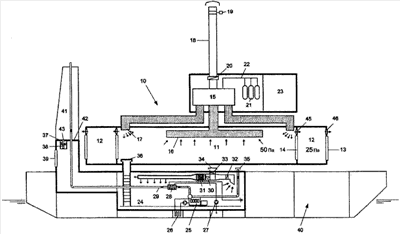 Судно 10 состоит из баржи 40, имеющей машинное отделение 24, где необходимый источник питания приводит в действие необходимые части и системы судна 10. В машинном отделении 24 желательно иметь две укомплектованные генераторные установки 25. Причем одновременно работать может только одна. Вторая генераторная установка будет выполнять роль резервной на случай останова первой генераторной установки. Каждая генераторная установка охлаждается с помощью раздельных систем охлаждения 26. Вытяжные трубы 29 генераторных установок 25 проводят вытяжку через вентиляционную трубу 41. Вентиляционная труба 41 закрыта изоляцией трубы 42 с тем, чтобы предотвратить попадание токсичных и/или взрывоопасных газов в машинное отделение. Вытяжная газовая труба (трубы) 29 проходит через изоляцию трубы 42 при использовании газонепроницаемых прокладок. При условиях нормальной эксплуатации вентиляция машинного отделения осуществляется через воздухозаборник 34 к машинному отделению 24 и воздуховыпускное отверстие через изоляцию трубы 42. Желательно, чтобы она была снабжена вентилятором 38 и жалюзи воздуховыпускного отверстия 37.
