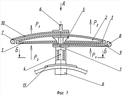 Устройство работает следующим образом. При совершении взлета воздушного судна производят включение двигателя 6 приводного диска 2, который начинает вращаться с определенной угловой скоростью , и при дальнейшем движении воздушного судна на аэродинамических поверхностях частей 9, 10 кожуха возникает подъемная сила P1, а на открытых поверхностях 3 приводного диска 2 за счет увеличения циркуляции воздушного потока В возникает дополнительная подъемная сила Р2, значительно большей величины по сравнению с подъемной силой при обтекании 9 и 10 частей кожуха. Суммарная подъемная сила сокращает время взлета воздушного судна и его отрыв от поверхности земли.