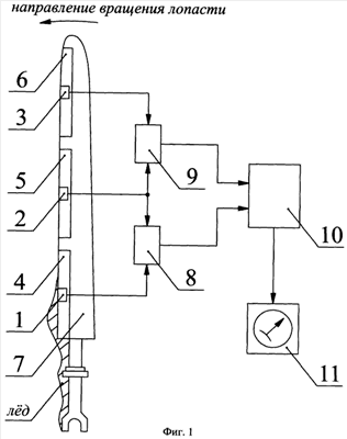 С помощью термочувствительных элементов 1, 2 и 3 (фиг.1) фиксируют величины аэродинамического нагрева передних поверхностей комлевой 4, средней 5 и концевой 6 секций лопасти 7. Затем значения температур торможения воздушного потока комлевой 4 и средней 5 секций, а также средней 5 и концевой 6 секций сравнивают между собой с помощью компараторов 8 и 9.
