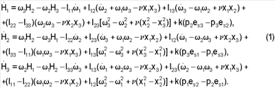 Ниже выписанные уравнения используются следующим образом. На некотором отрезке времени, длиной несколько часов, по телеметрической информации восстанавливается фактическое движение спутника относительно центра масс, в том числе его угловая скорость и угловое ускорение. В результате уравнения (1) станут замкнутой системой относительно переменных Нi (i=1, 2, 3). В этой системе величины Iij, рi будут рассматриваться как искомые параметры возмущающих моментов (гравитационного и от силы светового давления соответственно). Общее решение этих уравнений с явно однозначной его зависимостью от параметров и начальных условий представлено следующим образом
