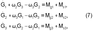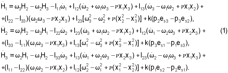 где Нi и j – компоненты собственного кинетического момента системы маховиков и угловой скорости ГСС. Теорема об изменении кинетического момента ГСС под действием указанных выше внешних моментов выражается соотношениями