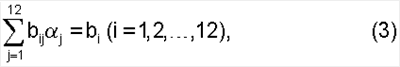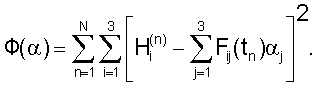Телеметрическое обеспечение системы маховиков позволяет в некоторые моменты времени tn (n=1, 2, …, N) измерять значения Hi(tn) компонентов ее собственного кинетического момента. Точность измерения кинетического момента маховиков ГСС “Ямал-200” составляет 0.1 Нмс. Результаты измерений этих величин обозначаются соответственно . Если указанные измерения приходятся на отрезок времени, для которого имеются значения кватерниона ориентации, то с помощью соотношений (2) их можно обработать каким-либо статистическим методом и определить вектор =( 1, 2, …, 12)Т. Поскольку вычисляемые по формулам (2) величины Hi(tn) зависят от линейно, наиболее подходящим в данном случае методом обработки является метод наименьших квадратов. В рамках этого метода оценкой вектора служит его значение, минимизирующее функцию
