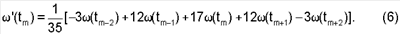 Для уменьшения случайных ошибок при определении значений угловой скорости спутника используется процесс сглаживания, основанный на применении метода наименьших квадратов. Предполагается, что измеренные значения угловой скорости имеют одинаковую точность и функция (t) на участке измерений может быть достаточно хорошо описана многочленом третьей степени. В результате по наблюдаемым значениям функции в точках измерений методом наименьших квадратов построен многочлен третьей степени, описывающий функцию и значениями этой функции считают значения полученного многочлена в точках tm. Вычисление выполняется по четырем точкам с использованием следующего выражения