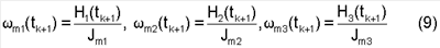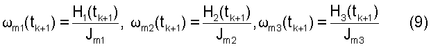 Полученные значения (9) в бортовой вычислительной машине (БЦВМ) сравниваются с текущими значениями угловой скорости маховиков m1(tk), m2(tk), m3(tk)