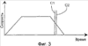 На фиг.3 показан традиционный профиль скорости в зависимости от времени для относительно длинного шагового передвижения. Полотно 1 сначала приводят в движение в фазе ускорения, чтобы затем перейти к фазе постоянной скорости, чтобы, наконец, затормозить и вернуться к неподвижному положению. Как очевидно из фиг.3, отверстие 9 обнаружено и подает сигнал С, который обозначает прохождение первого края С1 и второго края С2 отверстия. Первый и второй края отслеживаются и передаются в виде сигнала в устройство управления. Эти сигналы представлены на фиг.3 двумя вертикальными линиями С1, С2.