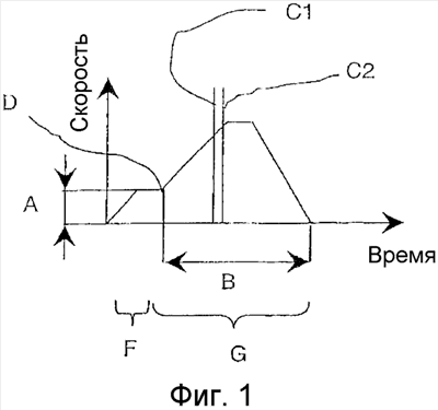 Фиг.1 – профиль скорости в зависимости от времени для сравнительно короткого шага передвижения;