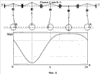 Параметру К=0, что наблюдается при d+r=с, соответствует геометрически симметричный режим (фиг.3), при котором механизм генерирует гармоническую вибрационную силу, лотки за один оборот диска совершают два равноамплитудных колебания и транспортирование материала отсутствует. В этом режиме на графике зависимости перемещения лотка по горизонтальной оси от угла поворота пальца (продемонстрированы два колебания, совершаемые за один оборот диска и при которых верхняя точка штока будет попеременно находиться в крайнем верхнем и нижнем положениях на равном расстоянии над и под горизонтальной осью, проходящей через точки крепления тяг к стойкам (ось O-O на фигурах 2-7).