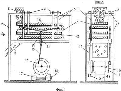 Двигатель 10 сообщает вращательное движение диску 11 с пальцем 12, имеющим относительно оси диска эксцентриситет b, при этом вращательное движение диска 11 посредством шатуна 13 преобразуется в возвратно-поступательное вертикальное движение штока 14, фиксируемое вертикальной гильзой 15. Шток 14 посредством тяг 16 передает возвратно-поступательное движение секциям 3 и 4 плоских горизонтальных лотков 1. При этом тяги 16 преобразуют возвратно-поступательное вертикальное движение штока в горизонтальные возвратно-поступательные движения секций лотков. Секции лотков благодаря их подвеске на ползунах 6, установленных в раме 7, имеют возможность перемещения только в горизонтальной плоскости. При этом секции 3 и 4 колеблются в противофазе. Благодаря этому материал 2, подлежащий транспортированию, перемещается от одного конца горизонтального плоского лотка к другому и пересыпается на нижерасположенный горизонтальный плоский лоток, принадлежащий другой секции, которая совершает противофазные колебания и перемещает материал в направлении, противоположном вышерасположенному горизонтальному плоскому лотку.