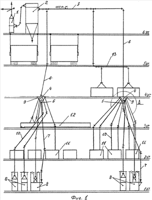 В частности, при размещении технологического оборудования в 6-этажном здании, при стандартной высоте каждого этажа, коллектор-сборник 4 целесообразно установить на потолке 3 этажа (фиг.1).