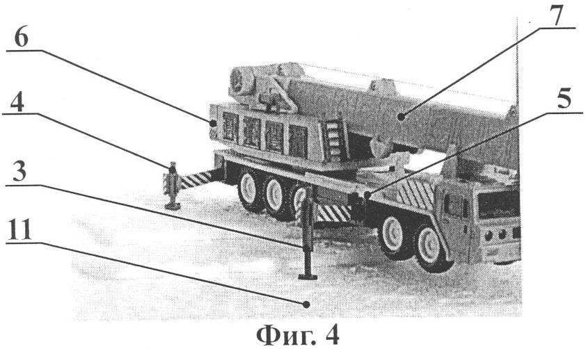 На фигуре 4 представлен макет автомобильного крана в вывешенном положении над котлованом, у которого передняя правая опора снабжена гидроцилиндром вывешивания с ходом поршня большим, чем ходы поршней других гидроцилиндров вывешивания.