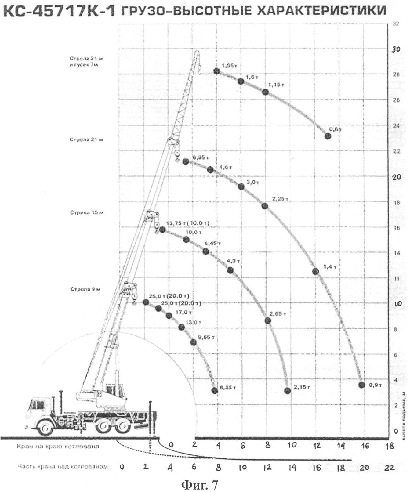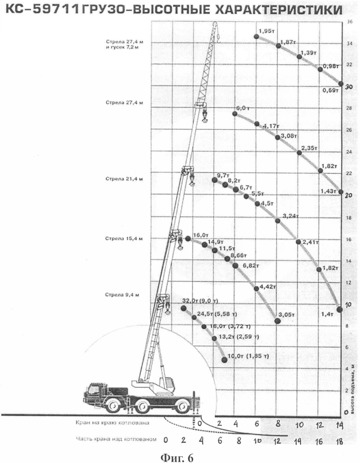 Сравнительный анализ грузо-высотных характеристик крана КС-59711, вывешенного на краю котлована, и крана, заявленного в изобретении, вывешенного частично над котлованом, показывает, что на большом вылете стрелы (при выдвинутых 3-х секциях стрелы) максимальная грузоподъемность увеличивается в 1.7 раза (с 1.4 т до 2.41 т), на среднем вылете стрелы (при выдвинутых 2-х секциях стрелы) грузоподъемность увеличивается в 2.2 раза (с 3.05 т до 6.82 т), на малом вылете стрелы (при втянутых секциях стрелы) грузоподъемность увеличивается в 2.4 раза (с 10 т до 24 т).