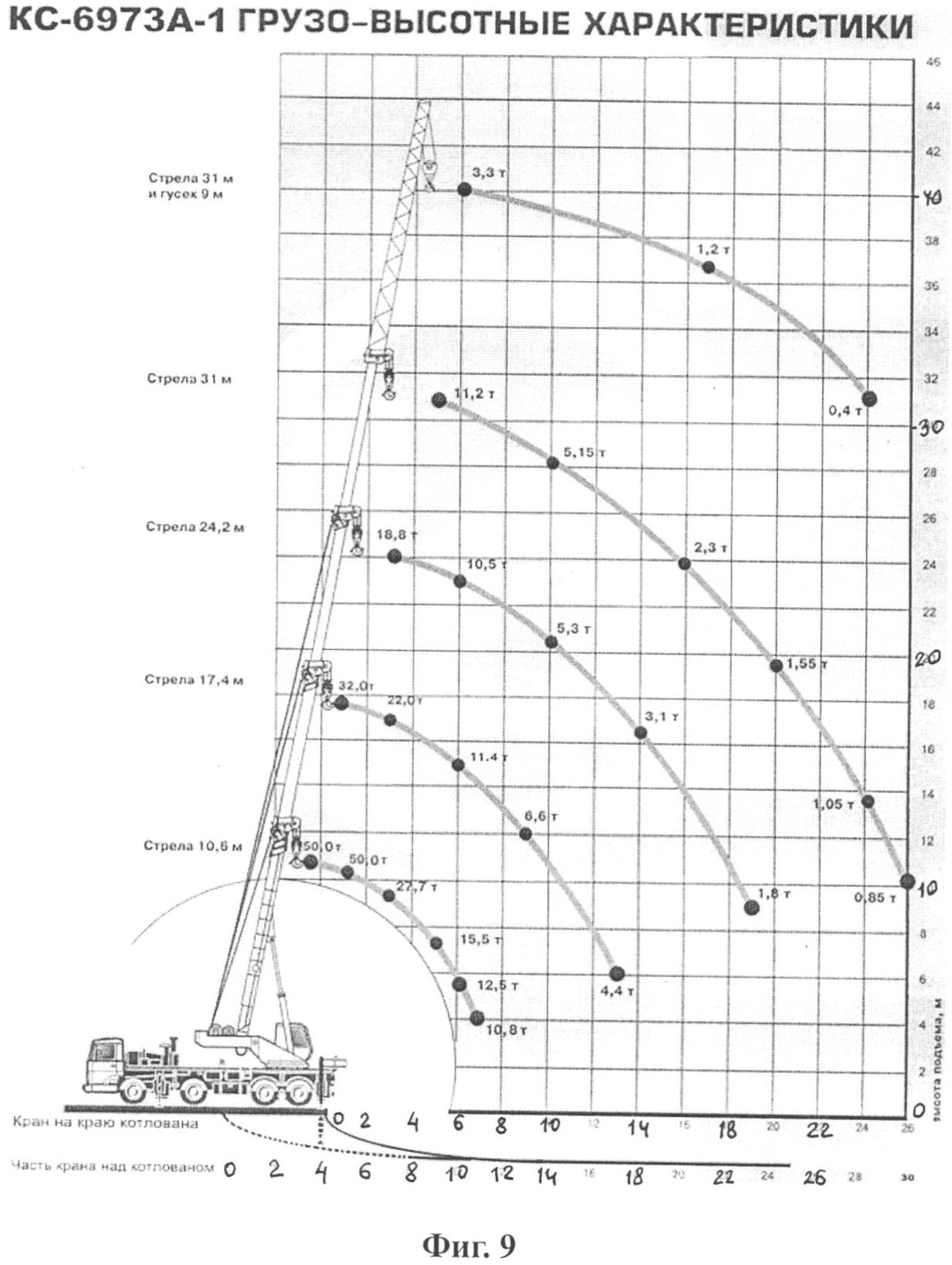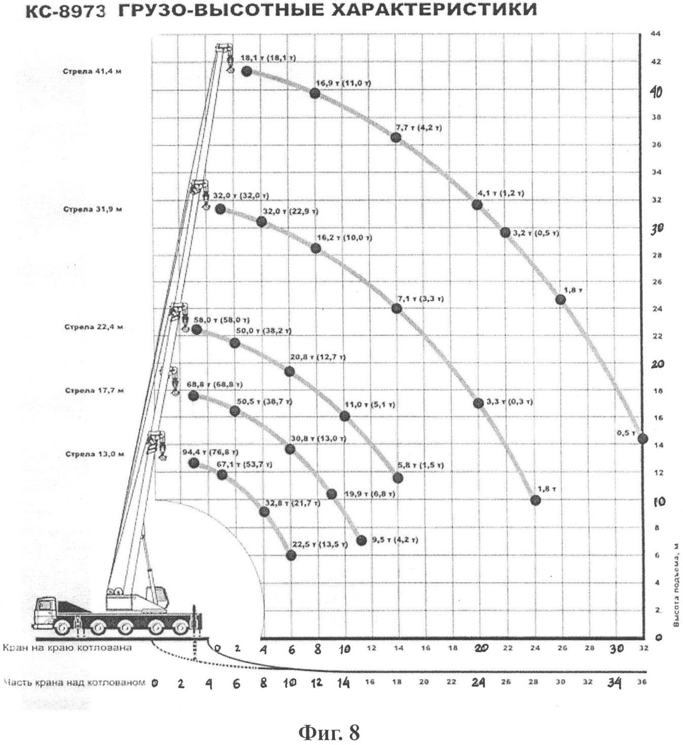 На фиг.7, фиг.8 и фиг.9 также представлены грузо-высотные характеристики кранов, в создании которых принимал участие «НИИ стреловых кранов». Показано, что вывешивание крана над котлованом по сравнению с вывешиванием крана на краю котлована приводит к существенному увеличению грузоподъемности на одних и тех же вылетах стрелы. Исследования показали, что в общем случае у двух задних гидроцилиндров ход поршня может быть больше ходов поршней других гидроцилиндров, а именно двух передних. Также, у двух гидроцилиндров правого борта ход поршней может быть больше ходов поршней других гидроцилиндров, а именно двух левого борта. Или у двух гидроцилиндров левого борта ходы поршней могут быть больше ходов поршней гидроцилиндров правого борта.