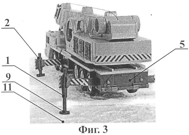 Ориентируют кран (как показано на фиг.5) таким образом, чтобы вертикальная плоскость, проходящая через центр вращения поворотного устройства, и опорный элемент гидроцилиндра вывешивания с большим ходом поршня совпадала с направлением наибольшего уклона рабочей площадки. Уровень рабочей площадки под подпятник гидроцилиндра с большим ходом поршня (большего гидроцилиндра) ниже уровней рабочих площадок под подпятники других гидроцилиндров.