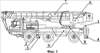 Опора 41 выдвигается из поперечной балки неповоротного устройства – направляющей для выносной опоры, которая расположена на ходовой раме под тем же углом 43, что и опора, а именно под большим углом к перпендикуляру к плоскости неповоротного устройства, чем остальные поперечные балки. В данном конструктивном решении именно угол наклона поперечной балки задает угол наклона выносной опоры. Поперечные балки – направляющие для других выносных опор располагаются на ходовой раме под меньшим углом 44, равным 90°.