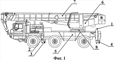 Сущность изобретения поясняется чертежами, где на фиг.1 изображен общий вид автомобильного крана в транспортном положении. Автомобильный кран содержит телескопическую стрелу 7, поворотное устройство 6, неповоротное устройство 5, выносные опоры с опорами вывешивания крана, которые выполнены в виде гидроцилиндров вывешивания 1, 2, 3 и 4. Гидроцилиндр вывешивания 1 выполнен длиннее других гидроцилиндров с ходом поршня, большим ходов поршней других гидроцилиндров 2, 3 и 4. На неповоротном устройстве 5 установлена опора поворотная 8, предназначенная для соединения неповоротного устройства крана с поворотным устройством.