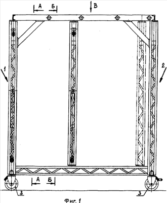 На продольных балках 6 и 7 с возможностью перемещения по ним установлена арка 8, выполненная в виде поперечины 9, на которой имеются опоры качения 10, установленные на продольных балках 6 и 7. Для исключения заклинивания арки при ее перемещении по продольным балкам на одной стороне поперечины имеется одна опора качения 10, а на другой – две опоры качения 10. К концам поперечины 9 пристыкованы две колонны 11 и 12. Поперечина 9, колонны 11 и 12 и образуют арку 8.