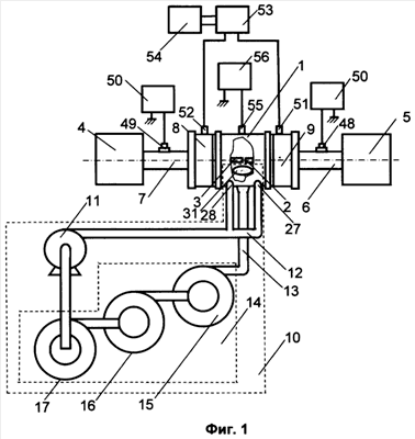 Способ производства фуллеренсодержащей сажи осуществляют следующим образом. В токовводы 8, 9 из узлов 4, 5 подают соответственно графитовые электроды 2 и 3. Материалом электродов 2 и 3 обычно служат круглые графитовые стержни диаметром 12 мм и длиной 400 мм. Производят откачку внутреннего объема камеры 1, системы 10 циркуляции инертного газа, внутренних полостей уплотнений Вильсона 39, 40 и камер 6, 7 до давления 4·10-2 Торр с использованием форвакуумного насоса, снабженного ловушкой с жидким азотом. Затем внутренний объем камеры 1 и системы 10 циркуляции инертного газа установки заполняют инертным газом или смесью инертных газов при давлении от 50 Торр до атмосферного (предпочтительнее до давления 100-300 Торр). В камерах 6, 7 через патрубки 45, 46 устанавливают динамическое давление инертного газа (предпочтительно аргона) от 0,1 до 10 Торр (предпочтительнее 1 Торр). На стенку 19 камеры 1 можно подавать напряжение положительной полярности 1-10 В от источника 56. На цилиндрические электроды 42 камер 6, 7 подают плюс источников 50 тлеющего разряда и зажигают тлеющий разряд с током от 1 до 100 мА (предпочтительнее 10 мА). Откачку внутренних полостей уплотнений Вильсона 40 производят непрерывно в течение всего процесса получения сажи. Включают газовый нагнетатель 11, при этом выходящий из сопел 27, 28 и 29, 30 инертный газ закручивается по обе стороны от межэлектродного зазора в два кольцевых потока. Подают охлаждающий агент в токовводы 8, 9 и в полости между стенками 19 и 20 крышками 21, 22 и фланцами 23, 24, а также в соответствующие полости циклона 15. На один из электродов 2 и 3 подают напряжение отрицательной полярности, а на другой – положительной полярности от источника 53 питания дугового разряда. В качестве источника питания может быть использован сварочный выпрямитель с устройством для реверса тока. Зажигают дуговой разряд между электродами 2, 3 и устанавливают рабочий режим горения (соответствующий ток разряда и расстояние между электродами 1,0-5,0 мм), наблюдая через смотровое окно 32. Включают один из узлов 4, 5 (например, узел 4) подачи соответственно графитовых электродов 2, 3 (например, электрода 2), задают необходимую для поддержания межэлектродного зазора постоянным скорость подачи и поступательно перемещают электрод 2, компенсируя его испарение в дуговом разряде. Одновременно можно вращать его со скоростью 0,2-3,0 об/мин (можно при этом вращать в другую сторону и электрод 3). Углерод, испарившийся с электрода 2, покидает зону дуги в радиальном направлении. Через определенное время (предпочтительно в интервале 2-30 мин) меняют полярность электродов 2 и 3 для испарения электрода 3, при этом останавливают узел 4 и включают узел 5. Время той или иной полярности горения разряда выбирают таким, чтобы не образовывался депозит на электродах 2, 3. После этого полярность вновь меняют, останавливают узел 5 и включают узел 4, и процесс повторяют. Так как электроды 2, 3 выполнены из графитовых стержней конечной длины, то по мере испарения электродов 2, 3 к их внешним торцам прикрепляют следующие графитовые стержни (с этой целью на одном конце каждого стержня выполняют, например, цилиндрический паз, а на другом конце – соответствующий этому пазу выступ). Таким образом, обеспечивают непрерывную работу устройства. Электроды 2, 3 в процессе своих перемещений, проходя через камеры 6, 7, могут обезгаживатьс