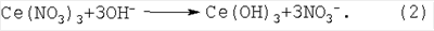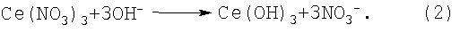 Электрохимический процесс, протекающий в катодной и анодной камерах электролизера, описывается итоговым уравнением реакций: Из этого уравнения следует, что продуктами электрогидролиза нитрата церия (III), протекающего в мембранном электролизере, являются: нанокристаллический диоксид церия и водород в катодной камере, а в анодной – кислород и раствор азотной кислоты. Существенные признаки заявленного изобретения, определяющие объем правовой охраны и достаточные для получения вышеуказанного технического результата, выполняют функции и соотносятся с результатом следующим образом. Использование анионообменной мембраны для разделения катодной и анодной камер препятствует миграции катионов водорода, образующихся в результате анодной электрохимической реакции (4), в катодную камеру, где в результате катодной реакции (1) генерируются гидроксил-ионы, что исключает их взаимную нейтрализацию, а также подкисление католита в результате реакции (5). Локализация гидроксил-ионов способствует достижению и стабилизации рН католита на уровне не менее 7,4 на протяжении всего гидролиза, что способствует повышению извлечения церия в осадок. Кроме того, анионообменная мембрана обеспечивает непрерывное удаление из катодной камеры выделяющихся в результате реакции (2) нитрат-ионов в анолит, где они с катионами водорода образуют азотную кислоту по реакции (5). Это значительно понижает возможность растворения осадка CeO2 с образованием в католите ионов церия (IV) и их обратного восстановления до церия (III) на катоде, приводящего к снижению выхода по току. Таким образом, использование анионообменной мембраны способствует повышению извлечения церия в конечный продукт, повышению выхода по току, получению азотной кислоты в виде индивидуального продукта и исключает использование дополнительного реагента – нитрата аммония. Использование в качестве анолита раствора азотной кислоты необходимо для повышения электропроводности водного раствора, что позволяет уменьшить расход электроэнергии на начальной стадии процесса. Поддержание плотности электрического тока в интервале 2,5-7,5 А/дм2 обеспечивает высокие технические показатели электрохимического процесса и необходимую дисперсность осадка. Понижение плотности тока способствует повышению выхода по току гидроксил-ионов, однако снижение плотности тока ниже 2,5 А/дм2 приводит к уменьшению скорости образования гидроксил-ионов и соответственно увеличению времени электролиза, а также к укрупнению кристаллитов осадка. Повышение плотности тока способствует получению осадков повышенной дисперсности и снижает возможность обратного восстановления церия (IV), однако превышение 7,5 А/дм2 в условиях возрастающего на катоде слоя осадка СеО2 с низкой электропроводностью приводит к повышенной катодной поляризации и соответственно перерасходу электроэнергии. Совокупность вышеуказанных признаков необходима и достаточна для достижения технического результата изобретения, заключающегося в повышении выхода церия по току, увеличении степени извлечения церия в конечный продукт, в утилизации азотной кислоты, содержащейся в нитрате церия, и ограничении числа используемых реагентов. Изобретение направлено также на снижение энергоемкости способа. В частных случаях осуществления изобретения предпочтите