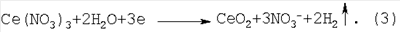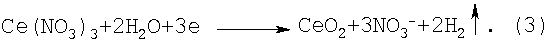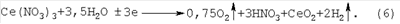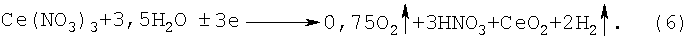 Выделившиеся нитрат-ионы под действием электрического тока мигрируют через анионообменную мембрану в анодное пространство к положительному электроду – аноду. Вследствие неустойчивости соединения Се(ОН)3 под влиянием электрического тока оно разлагается с образованием на катоде осадка СеО2 согласно реакции: В анодном пространстве разложение воды на аноде сопровождается выделением кислорода и катионов водорода: Освобождающиеся катионы водорода образуют в анолите азотную кислоту, объединяясь с нитрат-ионами, мигрирующими из катодного пространства через анионообменную мембрану, согласно реакции: