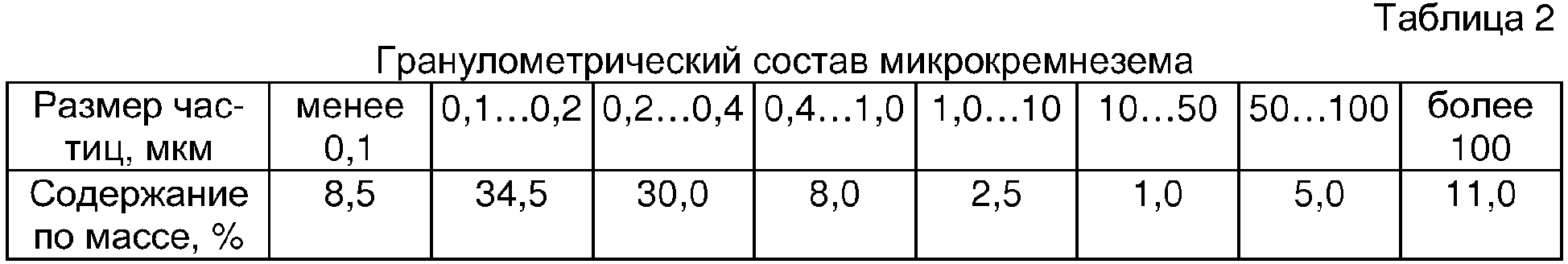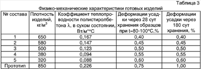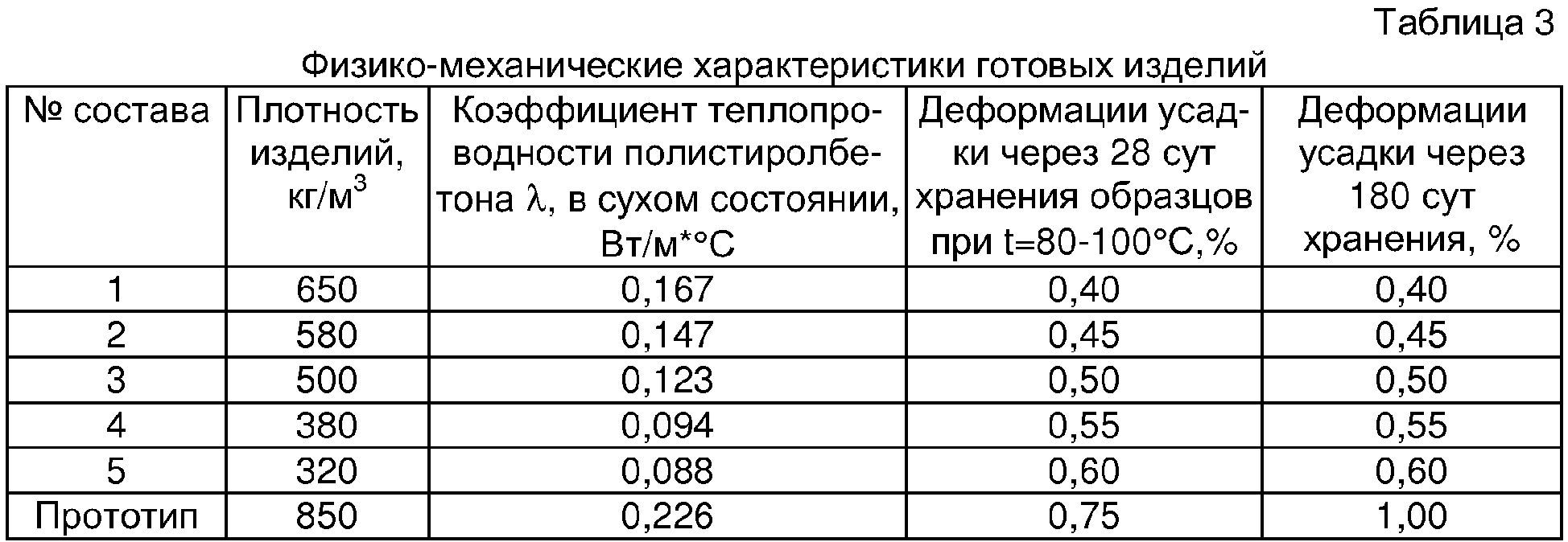 Гранулометрический состав микрокремнезема по данным технического паспорта отходов Братского завода ферросплавов представлен в табл.2. Пример. Методика приготовления формовочной смеси заключается в следующем. В стационарном аппарате-нагревателе при постоянном перемешивании реакционной смеси производят синтез жидкого стекла при температуре 85-95°С и атмосферном давлении. Перемешивание сырьевых компонентов смеси осуществляют в смесителе принудительного действия, в который сначала подают сухие материалы – пенополистирольный заполнитель, шамот, микрокремнезем и кремнефтористый натрий, перемешивают их в течение 2 мин, а затем добавляют жидкое стекло и производят окончательное перемешивание смеси в течение 5 мин до образования однородной консистенции. Физико-механические характеристики готовых изделий приведены в табл.3. При содержании жидкого стекла в смеси менее 62,5% повышается плотность изделий, но при этом значительно ухудшается удобоукладываемость формовочной смеси, что приводит к снижению прочностных показателей полистиролбетона и к увеличению коэффициента теплопроводности готовых изделий. Содержание жидкого стекла в смеси более 69,5% приводит к значительному снижению прочности полистиролбетона. Анализ данных табл.3 показывает, что предлагаемое техническое решение позволяет получать теплоизоляционные изделия плотностью 380-580 кг/м3, отличающиеся низкими значениями деформаций усадки и малым коэффициентом теплопроводности в сравнении с известным техническим решением. Снижение деформаций усадки разработанного материала происходит примерно в два раза по сравнению с прототипом, что объясняется упругостью частиц вторичного пенополистирольного заполнителя. Предлагаемое техническое решение позволяет эффективно использовать теплоизоляционный бетон с вторичным полистирольным заполнителем для изоляции несущих и ограждающих конструкций зданий от воздействия повышенных температур, связанных с эксплуатацией горячих трубопроводов и отопительных приборов. Например, для теплоизоляции дымоходов каминов и печей, междуэтажных перекрытий домов с печным отоплением, малогабаритных котельных, деревянных несущих стен.