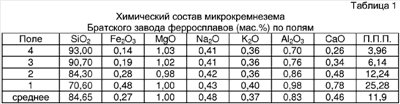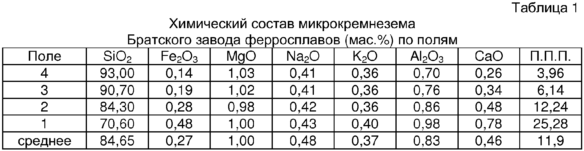 Повышение термостойкости материала, а также улучшение пожаробезопасности и огнестойкости конструкций с его применением достигается благодаря введению в состав смеси в качестве вяжущего натриевого жидкого стекла из микрокремнезема с силикатным модулем 2,5 и плотностью 1350 кг/м3 и введением тонкомолотого шамота в количестве 10% от массы жидкого стекла. Снижение усадочных деформаций, повышение прочностных характеристик и водостойкости теплоизоляционного бетона обеспечивается введением в состав смеси микрокремнезема, а также тонкомолотого шамота. В данной работе был использован микрокремнезем Братского завода ферросплавов состава, мас.%: SiO2 70,6-93; Al2О3 0,7-0,9; Fe2О3 0,14-0,48; Na2O 0,41-0,43; К2О 0,36-0,40; CaO 0,26-0,78; MgO 1,0-1,03. Химический состав микрокремнезема, улавливаемого разными полями электрофильтров, приведен в табл.1. Для приготовления формовочной смеси использовали пробу микрокремнезема (смесь 3 и 4 полей), характеризующуюся следующими показателями: