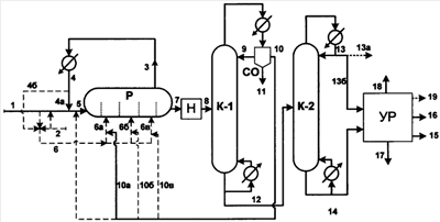 Из реакционной зоны Р по линии 7 выводят реакционную смесь, которую при необходимости нейтрализуют в аппарате «Н» и по линии 8 подают в ректификационную колонну К-1. Выводимый сверху К-1 паровой поток конденсируют, и в сепараторе-отстойнике СО отслаивают воду.