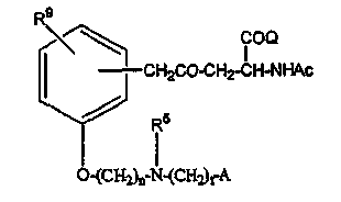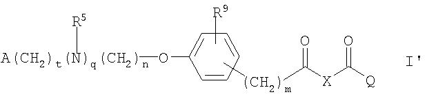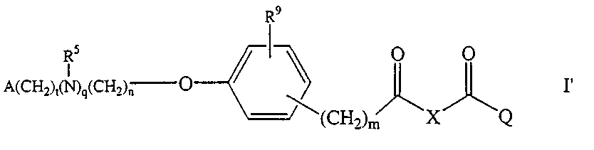 где n равно 1 или 2; m равно 0 или 1; q равно 0 или 1; t равно 0 или 1; R5 представляет собой алкил, содержащий от 1 до 3 атомов углерода; R9 представляет собой водород, галоген или алкокси, содержащий от 1 до 3 атомов углерода; A представляет собой фенил, незамещенный или замещенный 1 или 2 группами, выбранными из: галогена, алкила, содержащего 1 или 2 атома углерода, перфторметила, алкокси, содержащего 1 или 2 атома углерода, и перфторметокси; или циклоалкил, имеющий от 3 до 6 кольцевых атомов углерода, где циклоалкил является незамещенным, или один или два кольцевых углерода независимо являются монозамещенными метилом или этилом; или 5 или 6 членное гетероароматическое кольцо, содержащее 1 или 2 гетероатома в кольце, выбранных из N, S и O, и гетероароматическое кольцо ковалентно связано с остатком соединения формулы I через кольцевой атома углерода; и X представляет собой -CH2-, Q представляет собой -OR1, и R1 представляет собой этил; или X представляет собой -CH2CR12R13– или CH2CH(NHAc)-, где каждый из R12 и R13 независимо представляет собой водород или метил, Q представляет собой OR1, и R1 представляет собой водород или алкил, содержащий от 1 до 7 атомов углерода; или X представляет собой -CH2CH2-, и Q представляет собой NR10R11, где один из R10 и R11 представляет собой водород, алкил, содержащий от 1 до 3 атомов углерода, или гидрокси, а другой представляет собой водород или алкил, содержащий от 1 до 3 атомов углерода; или когда R1 представляет собой водород, фармацевтически приемлемую соль соединения.