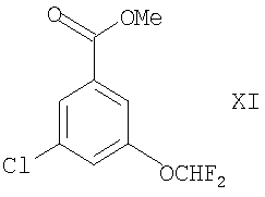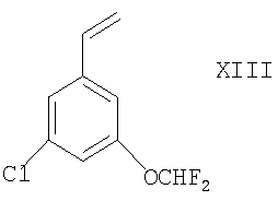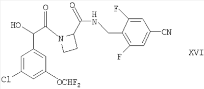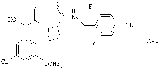 в присутствии подходящего дигидроксилирующего агента (например, реагента или смеси реагентов, дающих OsO4, таких как AD-mix- Соединение формулы XIII можно получать взаимодействием соответствующего соединения формулы X, как оно определено здесь ранее, с подходящим источником винильного аниона (например, трибутил(винил)оловом) в условиях, известных специалистам в данной области, например при температуре между комнатной и температурой флегмы (например, 50°С) в присутствии соответствующего растворителя (например, толуола), подходящего агента сочетания (например, координационного комплекса палладия(0), такого как тетракис(трифенилфосфин)палладий(0)) и, возможно, в присутствии подходящего катализатора (например, 2,6-ди-трет-бутил-4-метилфенола). Соединения формул V, VII, VIII, X, XI, XII и азетидин-2-карбоновая кислота либо имеются в продаже, либо известны из литературы, либо их можно получать по аналогии с описанными здесь способами или общепринятыми синтетическими процедурами в соответствии со стандартными методиками из легкодоступных исходных материалов с использованием соответствующих реагентов и реакционных условий. Соединения формулы XVI можно получать способами, описанным здесь ниже. Заместители по фенильному кольцу в соединениях формул I, II, III, IV, V, VI, IX, X, XI, XII и XIII можно вводить с использованием методик, хорошо известных специалистам в данной области, посредством стандартных взаимопревращений функциональных групп в соответствии со стандартными методиками, из легкодоступных исходных материалов с использованием соответствующих реагентов и реакционных условий. Например, соединения формул I, II, IV, VI, X, XI и XII могут быть получены из соединений, соответствующих тем соединениям, в которых вместо группы -OCH2F присутствует группа -ОН (ниже именуемых как “релевантные фенольные соединения-предшественники”), например, посредством взаимодействия такого релевантного фенольного соединения-предшественника с соответствующим фторированным галогеноалканом (таким как ClCHF2), например, при комнатной или более высокой температуре (например, при температуре флегмы) в присутствии подходящего основания (например, трет-бутилата калия, KOH или NaOH, например, в водном растворе) и соответствующего органического растворителя (например, THF, хлороформа или изо-пропанола), например, как описано здесь ниже. Специалисту должно быть понятно, что такие трансформации функциональных групп можно также проводить на более ранней стадии всего синтеза соединений формул II, IV, VI, X, XI или XII (то есть на соответствующих предшественниках релевантных фенольных соединений-предшественников). Релевантные фенольные соединения-предшественники либо имеются в продаже или известны из литературы, либо могут быть получены по аналогии с описанными здесь способами или посредством общепринятых синтетических процедур в соответствии со стандартными методиками, из легкодоступных исходных материалов при использовании соответствующих реагентов и реакционных условий. Например, релевантные фенольные соединения-предшественники могут быть получены снятием защиты с соответствующих защищенных фенолов (у которых защитной группой может быть, например, метил, аллил, бензил или трет-бутил) в стандартных условиях. Соединения формулы I можно выделять из их реакционных смесей с помощью общепринятых м