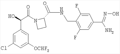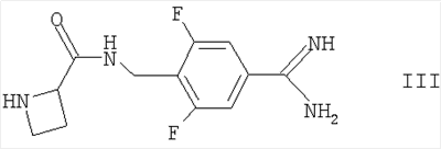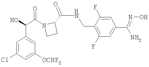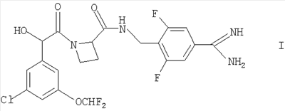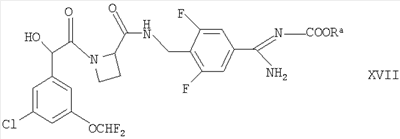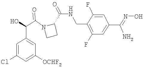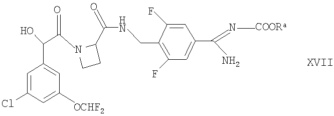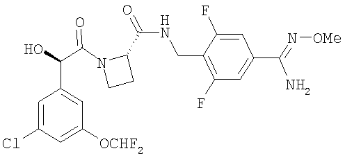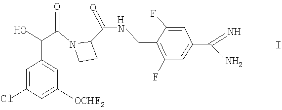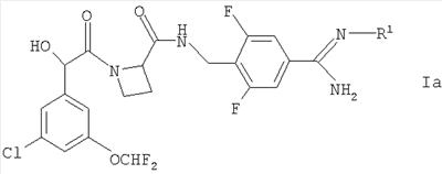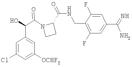 находится в R-конфигурации. Волнистые линии на связях в двух вышеуказанных фрагментах обозначают положения связывания этих фрагментов. Таким образом, предпочтительные соединения по изобретению включают в себя Ph(3-Cl)(5-OCHF2)-(R)CH(OH)C(O)-(S)Aze-Pab(2,6-diF), Ph(3-Cl)(5-OCHF2)-(R)CH(OH)C(O)-(S)Aze-Pab(2,6-diF)(OMe) и Ph(3-Cl)(5-OCHF2)-(R)CH(OH)C(O)-(S)Aze-Pab(2,6-diF)(OH). Специалисты должны понимать, что в способах, описанных здесь выше и далее, функциональные группы промежуточных соединений могут нуждаться в защите защитными группами. Функциональные группы, которые желательно защищать, включают в себя гидрокси, амино и карбоновую кислоту. Подходящие защитные группы для гидрокси включают в себя возможно замещенные и/или ненасыщенные алкильные группы (например, метил, аллил, бензил или трет-бутил), триалкилсилильные или диарилалкилсилильные группы (например, трет-бутилдиметилсилил, трет-бутилдифенилсилил или триметилсилил) и тетрагидропиранил. Подходящие защитные группы для карбоновой кислоты включают в себя C1-6алкиловые или бензиловые сложные эфиры. Подходящие защитные группы для амино и амидино включают в себя трет-бутилоксикарбонил, бензилоксикарбонил или 2-триметилсилилэтоксикарбонил (Теос). Атомы азота в амидино также могут быть защищены гидрокси- или алкоксигруппами, и эти атомы могут быть защищенными как однократно, так и двукратно. Защита функциональных групп и снятие защиты с них может иметь место до или после сочетания либо до или после любой другой реакции в вышеуказанных схемах. Защитные группы можно удалять в соответствии с методиками, которые хорошо известны специалистам, и как описано здесь ниже. Специалисты должны понимать, что для получения соединений по изобретению альтернативным или, в некоторых случаях, более удобным образом упомянутые здесь выше индивидуальные стадии способов можно осуществлять в ином порядке, и/или индивидуальные реакции можно проводить на иной стадии всего пути (то есть можно осуществлять введение заместителей и/или химические трансформации с иными промежуточными соединениями, чем вышеуказанные в связи с конкретной реакцией). Это может исключать или создавать необходимость в потребности в защитных группах. Тип вовлеченной химии будет диктовать потребность в защитных группах и их тип, а также последовательность выполнения синтеза. Применение защитных групп полностью описано в “Protective Groups in Organic Chemistry”, edited by J W F McOmie, Plenum Press (1973) и в “Protective Groups in Organic Synthesis”, 3rd edition, T.W.Green & P.G.M. Wutz, Wiley-Interscience (1999). Защищенные производные соединений по изобретению можно превращать химическим путем в соединения по изобретению, используя стандартные методики снятия защиты (например, гидрогенизацию). Специалист также должен понимать, что некоторые соединения формулы Ia можно также обозначать как представляющие собой “защищенные производные” соединений формулы I. Медицинское и фармацевтическое применение Соединения по изобретению могут обладать фармакологической активностью как таковые. Соединения по изобретению, которые могут обладать такой активностью, включают в себя соединения формулы I, но не ограничены ими. Однако другие соединения по этому изобретению (в том числе соединения формулы Ia) могут не обладать такой активностью, но их можно вводить парентерально или перорально, после чего они в организме могут быть метаболизированы с образованием соединен