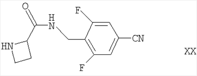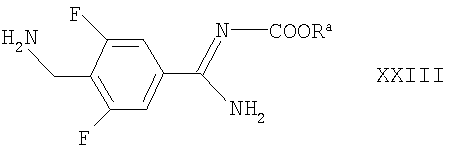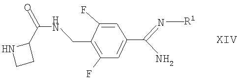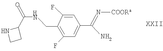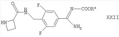 например, в условиях, аналогичных описанным здесь ранее для синтеза соединений формулы I. Соединения формулы XVII могут быть получены взаимодействием соответствующего соединения формулы II, как определено здесь ранее, с соединением формулы XXII где Ra такие, как определено здесь выше, например, в условиях, аналогичных описанным здесь ранее для синтеза соединений формулы I. Альтернативно соединения формулы XVII могут быть получены взаимодействием соответствующего соединения формулы I с соединением, соответствующим соединению формулы XIX, в которой вместо R3 присутствует группа Ra, причем Ra является такой, как определено выше, например, в условиях, описанных выше в отношении получения соединений формулы Ia. Соединения формул XIV и XXII могут быть получены взаимодействием азетидин-2-карбоновой кислоты с соответственно соединением формулы XV, как оно определено выше, или соединением формулы XXIII где Ra такой, как определено выше, например, в условиях, аналогичных описанным здесь ранее для синтеза соединений формулы I. Соединения формулы XV, XVIII, XIX, XX, XXI и XXIII либо имеются в продаже или известны из литературы, либо могут быть получены по аналогии с описанными здесь способами или общепринятыми синтетическими процедурами в соответствии со стандартными методиками, из легкодоступных исходных материалов, используя соответствующие реагенты и реакционные условия. Например, соединения формулы XX могут быть получены взаимодействием соответствующего соединения формулы XXI с азетидин-2-карбоновой кислотой, например, в условиях, аналогичных описанным здесь ранее. Соединения формул I и Ia, как они определены здесь выше, и их производные обозначены здесь ниже как “соединения по изобретению”. Соединения по изобретению могут проявлять таутомерию. Все таутомерные формы и их смеси включены в объем этого изобретения. Конкретные таутомерные формы, которые можно упомянуть, включают в себя таутомерные формы, связанные с положением двойной связи в амидиновой функциональной группе в соединении формулы Ia и с положением заместителя R1. Соединения по этому изобретению также содержат два или более асимметричных атома углерода и поэтому могут проявлять оптическую изомерию и/или диастереоизомерию. Диастереоизомеры могут быть разделены общепринятыми методиками, например хроматографией. Разные стереоизомеры можно выделять разделением рацемической или иной смеси этих соединений общепринятыми методиками, например посредством ВЭЖХ. Альтернативно желаемые оптические изомеры можно получать взаимодействием соответствующих оптически активных исходных материалов в условиях, которые не должны вызывать рацемизацию или эпимеризацию, или дериватизацией, например, гомохиральной кислотой, с последующим разделением диастереомерных производных общепринятыми средствами (например, ВЭЖХ, хроматографией на диоксиде кремния). Все стереоизомеры включены в объем этого изобретения. Предпочтительными являются соединения, у которых фрагмент