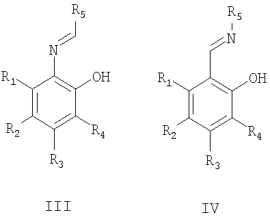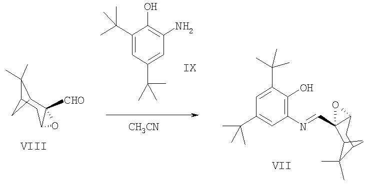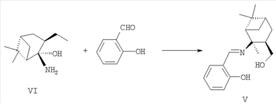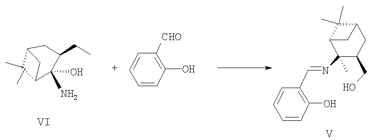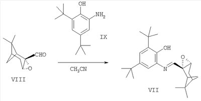 причем заместители R1, R2, R3, R4 могут быть одинаковы или отличаться и могут быть атомом водорода, алкильной группой (в том числе, содержащей атомы галогена), алкоксигруппой (в том числе, содержащей атомы галогена), нитрогруппой, диалкиламиногруппой, галогеном; R5 – оптически активный заместитель; при пониженной температуре (предпочтительно 0-10°С) в органическом растворителе (предпочтительно толуоле) с возможным присутствием органического основания (предпочтительно N,N-диизопропилэтиламина). Комплекс соли ванадия с хиральным основанием Шиффа может применяться в каталитических количествах (предпочтительно 1 мольный % по отношению к окисляемому сульфиду II). Образующийся в процессе реакции продукт может выделяться фильтрацией или экстракционной методикой. Хиральные основания Шиффа, описываемые общими формулами III или IV, могут быть синтезированы, например, взаимодействием салицилового альдегида или его производных с оптически активными аминами или взаимодействием 2-аминофенола или его производных с оптически активными альдегидами [Bolm С., Schlingloff G., Bienewald F. J. Mol. Cat. A: Chem. 1997, 117, 347; Хоменко Т.М., Саломатина О.В., Курбакова С.Ю., Ильина И.В., Волчо К.П., Комарова Н.И., Корчагина Д.В., Салахутдинов Н.Ф., Толстиков А.Г. ЖОрХ, 2006, 42, 1666]. Применение приведенной выше окислительной системы, включающей в себя органическую перекись в качестве окислителя, комплекс соли ванадия с хиральным основанием Шиффа и, при необходимости, органическое основание, для получения оптически активных дигетарилсульфоксидов не описано. Предлагаемый способ получения оптически активного соединения I с использованием в качестве катализатора окисления устойчивого в присутствии воды комплекса соли ванадия с хиральным основанием Шиффа позволяет проводить реакцию без создания специальных условий (определенной влажности, использования инертной атмосферы) на всех стадиях процесса, использовать комплекс соли ванадия с хиральным основанием Шиффа в каталитических количествах, а также упрощает обработку реакционной смеси. Изобретение иллюстрируется следующими примерами. Пример 1. Синтез лиганда 2-(((1S,2S,3R,5S)-3-гидроксиметил-2,6,6-триметилбицикло[3.1.1]гептан-2-илимино)метил)фенола V. Синтез ((1R,2R,3S,5R)-2-амино-2,2,6-триметилбицикло[3.1.1]гептан-3-ил)метанола VI проводили в соответствии с методикой, опубликованной в работе Szakonyi Z., Martinek Т., Hetenyi A. Tetrahedron [Asymmetry. 2000, 11, 4571]. В стеклянный реактор с магнитной мешалкой поместили раствор 0.050 г (0.27 ммоль) соединения VI в 4 мл абсолютного метанола и при перемешивании прибавили 0.033 г (0.27 ммоль) 2-гидроксибензальдегида в 5 мл метанола. Реакционную смесь перемешивали при комнатной температуре в течение 6 ч. Получили 0.078 г 2-(((1S,2S,3R,5S)-3-гидроксиметил-2,6,6-триметилбицикло[3,1.1]гептан-2-илимино)метил)фенола V (100%), Пример 2. Синтез лиганда 4,6-ди-трет-бутил-2-((7,7-диметил-3-оксатрицикло[4.1.1.02,4]окт-2-ил)метиленамино)-фенола VII. К раствору 0.023 г (0.1 ммоль) 2-амино-4,6-ди-трет-бутилфенола IX в 2 мл ацетонитрила при 25°С и перемешивании в атмосфере аргона прибавили раствор 0.022 г (0.13 ммоль) эпоксида миртеналя VIII, полученного в соответствии с методикой [Хоменко Т.М., Саломатина О.В., Курбакова С.Ю., Ильина И.В., Волчо К.П., Комарова Н.И., Корчагина Д.В., Салахутдинов Н.Ф., Толстиков А.Г. ЖОрХ, 2006, 42, 1666], в 0.8 мл ацетонитрила, перемешивание продолжали 0.5 ч. Растворитель отогнали. Получили 0.037 г (96%) 4,6-ди-трет-бутил-2-((7,7-