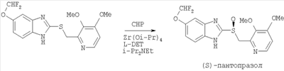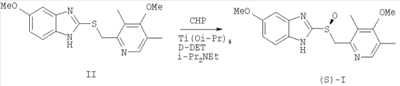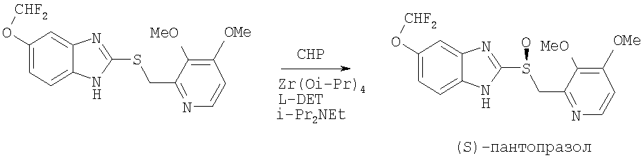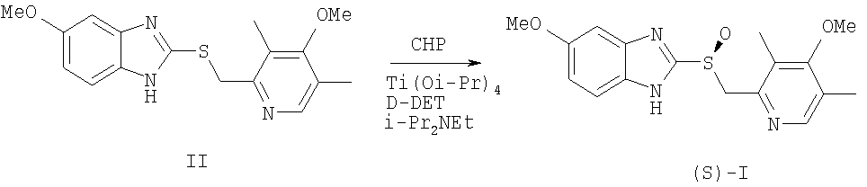 Изобретение относится к области химии лекарственных средств, а именно к получению оптически активного 5-метокси-2-((4-метокси-3,5-диметилпиридин-2-ил)метилсульфинил)-1Н-бензо[d]имидазола общей формулы I, проявляющего противоязвенную активность. Эзомепразол ((S)-I), современный высокоэффективный противоязвенный препарат, является (S)-энантиомером омепразола и значительно превосходит последний по клиническому эффекту [Лапина Т.Л. Клиническая фармакология и терапия, 2002, 11, №2]. Единственным доступным методом получения эзомепразола ((S)-I) до 1996 г. было разделение рацемической смеси [Erlandsson P., Isaksson R., Lorentzon P., Lindberg Р. J. Chromatogr. 1990, 532, 305; Kohl В., Senn-Bilfinger J. DE 4035455 (1990); Lindberg P., von Unge, S. WO 9427988 (1994); Deng J., Chi Y., Fu F, Cui X., Yu K., Zhu J., Jiang Y. Tetrahedron: Asymmetry, 2000, 11, 1729]. В 1996 г. был предложен способ энантиоселективного окисления 5-метокси-2-((4-метокси-3,5-диметилпиридин-2-ил)метилтио)-1H-бензо[d]имидазола (II) в эзомепразол ((S)-I) [Larsson E.M., Stenhede U.J., Sorensen Н., von Unge Р.О.S., Cotton H.К. WO 9602535 (1996)], включавший в себя приготовление каталитического комплекса изопропилата титана (IV), D-диэтилтартрата (D-DET) и воды в присутствии сульфида (II), выдерживание полученного каталитического комплекса при повышенной температуре (до добавления окислителя), проведение реакции в присутствии аминов, предпочтительно N,N-диизопропилэтиламина, в качестве окислителя использовался гидропероксид кумола (СНР), а растворителя – толуол, катализатор использовался в количестве 30 мольных % (схема 1). После обработки (экстракция водным раствором аммиака, подкисление водного слоя уксусной кислотой, экстракция метилизобутилкетоном), получения натриевой соли и перекристаллизации из ацетонитрила был получен эзомепразол ((S)-I) с выходом до 55%. Аналогично могут быть получены и другие родственные эзомепразолу оптически активные дигетарилсульфиды. Схема 1. Дальнейшие исследования в этой области в основном сосредоточились на изменениях в обработке реакционной смеси с целью повышения чистоты получаемого продукта и практически не затрагивали стадии энантиоселективного окисления [Hashimoto H., Maruyama H. WO 2001087874 (2001); Hashimoto H., Urai T. WO 2001083473 (2001)]. В патенте Kawada M., Yamano Т., Тауа N. [WO 2001014366 (2001)] к реакционной смеси были дополнительно добавлены молекулярные сита 3 Å. Замена хирального диола D-DET на монодентантный лиганд – метиловый эфир (S)-(+)-миндальной кислоты, также позволила получить эзомепразол ((S)-I), но со значительно меньшим выходом [Thennati R., Rehani R.B., Soni R.R., Chhabada V.C., Patel V.M. WO 2003089408 (2003)]. Аналог эзомепразола, (S)-пантопразол (схема 2), был синтезирован асимметрическим окислением соответствующего сульфида с помощью СНР в присутствии каталитического комплекса Zr(Oi-Pr)4 и L-DET, а также N,N-диизопропилэтиламина с выходом 80% [Kohl В., Mueller В., Weingart R.S. WO 2004052881 (2004]). Схема 2. Все указанные способы получения эзомепразола ((S)-I) и его аналогов обладают существенными недостатками, стимулирующими поиски новых путей синтеза. Во-первых, использование систем на основе изопропилатов титана и циркония предъявляет повышенные требования к контролю за влажностью среды как при хранении и смешивании реагентов (изопропилаты титана и циркония неустойчивы в присутствии даже следов влаги), так и в процессе реакции, что не только усложняет аппаратное оформление процесса, но и может приводить к плохой воспроизводимости результатов; во-вторых, для воспроизводимого достижения высокой энантиоселективност