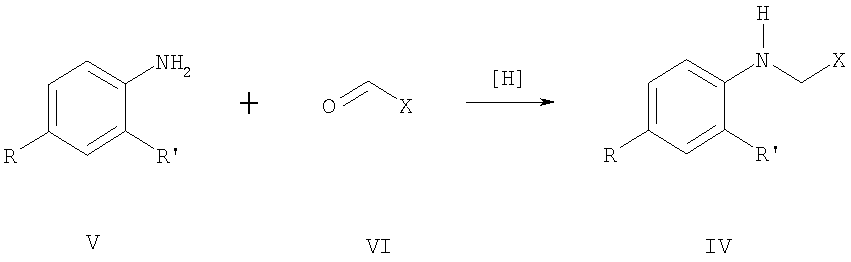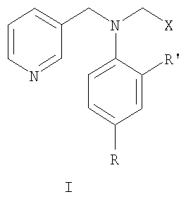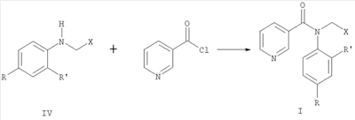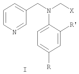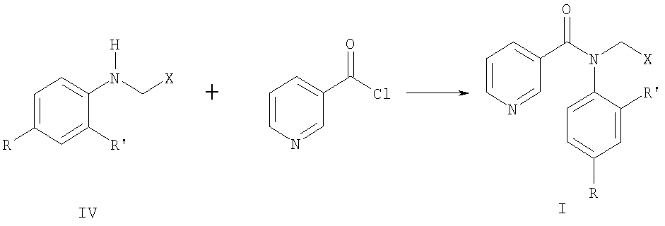 Наиболее близки по структуре к соединениям формулы I анилиды общей формулы III, где R означает алкил или циклоалкил, R’ означает циано-, нитро- или метоксикарбонильную группу, обладающие фунгицидной активностью [Пат. WO 95/25723, 1994]. Однако соединения структур II и III имеют узкий спектр действия и показывают фунгицидную активность только в отношении отдельных видов грибов. Кроме того, к фунгицидам у грибов часто развивается устойчивость. Техническая задача, решаемая настоящим изобретением, состоит в расширении ассортимента фунгицидов для более эффективной борьбы с вредоносными грибами. Поставленная задача решается получением замещенных анилидов никотиновой кислоты общей формулы I, обладающих фунгицидной активностью. Замещенные анилиды никотиновой кислоты общей формулы I могут быть получены взаимодействием замещенных анилинов общей формулы IV, где R, R’ и Х имеют те же значения, что и в формуле I, с хлорангидридом никотиновой кислоты: Аналогичные реакции описаны в литературе [Вейганд-Хильгетаг. Методы эксперимента в органической химии. – М.: Химия, 1968 г. – 944 с.]. Соединения общей формулы IV могут быть получены известными способами из анилинов общей формулы V, где R и R’ имеют те же значения, что и в формуле I, восстановительной конденсацией с альдегидами общей формулы VI, где Х имеет те же значения, что и в формуле I, в присутствии боргидрида натрия или муравьиной кислоты с последующим гидролизом полученного формамида, или восстановлением оснований Шиффа боргидридом натрия, алюмогидридом лития или водородом с использованием катализаторов: Аналогичные реакции описаны в литературе [Органикум: в 2-х т., пер. с нем. – М.: Мир, 1979]. Изобретение может быть проиллюстрировано следующими примерами. Пример 1. Раствор 4,28 г (0,04 моль) 2-пиридинкарбальдегида, 3,72 г (0,04 моль) свежеперегнанного анилина и каталитического количества n-толуолсульфокислоты в 36 мл толуола кипятили 6 ч с насадкой Дина-Старка, после чего растворитель отогнали в вакууме. К остатку прибавили 5,25 мл (0,13 моль) 93%-ной муравьиной кислоты и кипятили с обратным холодильником 15 ч, затем прибавили 50 мл 6N соляной кислоты, продолжали кипячение в течение 1,5 ч. Реакционную массу охладили, прибавили 50%-ной водный раствор гидроксида натрия до рН 12. Продукт экстрагировали хлороформом (3×20 мл), экстракт сушили над безводным сульфатом магния, растворитель отогнали в вакууме. Остаток перегоняли в вакууме, собирая фракцию с т.кип. 127-135°С (0,1 мм рт.ст.). После перекристаллизации из смеси гексан-толуол (4:1) получили 3,4 г (45%) N-(пирид-2-илметил)анилина в виде светло-желтых кристаллов с т.пл. 98-99°С. ЯМР 1Н-спектр ( Пример 2. К 1,91 г (15 ммоль) n-хлоранилина в смеси 75 мл тетрагидрофурана и 25 мл метанола прибавляли при 0°С раствор 3,17 г (17 ммоль) n-бромбензальдегида и 4,3 мл 3N серной кислоты в 15 мл тетрагидрофурана. Смесь перемешивали при 0°С 5 мин, затем прибавляли 1 г (26 ммоль) боргидрида натрия. Смесь выдерживали при комнатной температуре 10 мин и добавляли 30 мл воды. Добавляли гидроксид натрия до рН 9 и экстрагировали хлороформом (3×10 мл). Экстракт сушили над безводным сульфатом натрия, растворитель отгоняли в вакууме. Остаток перекристаллизовывали из 50%-ного этанола. Получили 2,64 г (60%) N-(4-бромбензил)-4-хлоранилина в виде желтых кристаллов с т.пл. 83-85°С. ЯМР 1Н-спектр ( Пример 3. К 0,68 г (3,8 ммоль) гидрохлорида хлорангидрида никотиновой кислоты в 1