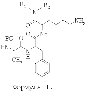 Изобретение относится к области медицины и может быть использовано в хирургической практике. Разработка средств борьбы с геморрагиями – актуальная задача современной медицины. Кровотечения могут явиться причиной летального исхода и тяжелых осложнений при родах, в условиях боевых действий, при совершении террористических актов, во время массовых катастроф, при различных отравлениях и др. Известно и получило широкое распространение в США и Европе средство, обладающее способностью останавливать кровотечение – Ghosh и др. [К. Ghosh, S. Shetty, F. Jijina, D. Mohanty, Haemophilia, 1, 58-62 (2004)] показали возможность успешного местного применения препаратов Большинство известных низкомолекулярных ингибиторов плазмина представляют собой производные аминокислот и их аналоги. Однако лишь немногие соединения обладают низкой токсичностью, что является основным требованием, предъявляемым к синтетическим фармакологическим препаратам. С этой точки зрения весьма перспективными являются пептидные ингибиторы, которые легко усваиваются в организме, превращаясь в нетоксичные производные. Однако для плазмина подобные пептидные ингибиторы неизвестны. Поскольку ранее показано, что пептидная последовательность -Ala-Phe-Lys- эффективно связывается с активным центром плазмина [Степанов В.М., Воюшина Т.Л., Терентьева Е.Ю., Мильготина Е.И., Неведрова О.Е., Макаров В.А., Коган А.Е. Патент РФ 2121690], именно она послужила нам основой для синтеза пептидных ингибиторов этого фермента. Возникает задача синтеза пептидных ингибиторов плазмина, имеющих в структуре плазмин-специфичную последовательность аминокислот. Задача решена путем создания и последующего применения новых синтетических пептидных производных формулы 1,