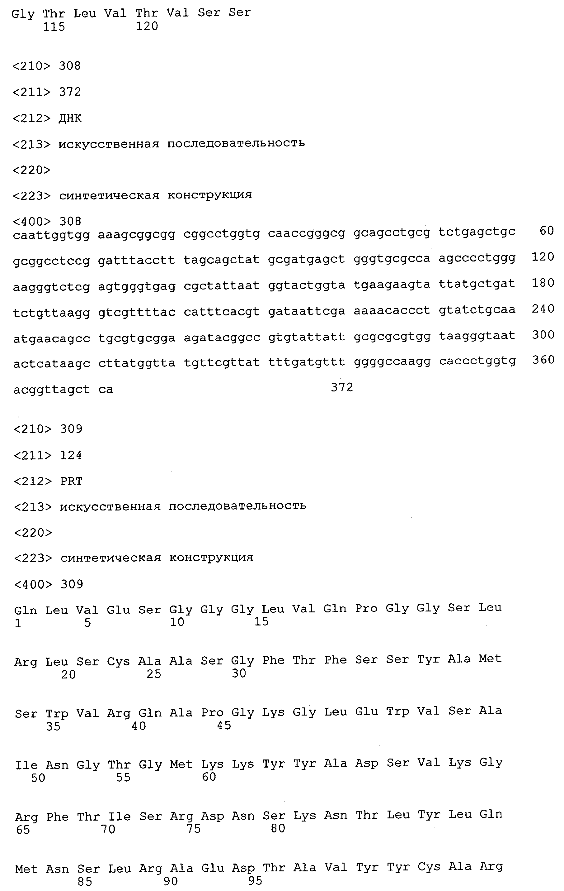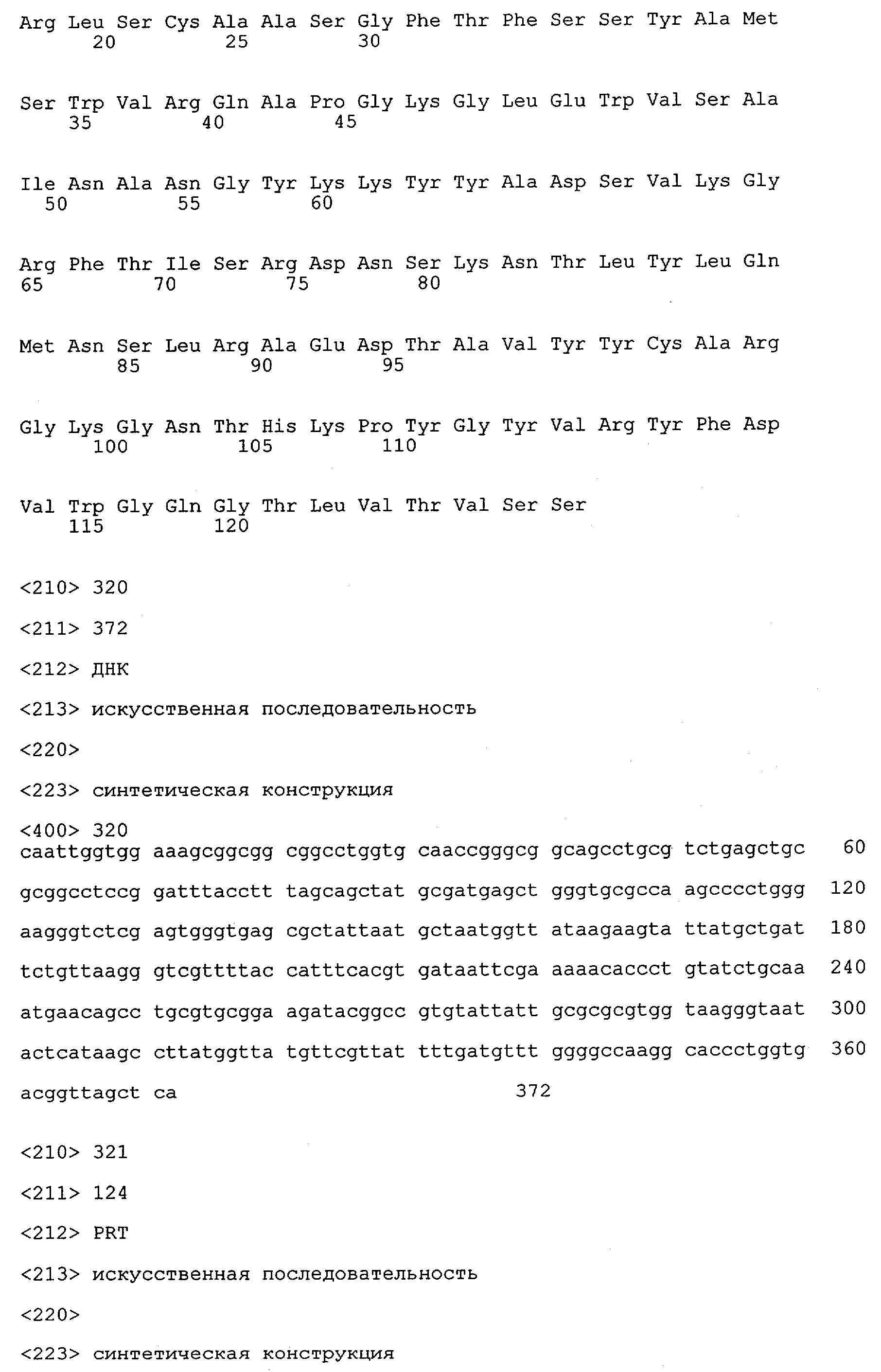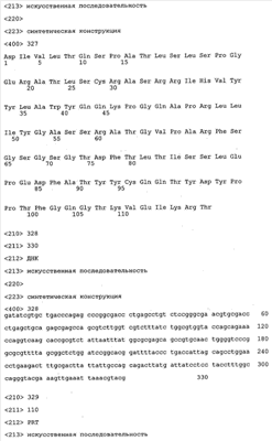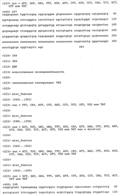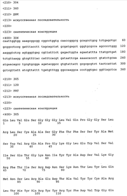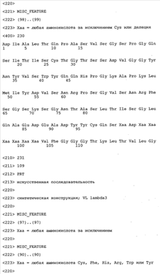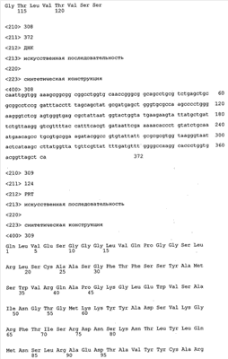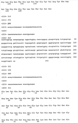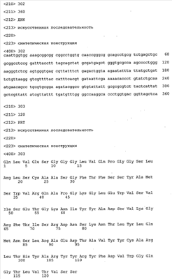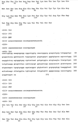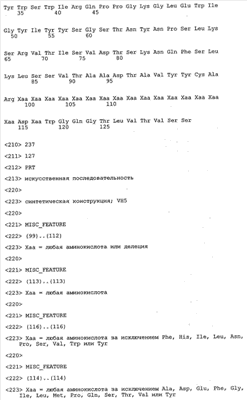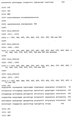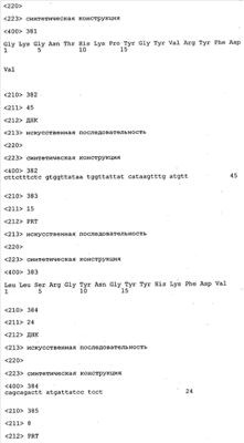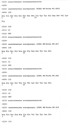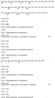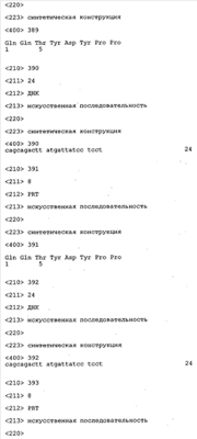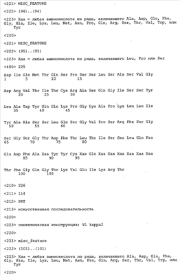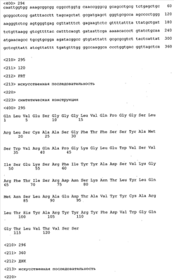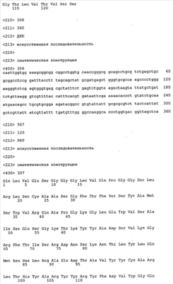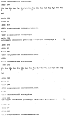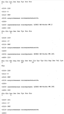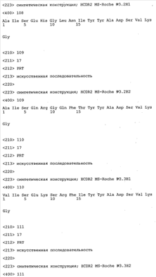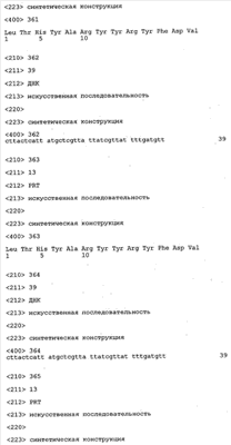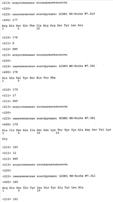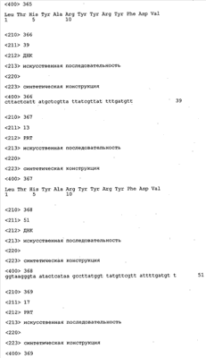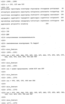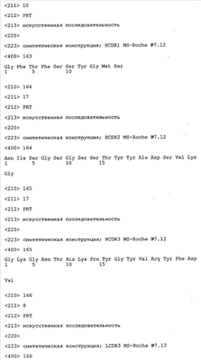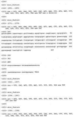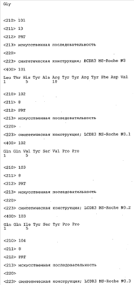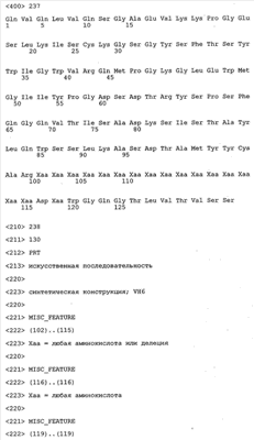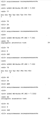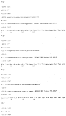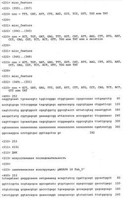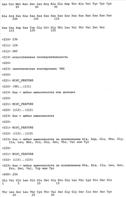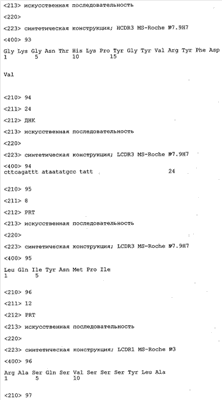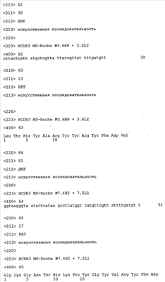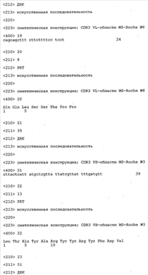 Согласно особенно предпочтительному варианту осуществления изобретения молекула антитела, предлагаемая в изобретении, содержит по меньшей мере один CDR3-участок VL-области, кодируемый молекулой нуклеиновой кислоты, которая представлена в SEQ ID NO:15, 17 или 19, или по меньшей мере один CDR3-участок аминокислотной последовательности VL-области, представленной в SEQ ID NO:16, 18 или 20, и/или указанная молекула антитела содержит по меньшей мере один СDR3-участок VH-области, кодируемый молекулой нуклеиновой кислоты, которая представлена в SEQ ID NO:21, 23 или 25, или по меньшей мере один СDR3-участок аминокислотной последовательности VH-области, представленный в SEQ ID NO:22, 24 или 26. Наиболее предпочтительными являются антитела, которые содержат по меньшей мере один СDR3-участок VH-области, представленный в настоящем описании. Указанные выше CDR3-участки родственны участкам предлагаемых в настоящем изобретении, приведенных в качестве иллюстрации родительских молекул антител MSR-3, -7 или -8. Однако, как проиллюстрировано ниже в таблицах 1, 8 или 10, созревшие и/или оптимизированные молекулы антител, получаемые с помощью методов, которые описаны ниже в примерах, могут содержать модифицированные CDR1-, CDR2- и СDR3-участки VH-, VL-областей. Таким образом, молекулу антитела, предлагаемую в изобретении, предпочтительно выбирают из ряда, включающего MSR-3, -7 и -8, или версию с созревшей аффинностью MSR-3, -7 или -8. Версии с созревшей аффинностью MSR-3, -7 и -8 содержат среди прочего молекулы антител, которые несут CDR1-, CDR2- и/или CDR3-участки, представленные в таблице 1 или 8, или которые характеризуются любой из последовательностей SEQ ID NO:15-20, 21- 26, 60-74, 75-87, 92 и 93 или 94 и 95, а также SEQ ID NO:354-413. Наиболее предпочтительно антитело, предлагаемое в изобретении, содержит по меньшей мере один CDR, предпочтительно CDR1, более предпочтительно CDR2, наиболее предпочтительно CDR3, которые представлены ниже в таблицах 1, 8 или в таблице 10.