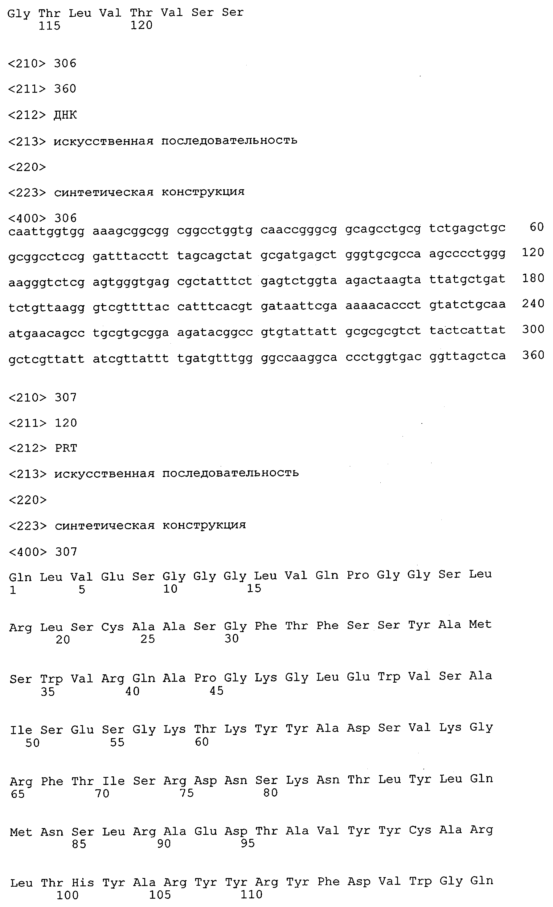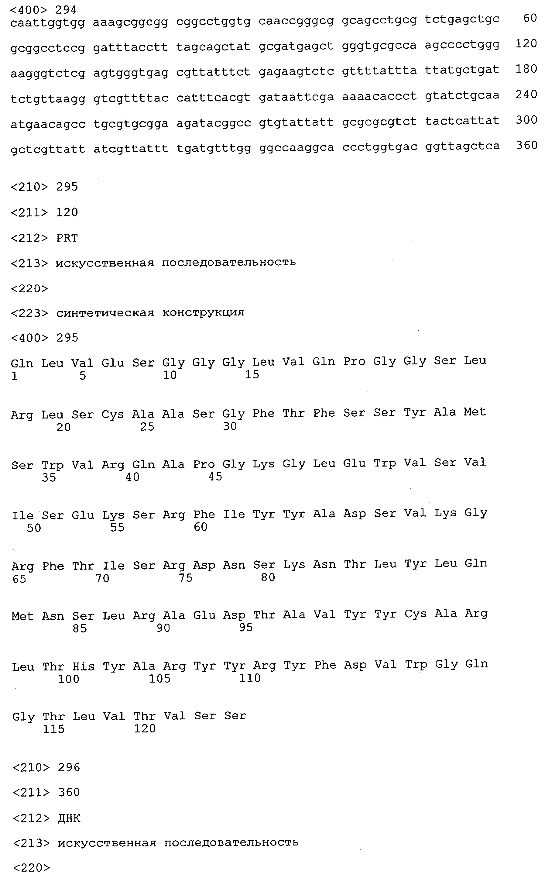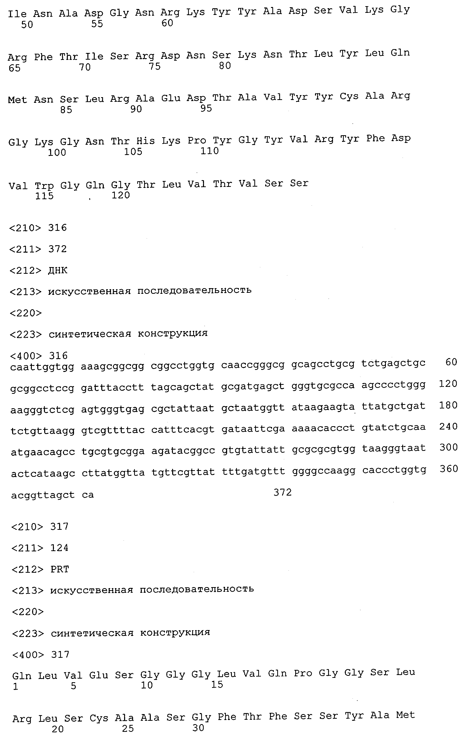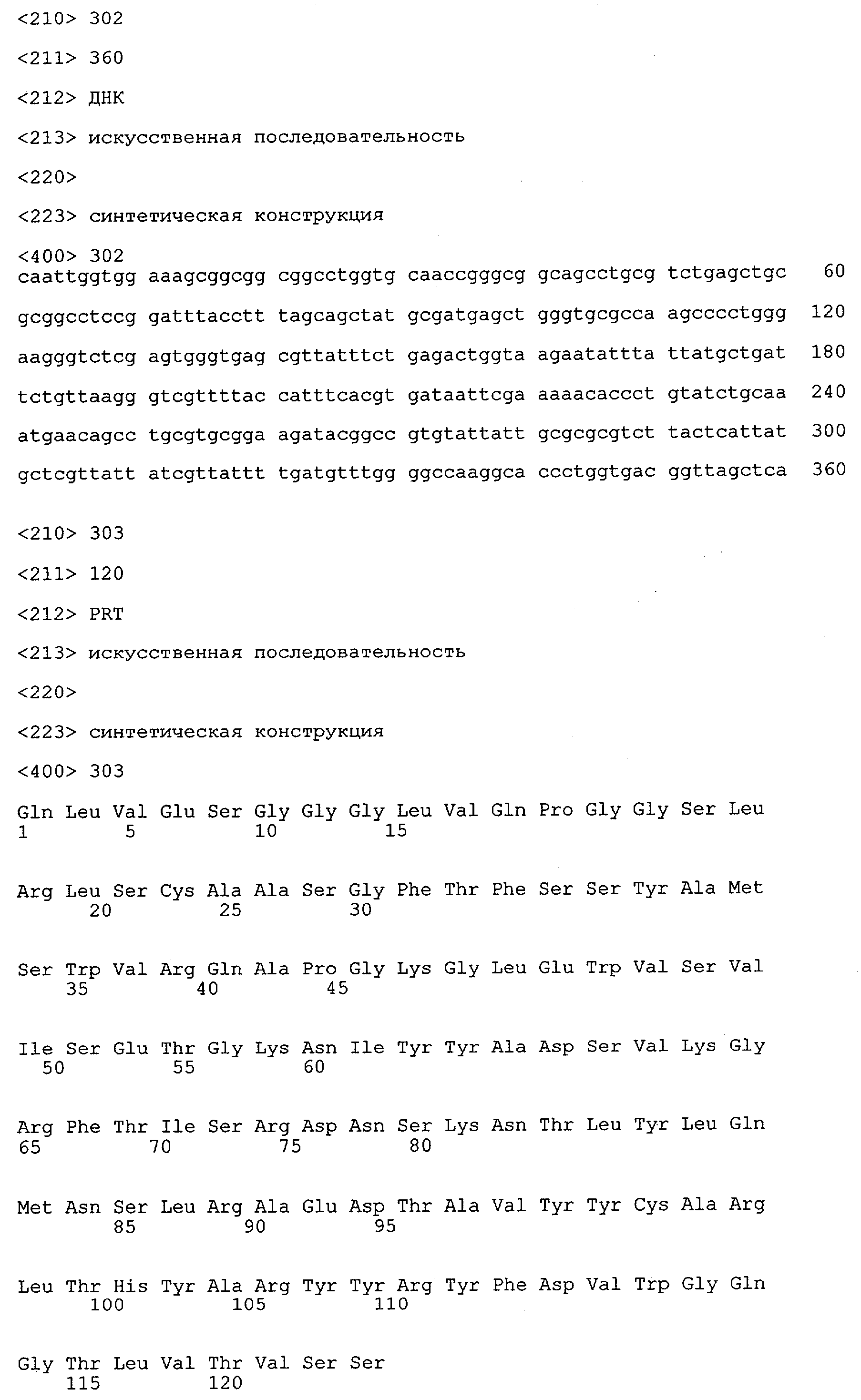 Согласно особенно предпочтительному варианту осуществления изобретения молекула антитела, предлагаемая в изобретении, содержит по меньшей мере один CDR3-участок VL-области, кодируемый молекулой нуклеиновой кислоты, которая представлена в SEQ ID NO:15, 17 или 19, или по меньшей мере один CDR3-участок аминокислотной последовательности VL-области, представленной в SEQ ID NO:16, 18 или 20, и/или указанная молекула антитела содержит по меньшей мере один СDR3-участок VH-области, кодируемый молекулой нуклеиновой кислоты, которая представлена в SEQ ID NO:21, 23 или 25, или по меньшей мере один СDR3-участок аминокислотной последовательности VH-области, представленный в SEQ ID NO:22, 24 или 26. Наиболее предпочтительными являются антитела, которые содержат по меньшей мере один СDR3-участок VH-области, представленный в настоящем описании. Указанные выше CDR3-участки родственны участкам предлагаемых в настоящем изобретении, приведенных в качестве иллюстрации родительских молекул антител MSR-3, -7 или -8. Однако, как проиллюстрировано ниже в таблицах 1, 8 или 10, созревшие и/или оптимизированные молекулы антител, получаемые с помощью методов, которые описаны ниже в примерах, могут содержать модифицированные CDR1-, CDR2- и СDR3-участки VH-, VL-областей. Таким образом, молекулу антитела, предлагаемую в изобретении, предпочтительно выбирают из ряда, включающего MSR-3, -7 и -8, или версию с созревшей аффинностью MSR-3, -7 или -8. Версии с созревшей аффинностью MSR-3, -7 и -8 содержат среди прочего молекулы антител, которые несут CDR1-, CDR2- и/или CDR3-участки, представленные в таблице 1 или 8, или которые характеризуются любой из последовательностей SEQ ID NO:15-20, 21- 26, 60-74, 75-87, 92 и 93 или 94 и 95, а также SEQ ID NO:354-413. Наиболее предпочтительно антитело, предлагаемое в изобретении, содержит по меньшей мере один CDR, предпочтительно CDR1, более предпочтительно CDR2, наиболее предпочтительно CDR3, которые представлены ниже в таблицах 1, 8 или в таблице 10.