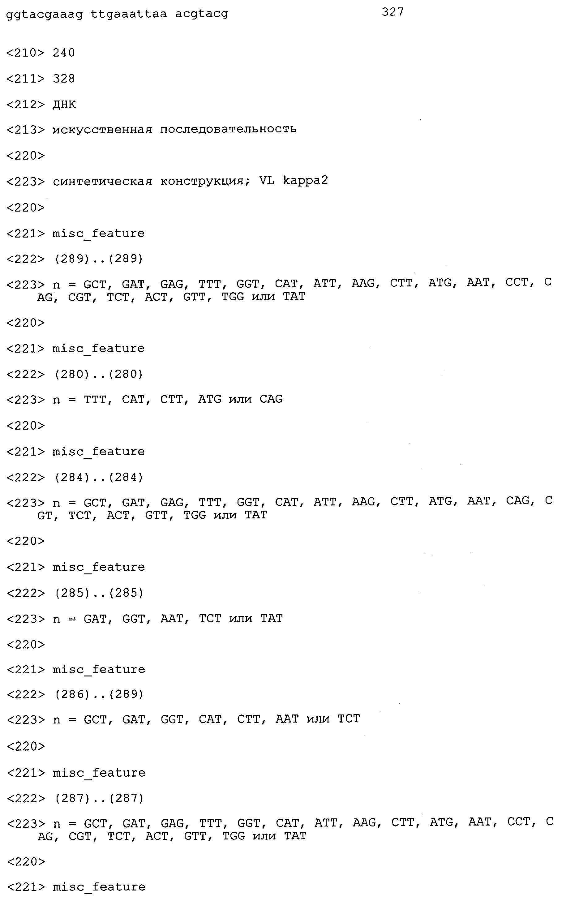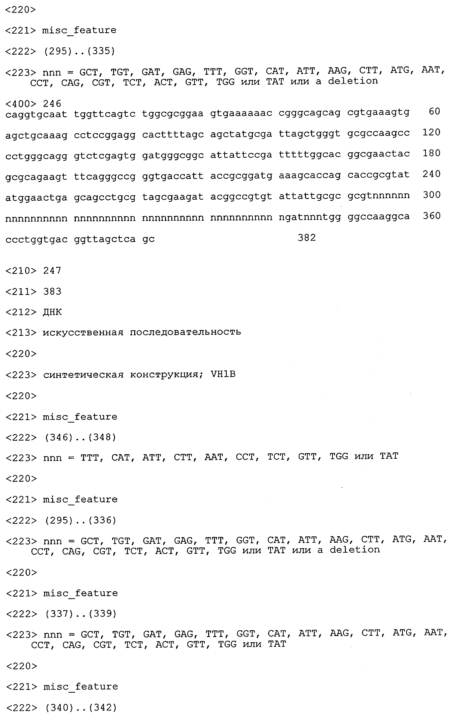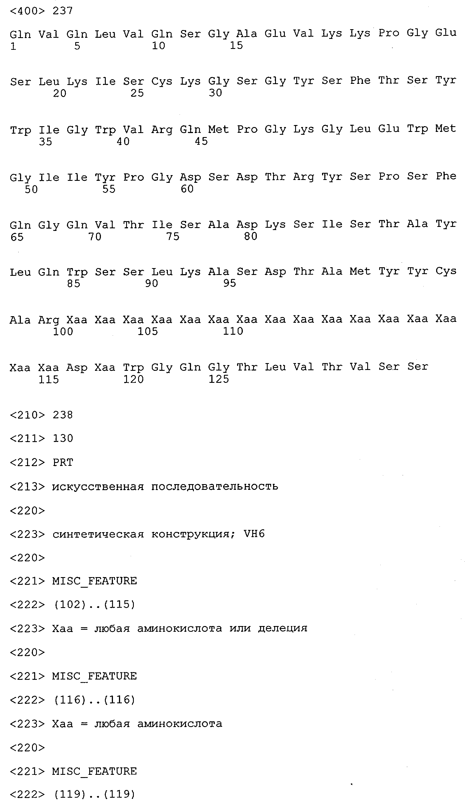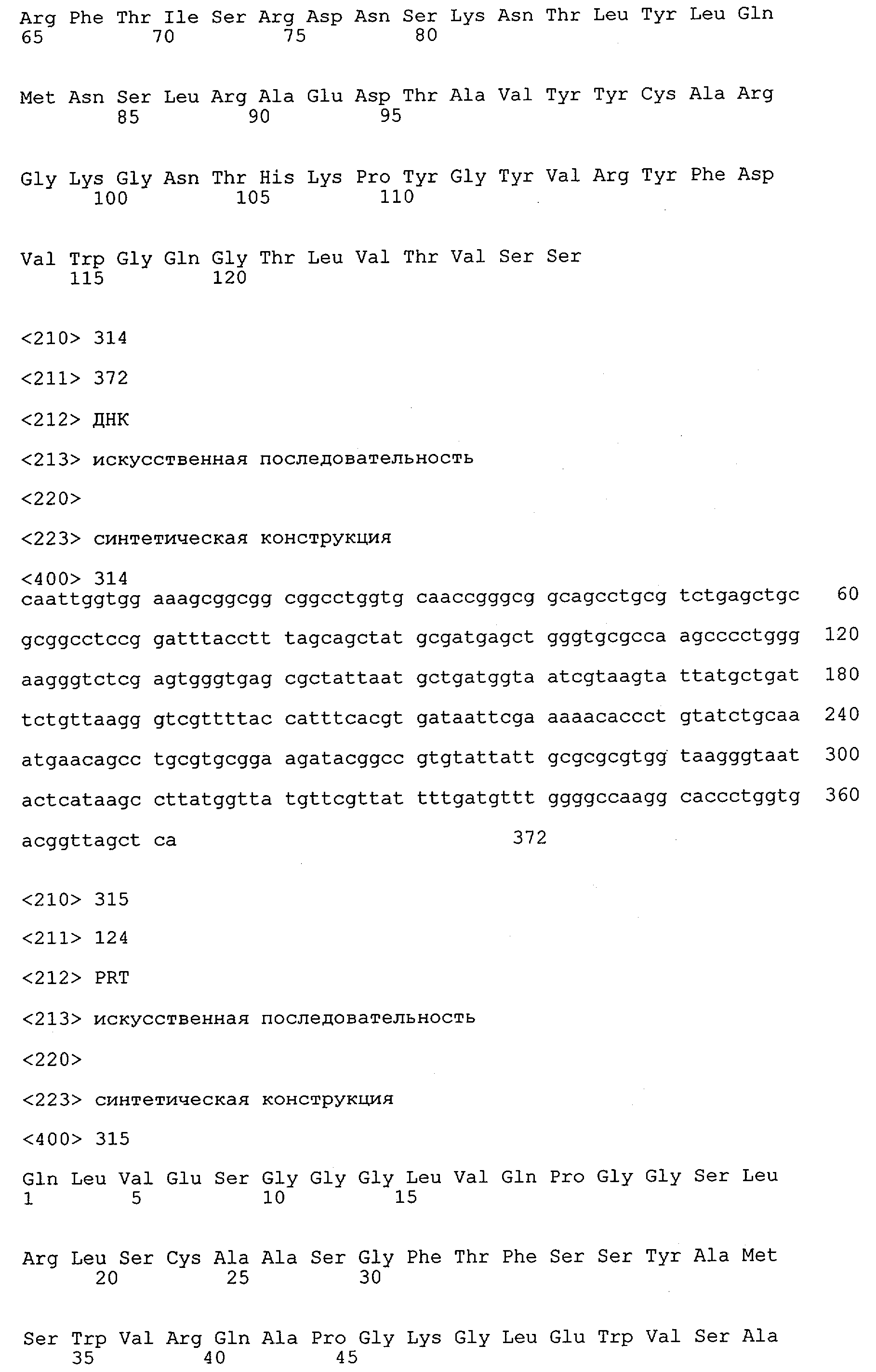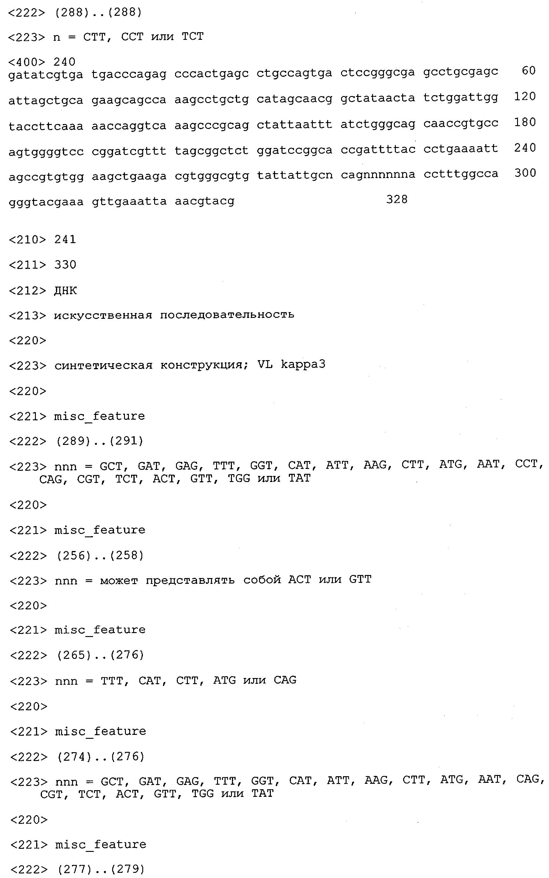 Согласно особенно предпочтительному варианту осуществления изобретения молекула антитела, предлагаемая в изобретении, содержит по меньшей мере один CDR3-участок VL-области, кодируемый молекулой нуклеиновой кислоты, которая представлена в SEQ ID NO:15, 17 или 19, или по меньшей мере один CDR3-участок аминокислотной последовательности VL-области, представленной в SEQ ID NO:16, 18 или 20, и/или указанная молекула антитела содержит по меньшей мере один СDR3-участок VH-области, кодируемый молекулой нуклеиновой кислоты, которая представлена в SEQ ID NO:21, 23 или 25, или по меньшей мере один СDR3-участок аминокислотной последовательности VH-области, представленный в SEQ ID NO:22, 24 или 26. Наиболее предпочтительными являются антитела, которые содержат по меньшей мере один СDR3-участок VH-области, представленный в настоящем описании. Указанные выше CDR3-участки родственны участкам предлагаемых в настоящем изобретении, приведенных в качестве иллюстрации родительских молекул антител MSR-3, -7 или -8. Однако, как проиллюстрировано ниже в таблицах 1, 8 или 10, созревшие и/или оптимизированные молекулы антител, получаемые с помощью методов, которые описаны ниже в примерах, могут содержать модифицированные CDR1-, CDR2- и СDR3-участки VH-, VL-областей. Таким образом, молекулу антитела, предлагаемую в изобретении, предпочтительно выбирают из ряда, включающего MSR-3, -7 и -8, или версию с созревшей аффинностью MSR-3, -7 или -8. Версии с созревшей аффинностью MSR-3, -7 и -8 содержат среди прочего молекулы антител, которые несут CDR1-, CDR2- и/или CDR3-участки, представленные в таблице 1 или 8, или которые характеризуются любой из последовательностей SEQ ID NO:15-20, 21- 26, 60-74, 75-87, 92 и 93 или 94 и 95, а также SEQ ID NO:354-413. Наиболее предпочтительно антитело, предлагаемое в изобретении, содержит по меньшей мере один CDR, предпочтительно CDR1, более предпочтительно CDR2, наиболее предпочтительно CDR3, которые представлены ниже в таблицах 1, 8 или в таблице 10.