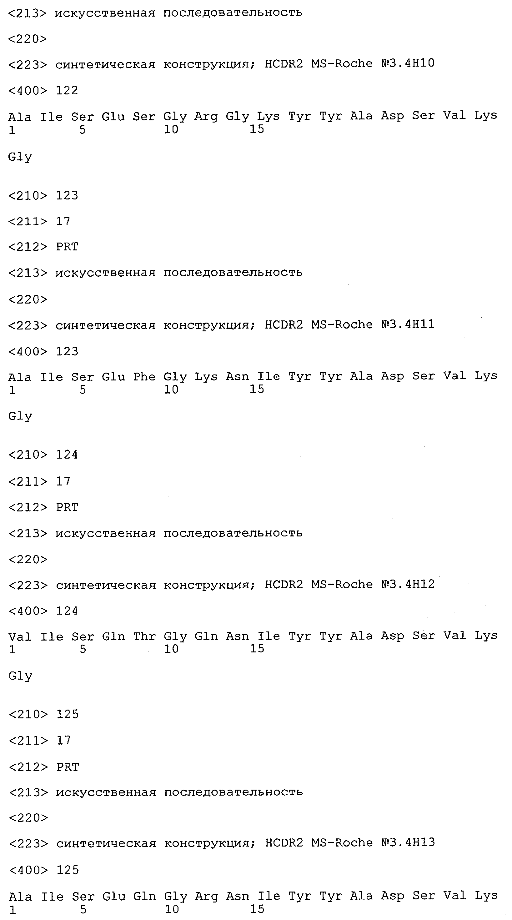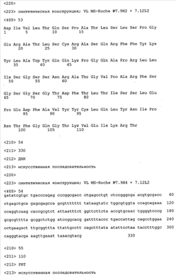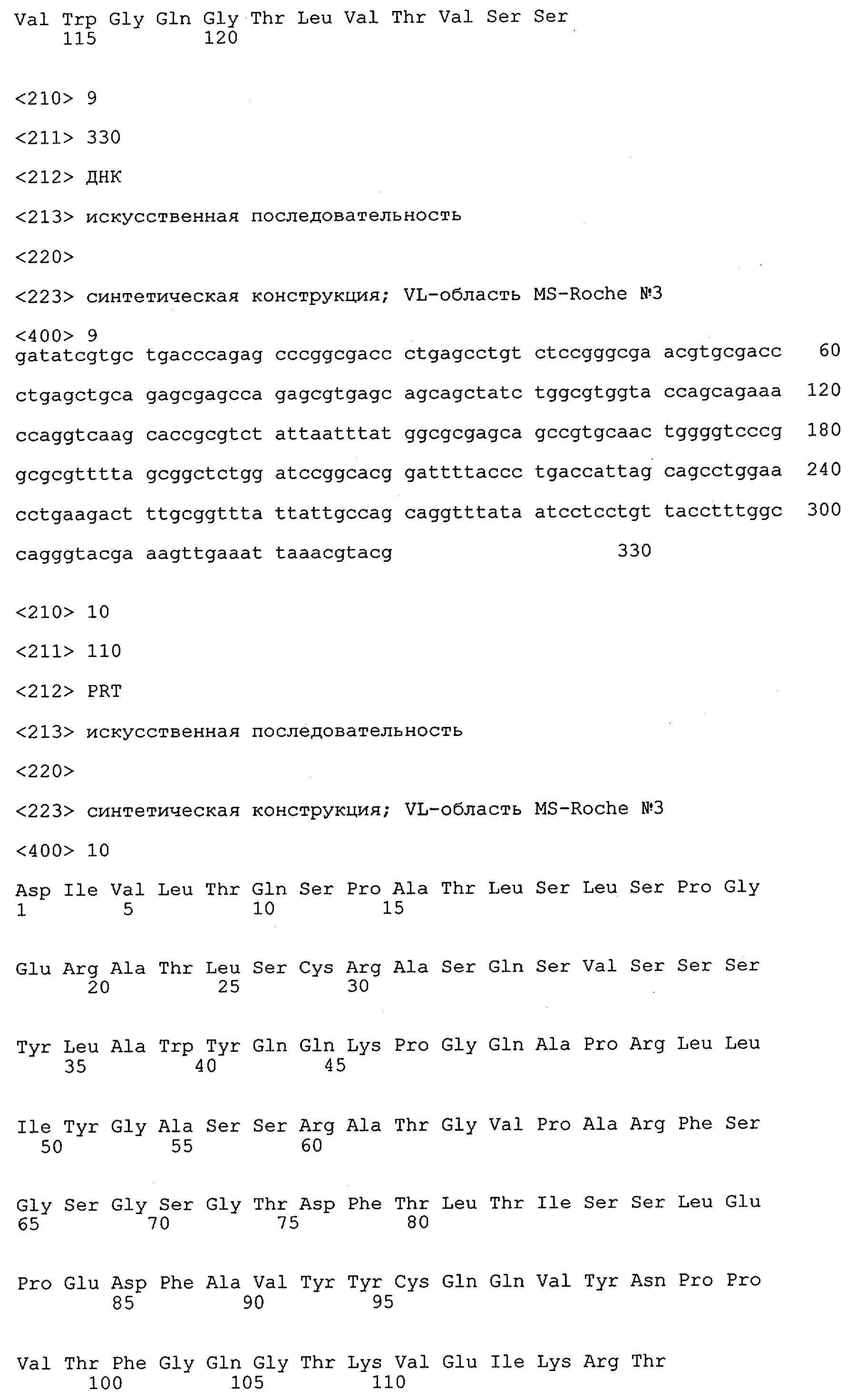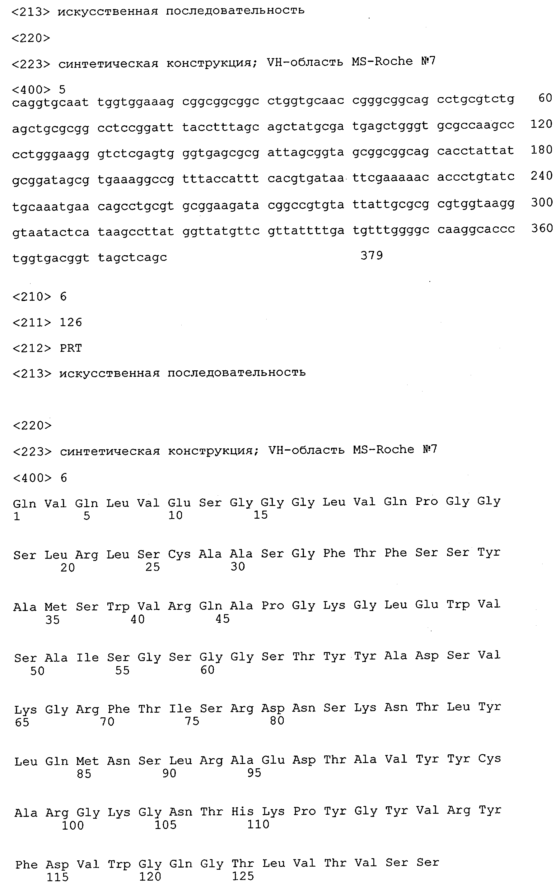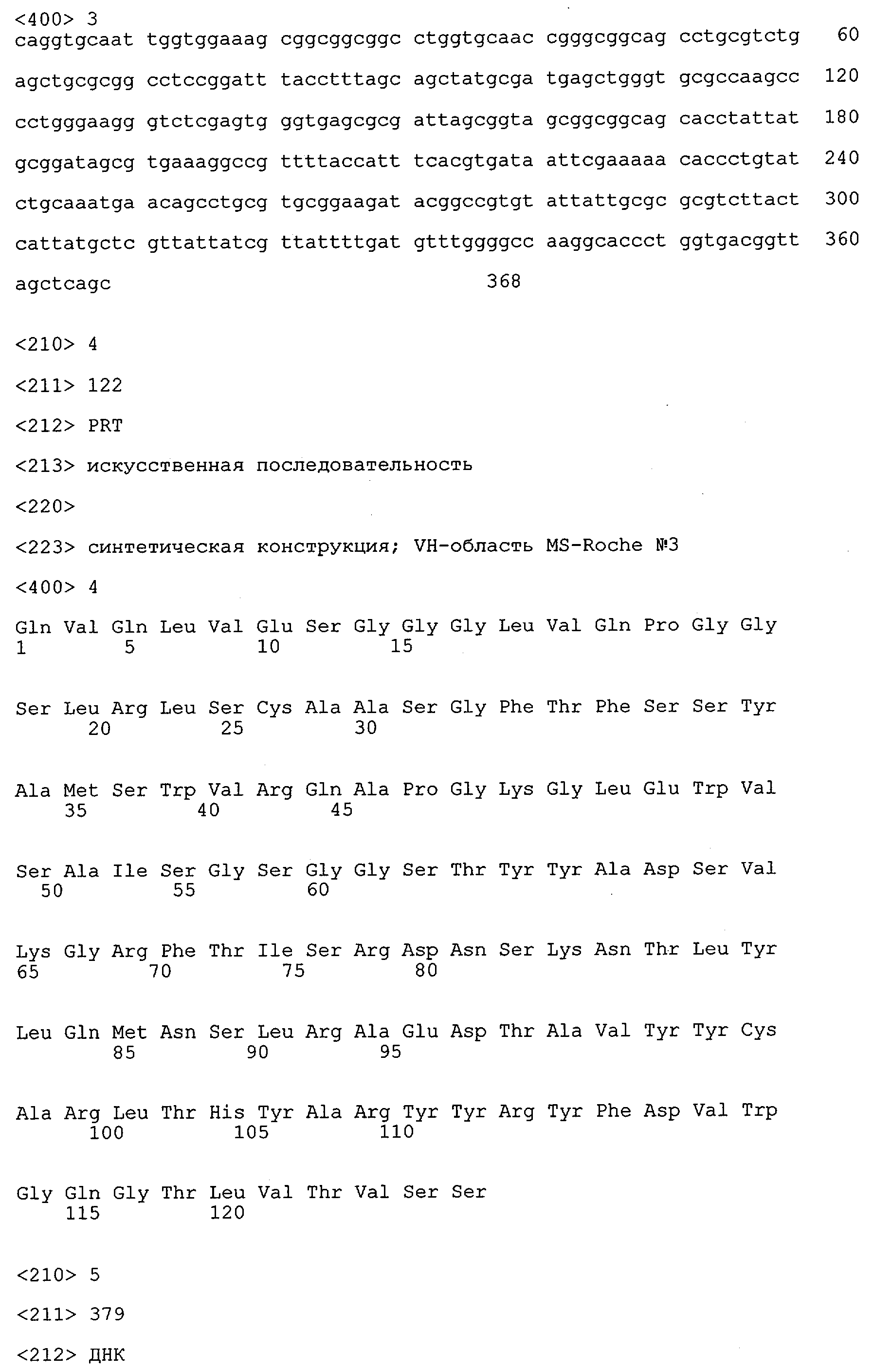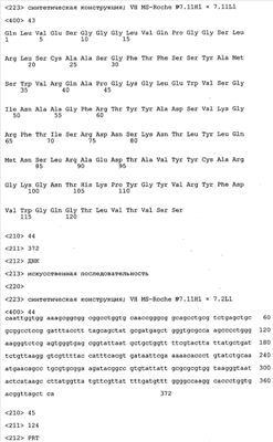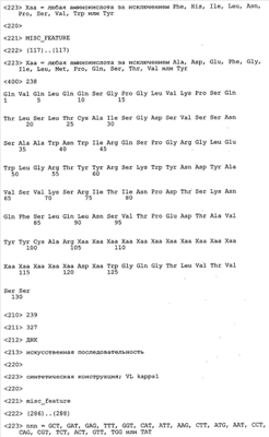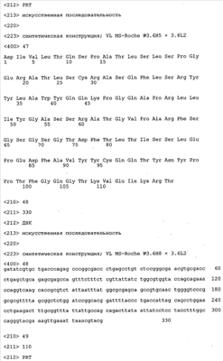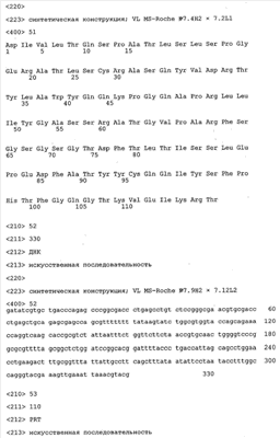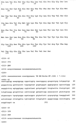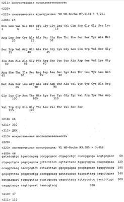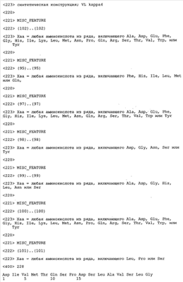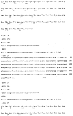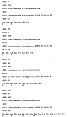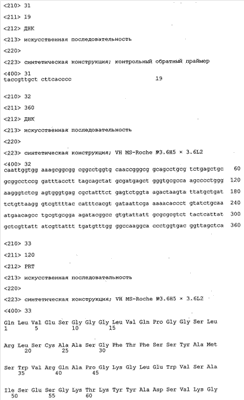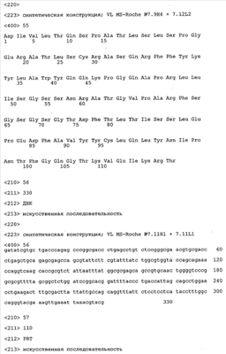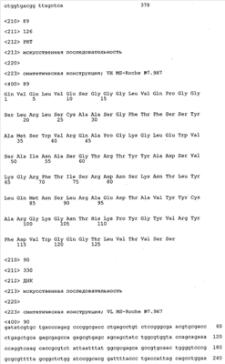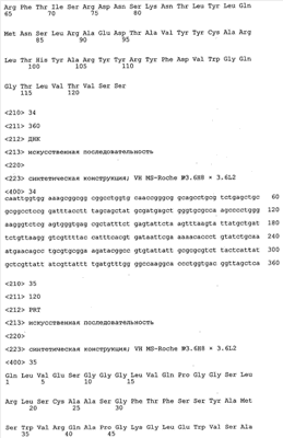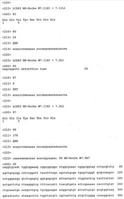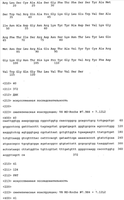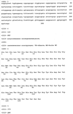 Получение антител перекрестным клонированием проиллюстрировано также в приведенных ниже примерах. Перечисленные выше предпочтительные полученные перекрестным клонированием антитела/молекулы антител представляют собой оптимизированные/созревшие молекулы антител, выведенные из описанных родительских антител, в частности из MSR-3 и MSR-7. Кроме того, характерные CDR-последовательности и V-области полученных перекрестным клонированием молекул антител/антител представлены ниже в SEQ ID NO:32, 33, 46 и 47 (MSR 3.6H5×3.6.L2; VH-, VL-области); 34, 35, 48 и 49 (MSR 3.6H8×3.6.L2; VH-, VL-области); 36, 37, 50 и 51 (MSR 7.4H2×7.2.L1; VH-, VL-области); 38, 39, 52 и 53 (MSR 7.9H2×7.12.L2; VH-, VL-области); 40, 41, 54 и 55 (MSR №7-9H4×7.12.L2; VH-, VL-области); 42, 43, 56 и 57 (MSR №7.11Н1×7.11.L1; VH-, VL-области) и 44, 45, 58 и 59 (MSR №7.11H1×7.2.L1; VH-, VL-области). Соответствующие CDR3-участки этих особенно предпочтительных полученных перекрестным клонированием молекул антител представлены в SEQ ID NO:60-87. Для других молекул MSR-антител CDR-участки VH-, VL-области можно обнаружить ниже в таблицах 8 или 10 и в прилагаемом перечне последовательностей, в частности SEQ ID NO:32-95 для MS-R- антител/молекул антител №3.6Н5×3.6L2, №3.6Н8×3.6L2, №7.4Н2×7.2L1, №7.9Н2×7.12L2, №7.9Н4×7.12L2, №7.11Н1×7.11L1, №7.11Н1×7.2L1 и №7.9Н7 или SEQ ID NO:294-413 для MSR-R-антител/молекул антител №3.3Н1×3.4L1, №3.4Н1×3.4L9, №3.4Н3×3.4L7, №3.4Н3×3.4L9, №3.4Н7×3.4L9, №3.4Н7×3.4L7, №3.6Н5×3.6L1, №7.2Н2×7.2L1, №7.4Н2×7.12L2, №7.9Н2×7.2L1, №7.9Н2×7.12L1, №7.11Н2×7.2L1, №7.11Н2×7.9L1, №7.11Н2×7.12L1 или №8.1Н1×8.2L1. Таким образом, помимо указанных выше VH-областей предпочтительные молекулы антител, предлагаемые в изобретении, могут содержать VH-области, указанные в любой из SEQ ID NO:294-323. Аналогично этому, в SEQ ID NO:324-353 представлены VL-области, которые помимо указанных выше VL-областей, могут нести молекулы антител, предлагаемые в изобретении. Соответствующие CDR-участки указаны выше, а также могут быть представлены последовательностями, указанными в SEQ ID NO:354-413.