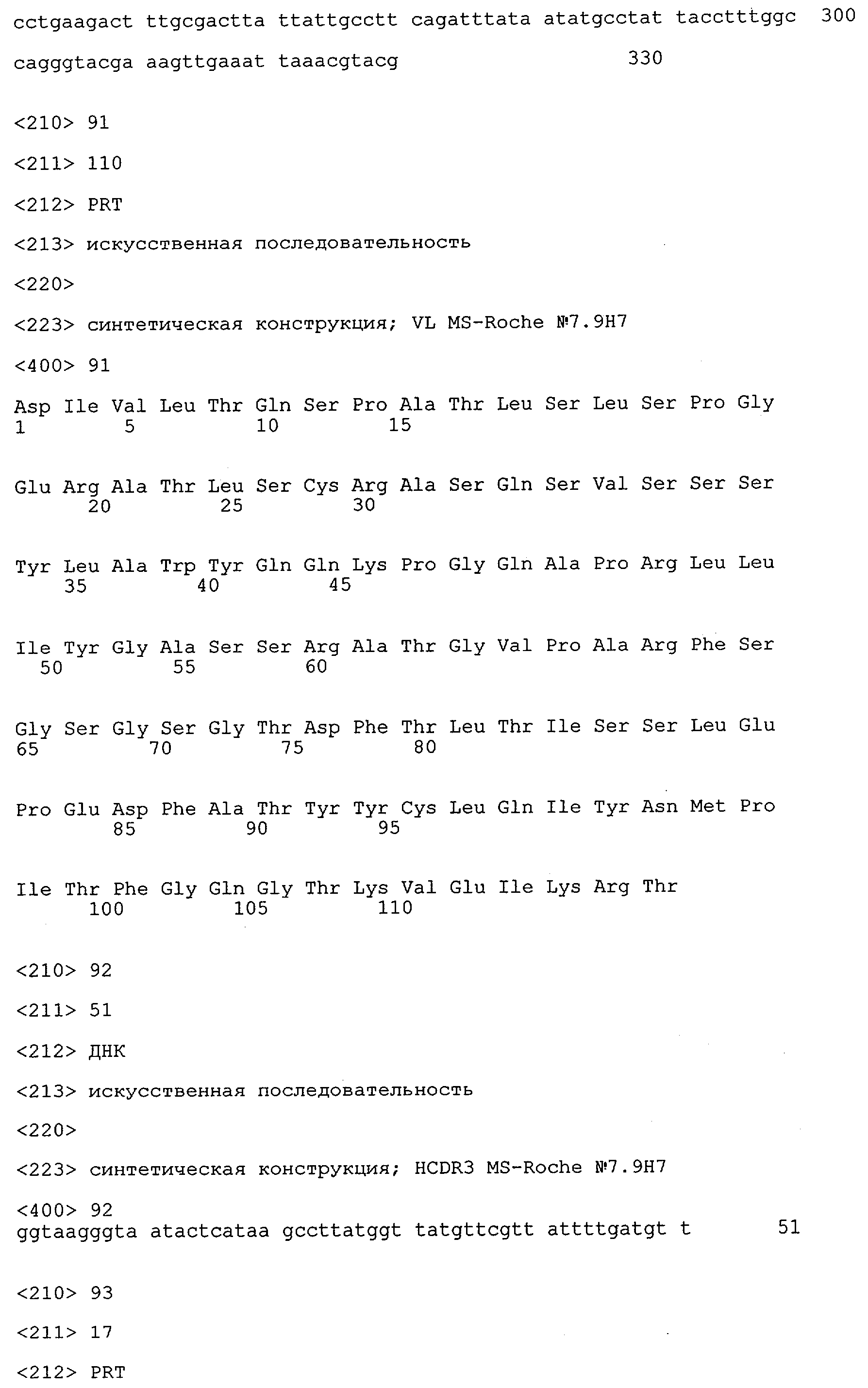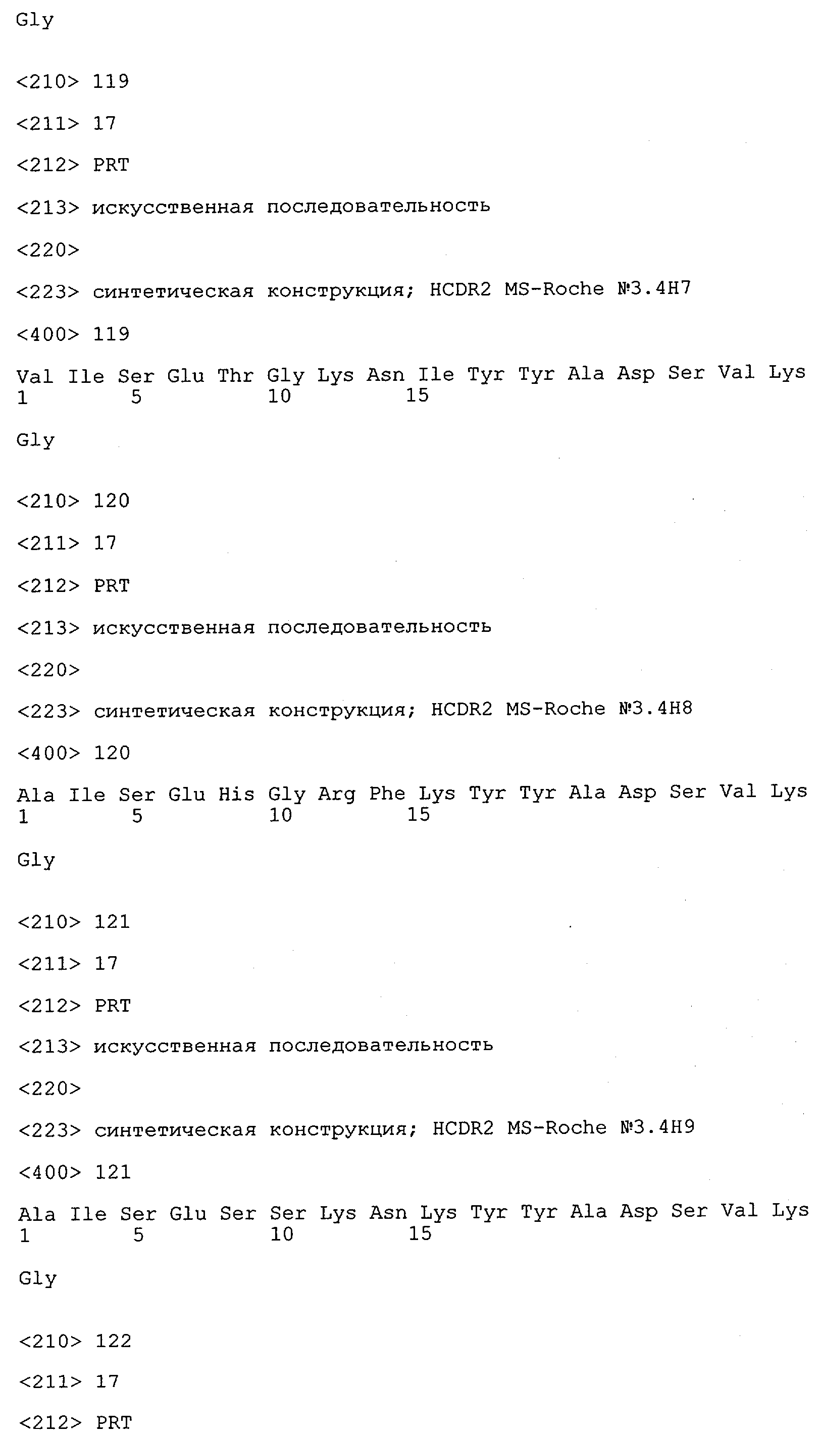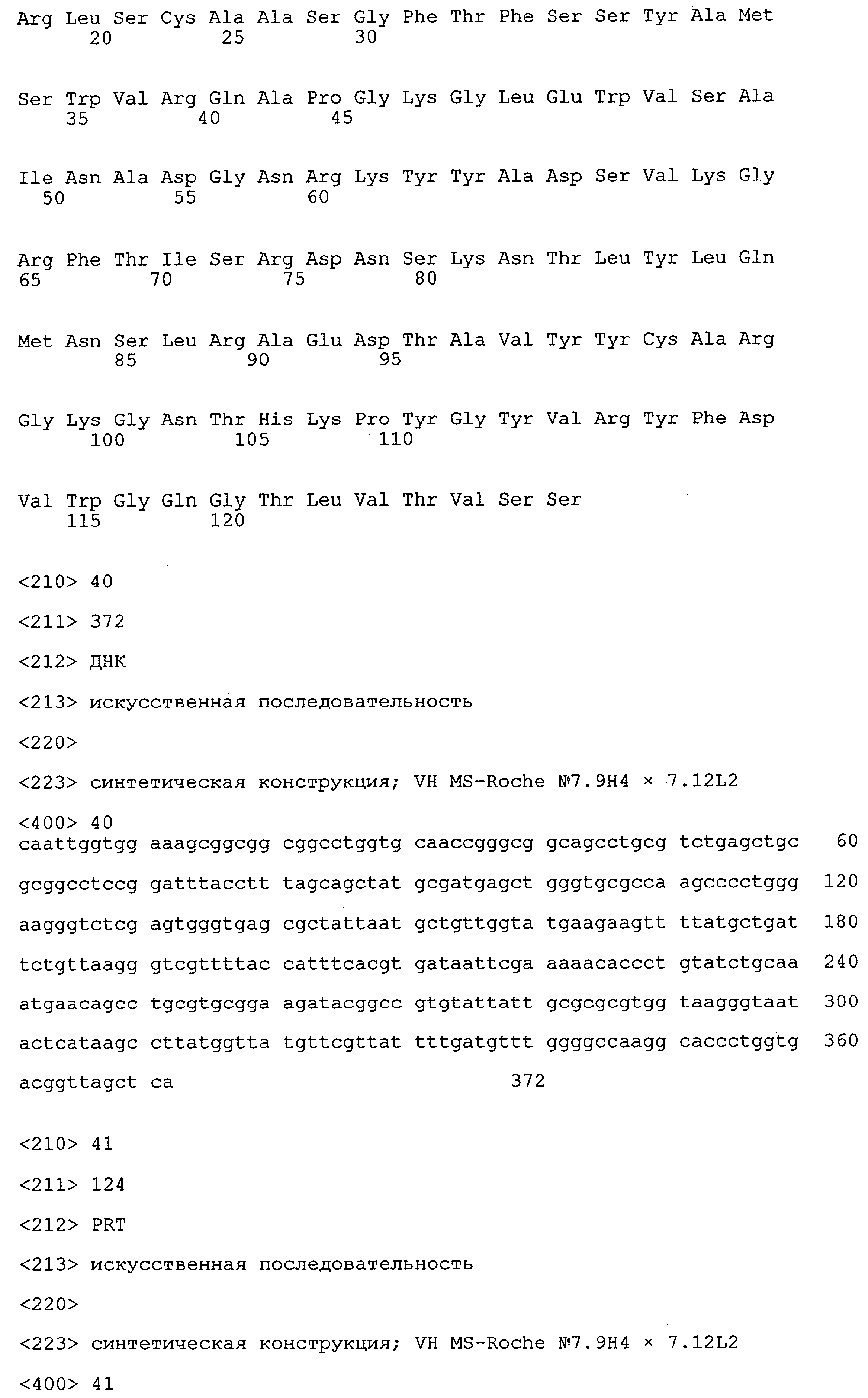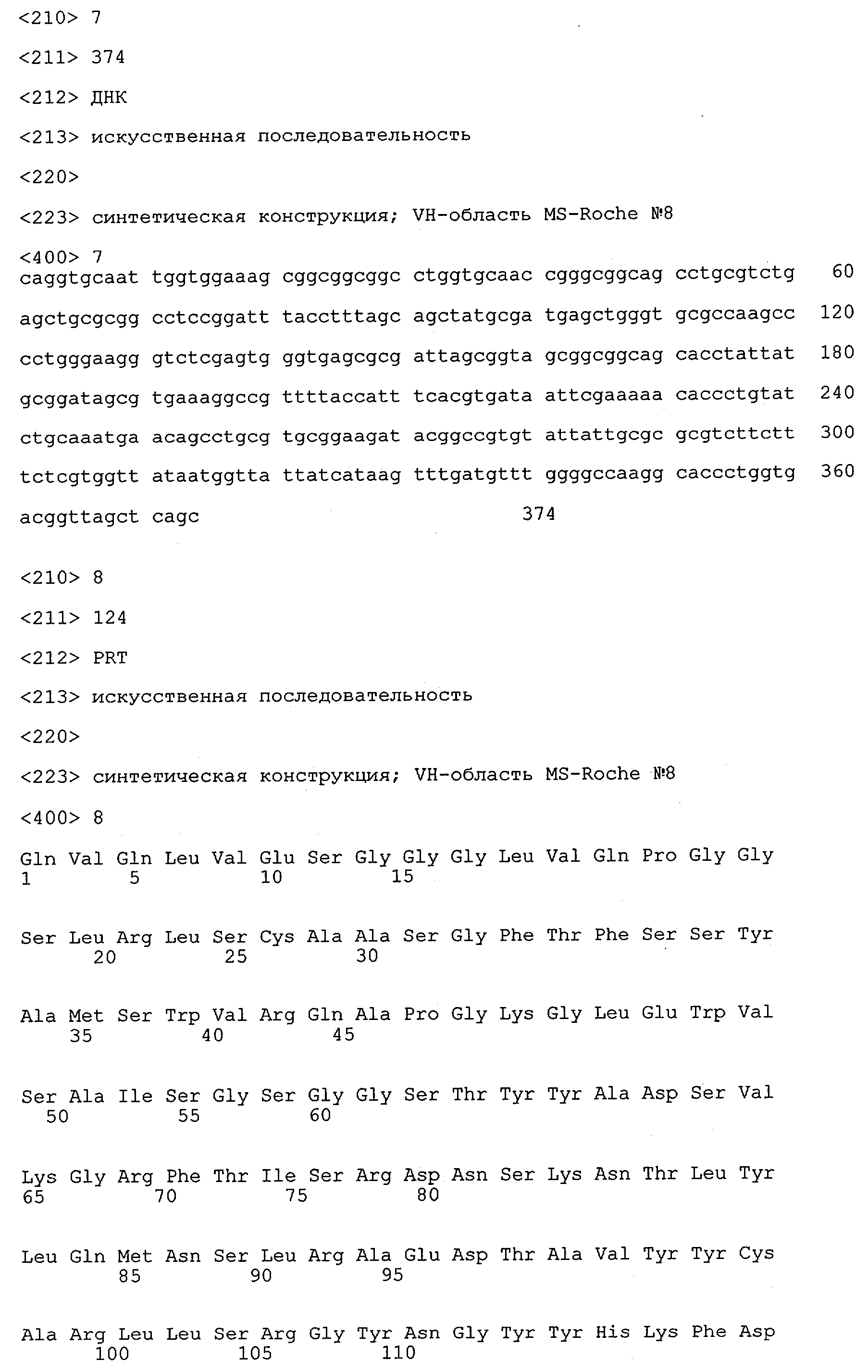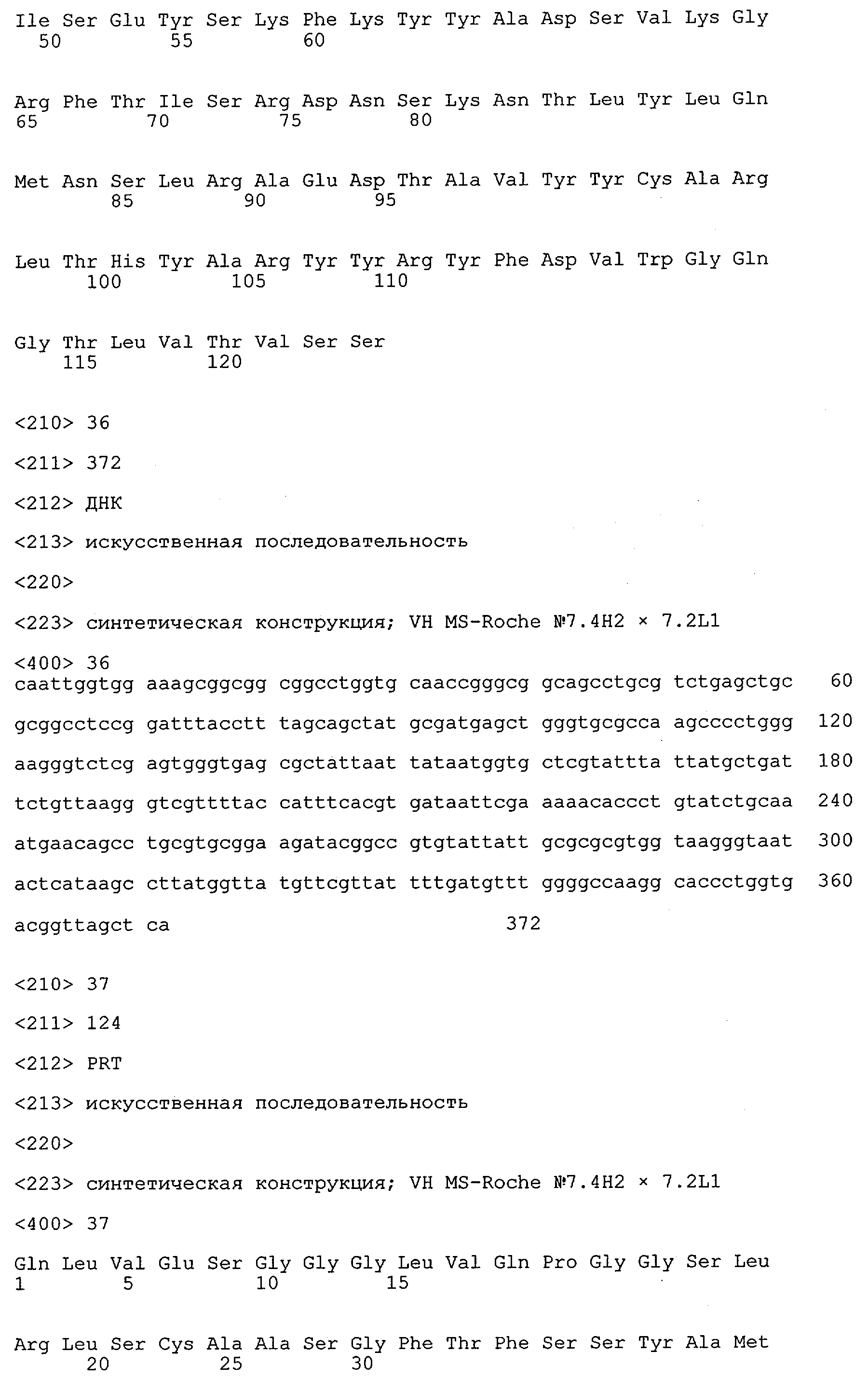 Получение антител перекрестным клонированием проиллюстрировано также в приведенных ниже примерах. Перечисленные выше предпочтительные полученные перекрестным клонированием антитела/молекулы антител представляют собой оптимизированные/созревшие молекулы антител, выведенные из описанных родительских антител, в частности из MSR-3 и MSR-7. Кроме того, характерные CDR-последовательности и V-области полученных перекрестным клонированием молекул антител/антител представлены ниже в SEQ ID NO:32, 33, 46 и 47 (MSR 3.6H5×3.6.L2; VH-, VL-области); 34, 35, 48 и 49 (MSR 3.6H8×3.6.L2; VH-, VL-области); 36, 37, 50 и 51 (MSR 7.4H2×7.2.L1; VH-, VL-области); 38, 39, 52 и 53 (MSR 7.9H2×7.12.L2; VH-, VL-области); 40, 41, 54 и 55 (MSR №7-9H4×7.12.L2; VH-, VL-области); 42, 43, 56 и 57 (MSR №7.11Н1×7.11.L1; VH-, VL-области) и 44, 45, 58 и 59 (MSR №7.11H1×7.2.L1; VH-, VL-области). Соответствующие CDR3-участки этих особенно предпочтительных полученных перекрестным клонированием молекул антител представлены в SEQ ID NO:60-87. Для других молекул MSR-антител CDR-участки VH-, VL-области можно обнаружить ниже в таблицах 8 или 10 и в прилагаемом перечне последовательностей, в частности SEQ ID NO:32-95 для MS-R- антител/молекул антител №3.6Н5×3.6L2, №3.6Н8×3.6L2, №7.4Н2×7.2L1, №7.9Н2×7.12L2, №7.9Н4×7.12L2, №7.11Н1×7.11L1, №7.11Н1×7.2L1 и №7.9Н7 или SEQ ID NO:294-413 для MSR-R-антител/молекул антител №3.3Н1×3.4L1, №3.4Н1×3.4L9, №3.4Н3×3.4L7, №3.4Н3×3.4L9, №3.4Н7×3.4L9, №3.4Н7×3.4L7, №3.6Н5×3.6L1, №7.2Н2×7.2L1, №7.4Н2×7.12L2, №7.9Н2×7.2L1, №7.9Н2×7.12L1, №7.11Н2×7.2L1, №7.11Н2×7.9L1, №7.11Н2×7.12L1 или №8.1Н1×8.2L1. Таким образом, помимо указанных выше VH-областей предпочтительные молекулы антител, предлагаемые в изобретении, могут содержать VH-области, указанные в любой из SEQ ID NO:294-323. Аналогично этому, в SEQ ID NO:324-353 представлены VL-области, которые помимо указанных выше VL-областей, могут нести молекулы антител, предлагаемые в изобретении. Соответствующие CDR-участки указаны выше, а также могут быть представлены последовательностями, указанными в SEQ ID NO:354-413.