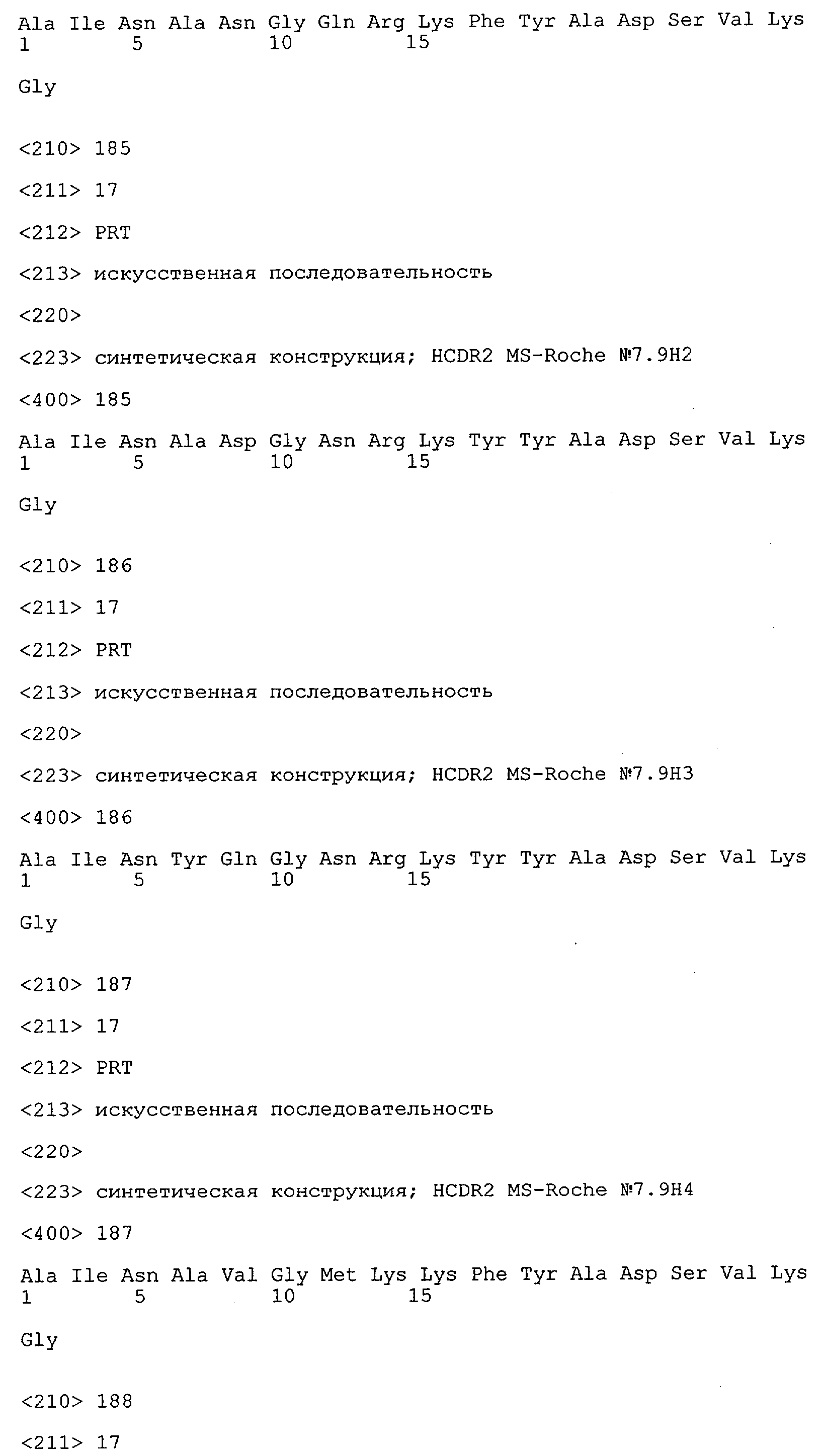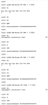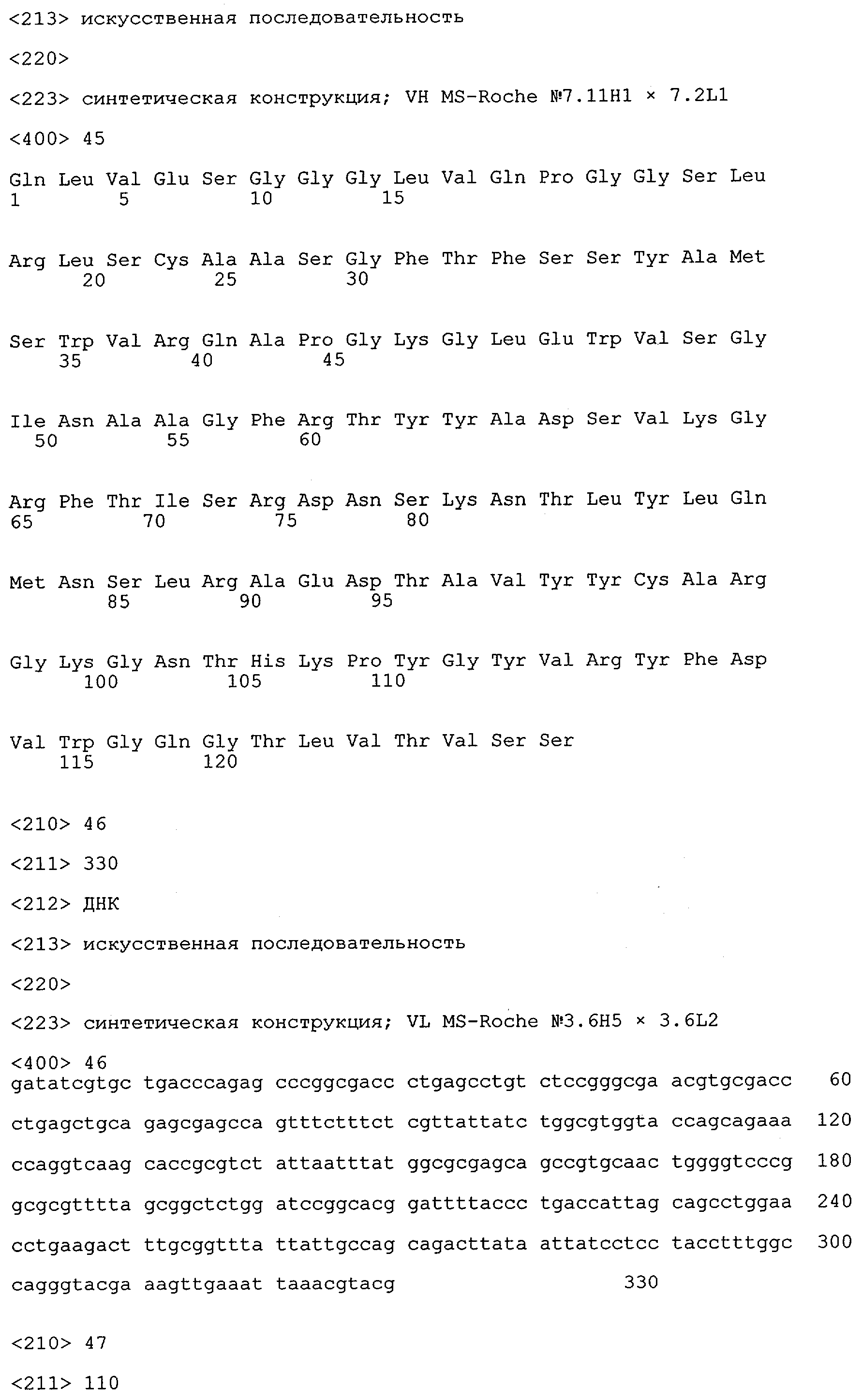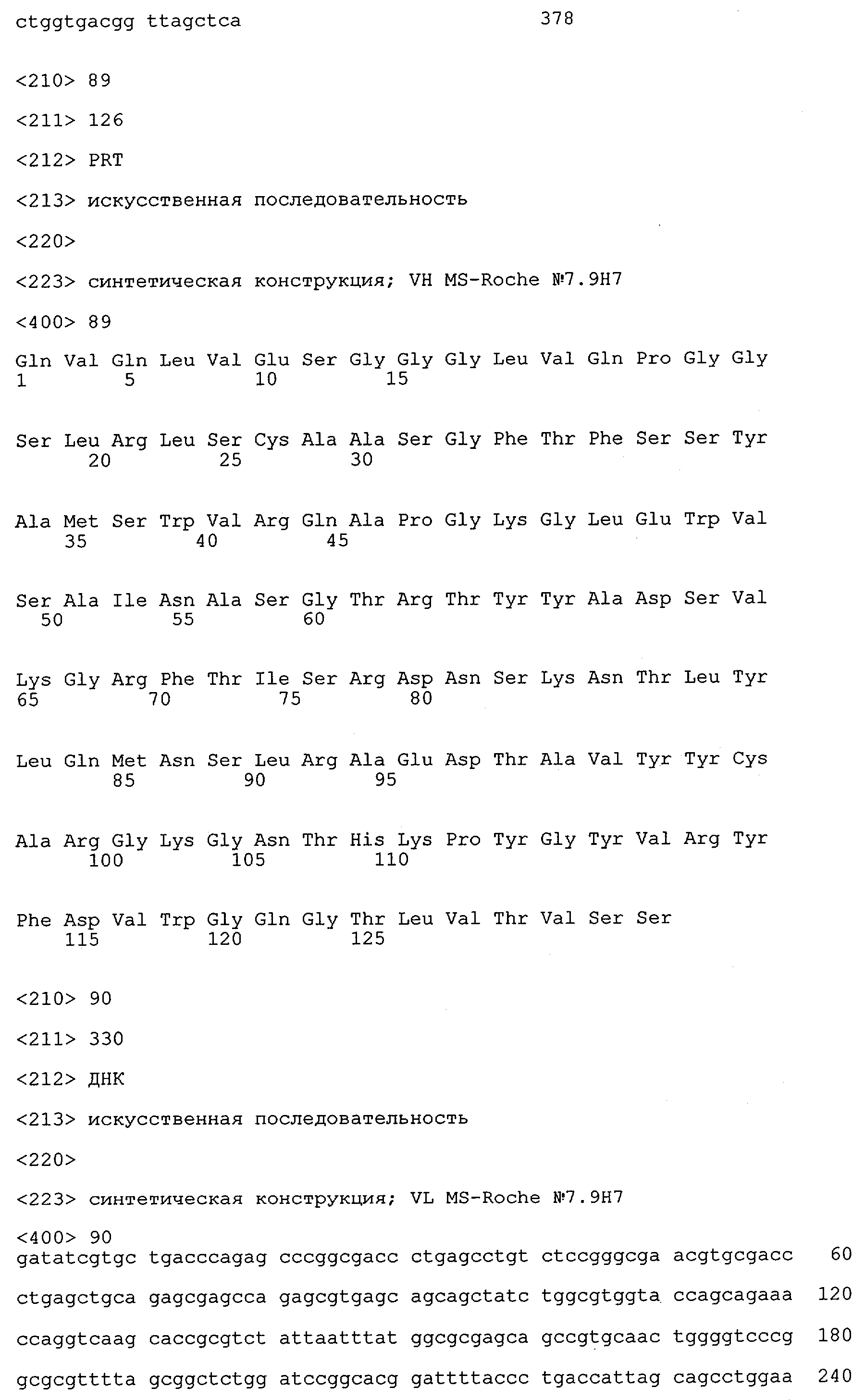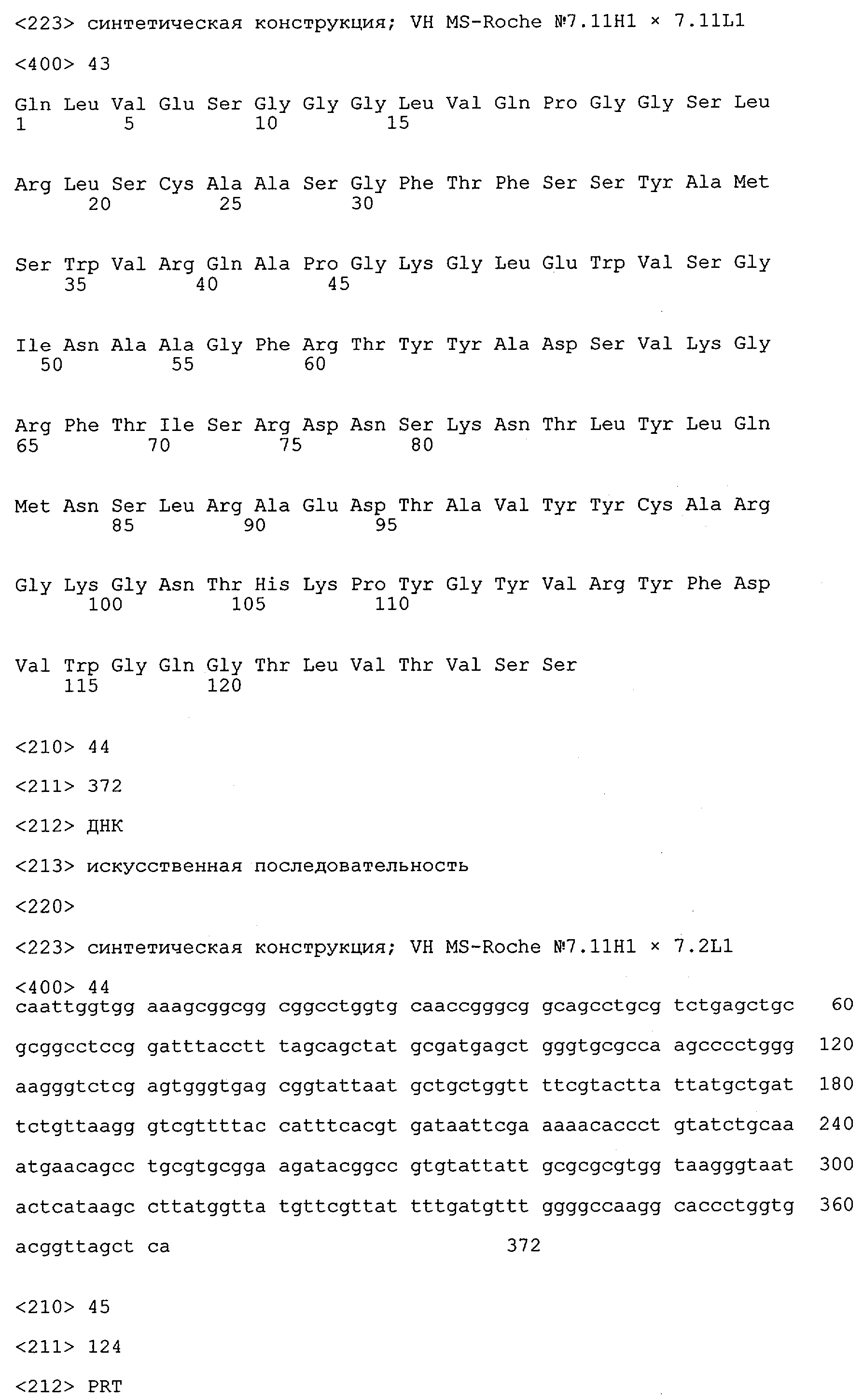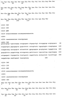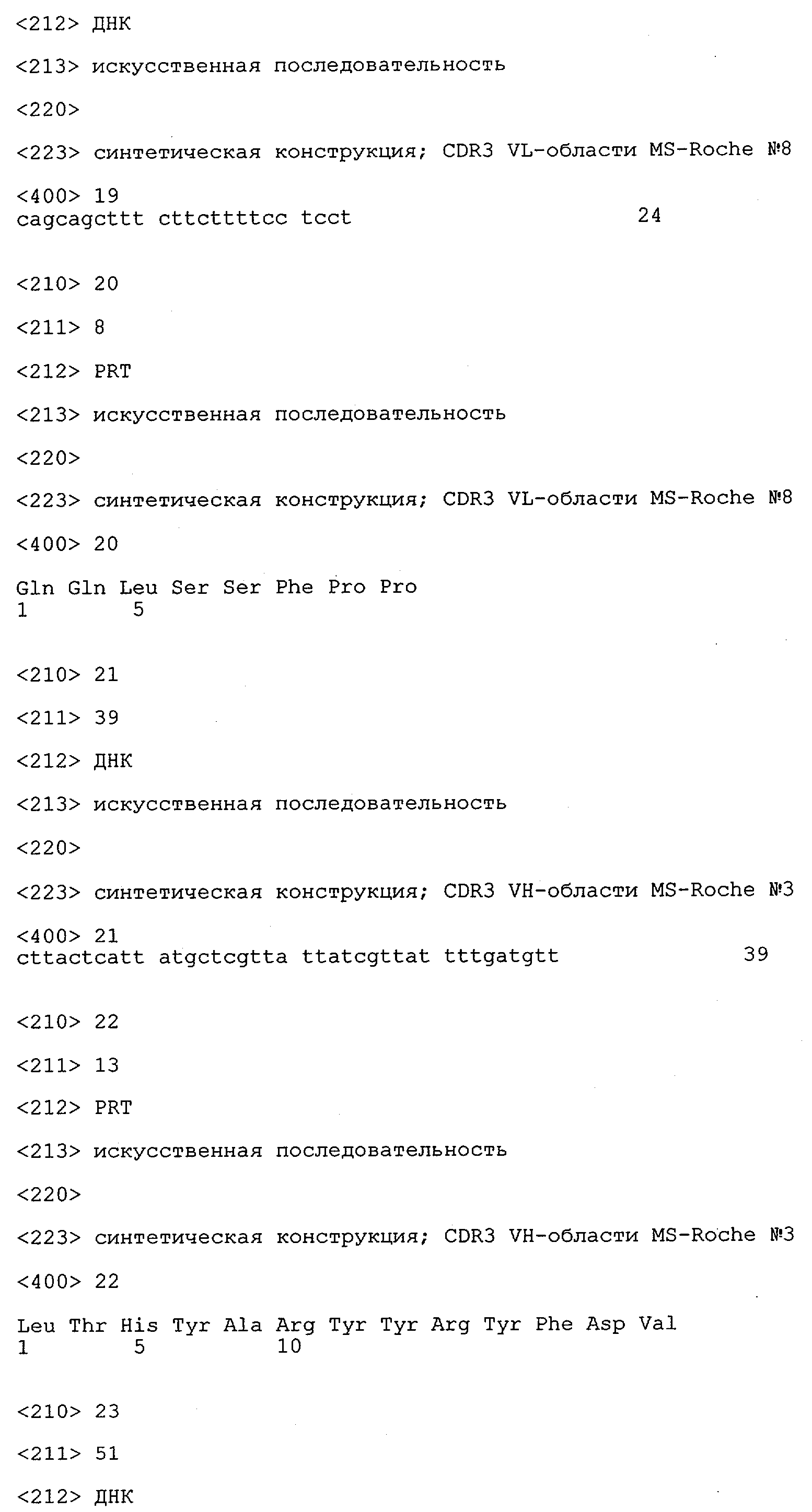 Получение антител перекрестным клонированием проиллюстрировано также в приведенных ниже примерах. Перечисленные выше предпочтительные полученные перекрестным клонированием антитела/молекулы антител представляют собой оптимизированные/созревшие молекулы антител, выведенные из описанных родительских антител, в частности из MSR-3 и MSR-7. Кроме того, характерные CDR-последовательности и V-области полученных перекрестным клонированием молекул антител/антител представлены ниже в SEQ ID NO:32, 33, 46 и 47 (MSR 3.6H5×3.6.L2; VH-, VL-области); 34, 35, 48 и 49 (MSR 3.6H8×3.6.L2; VH-, VL-области); 36, 37, 50 и 51 (MSR 7.4H2×7.2.L1; VH-, VL-области); 38, 39, 52 и 53 (MSR 7.9H2×7.12.L2; VH-, VL-области); 40, 41, 54 и 55 (MSR №7-9H4×7.12.L2; VH-, VL-области); 42, 43, 56 и 57 (MSR №7.11Н1×7.11.L1; VH-, VL-области) и 44, 45, 58 и 59 (MSR №7.11H1×7.2.L1; VH-, VL-области). Соответствующие CDR3-участки этих особенно предпочтительных полученных перекрестным клонированием молекул антител представлены в SEQ ID NO:60-87. Для других молекул MSR-антител CDR-участки VH-, VL-области можно обнаружить ниже в таблицах 8 или 10 и в прилагаемом перечне последовательностей, в частности SEQ ID NO:32-95 для MS-R- антител/молекул антител №3.6Н5×3.6L2, №3.6Н8×3.6L2, №7.4Н2×7.2L1, №7.9Н2×7.12L2, №7.9Н4×7.12L2, №7.11Н1×7.11L1, №7.11Н1×7.2L1 и №7.9Н7 или SEQ ID NO:294-413 для MSR-R-антител/молекул антител №3.3Н1×3.4L1, №3.4Н1×3.4L9, №3.4Н3×3.4L7, №3.4Н3×3.4L9, №3.4Н7×3.4L9, №3.4Н7×3.4L7, №3.6Н5×3.6L1, №7.2Н2×7.2L1, №7.4Н2×7.12L2, №7.9Н2×7.2L1, №7.9Н2×7.12L1, №7.11Н2×7.2L1, №7.11Н2×7.9L1, №7.11Н2×7.12L1 или №8.1Н1×8.2L1. Таким образом, помимо указанных выше VH-областей предпочтительные молекулы антител, предлагаемые в изобретении, могут содержать VH-области, указанные в любой из SEQ ID NO:294-323. Аналогично этому, в SEQ ID NO:324-353 представлены VL-области, которые помимо указанных выше VL-областей, могут нести молекулы антител, предлагаемые в изобретении. Соответствующие CDR-участки указаны выше, а также могут быть представлены последовательностями, указанными в SEQ ID NO:354-413.