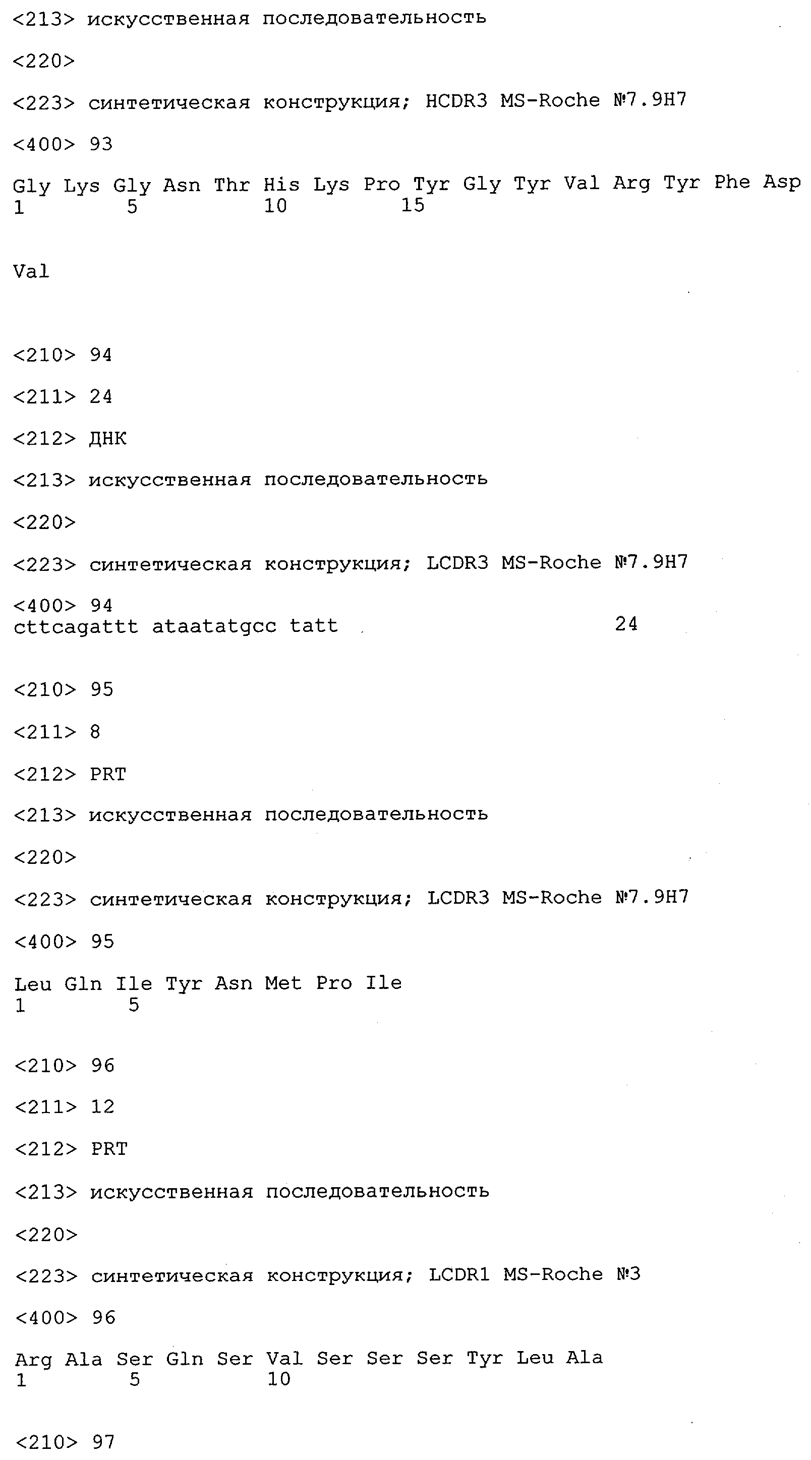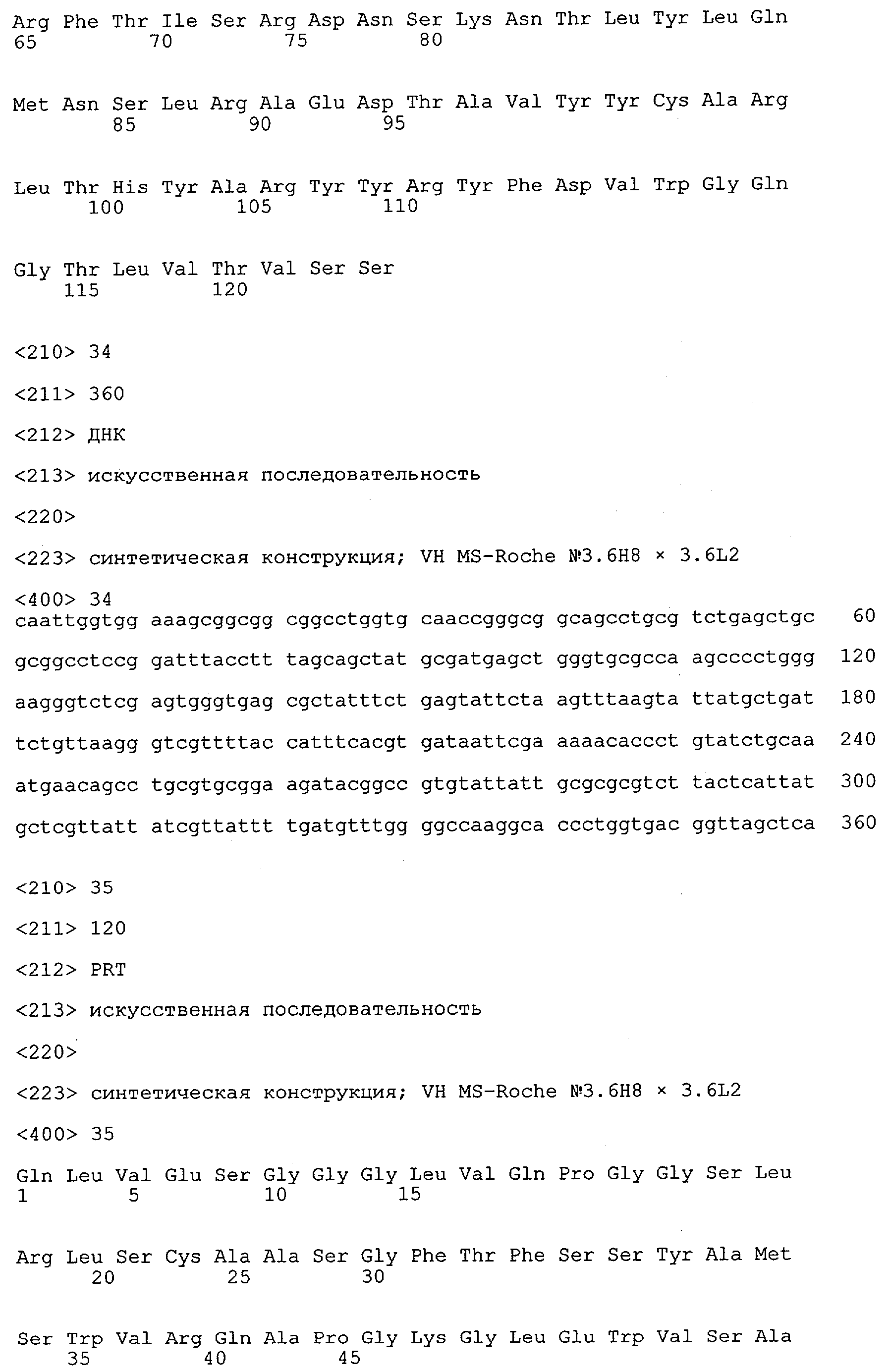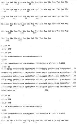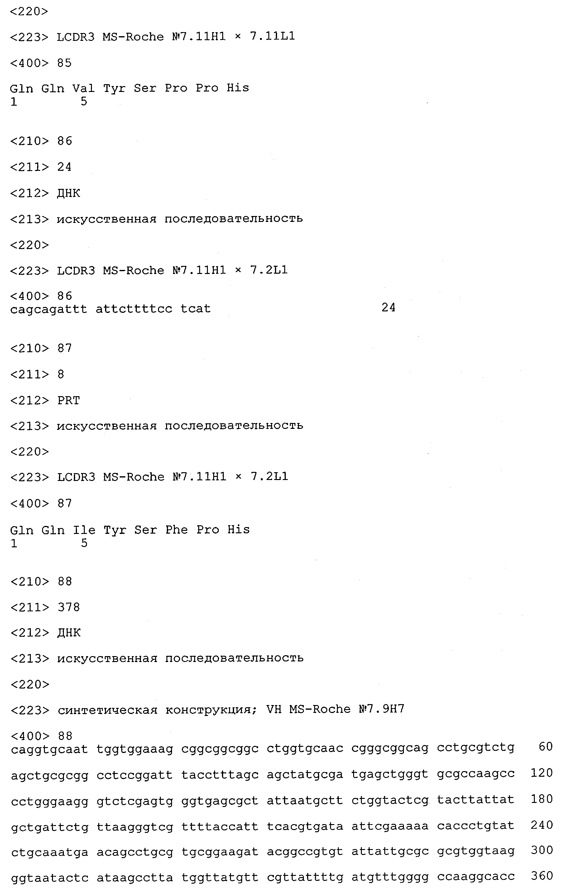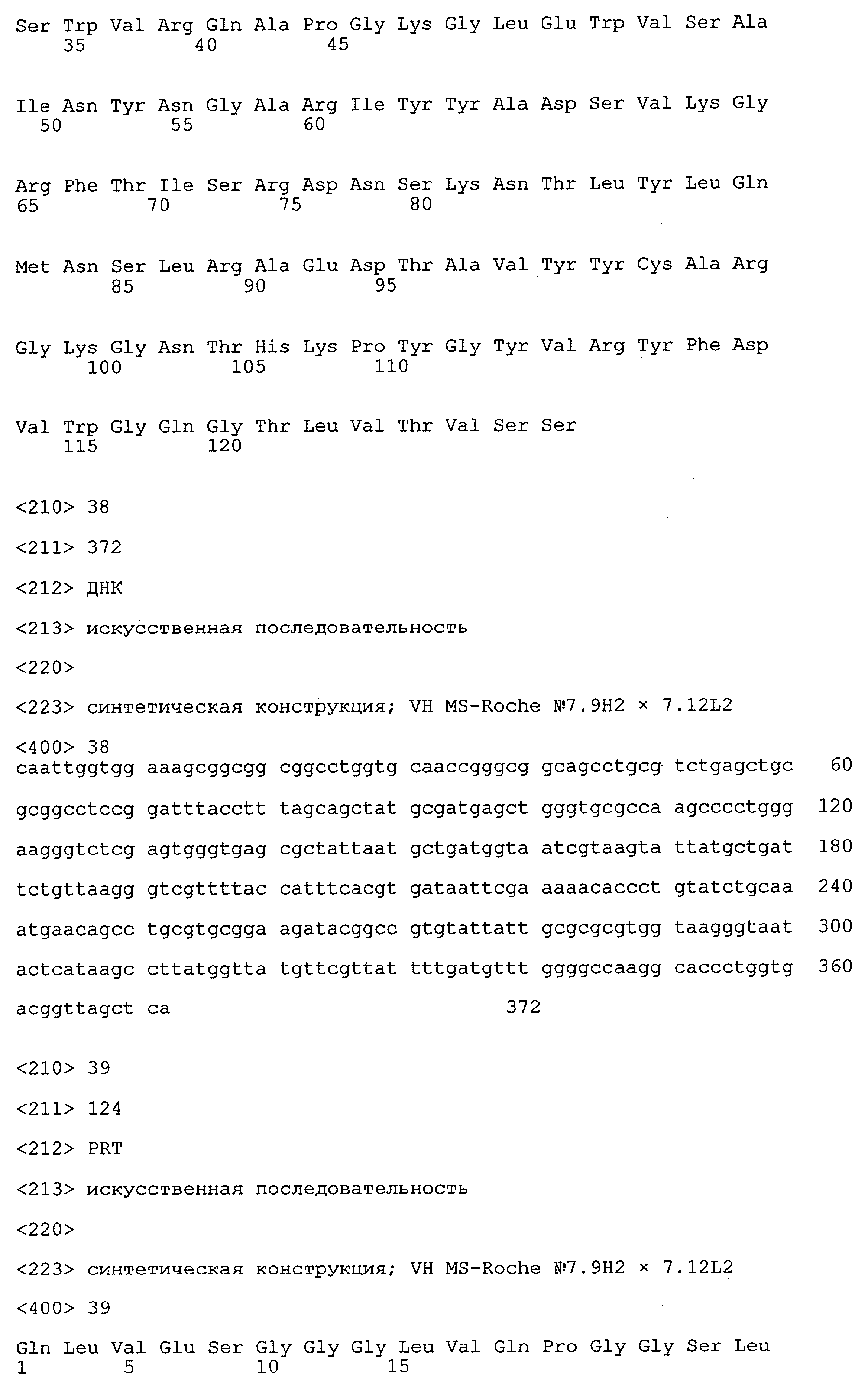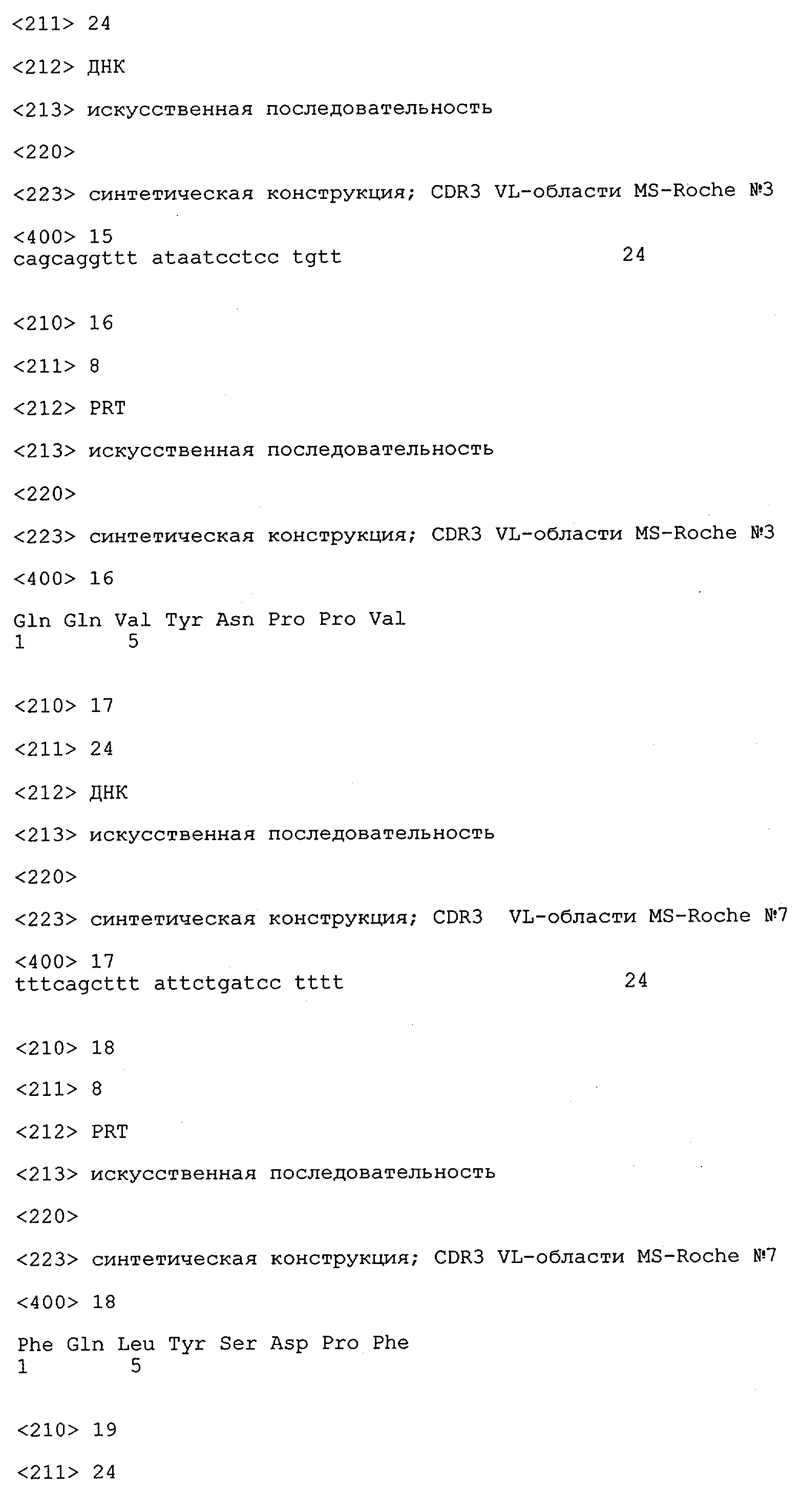Получение антител перекрестным клонированием проиллюстрировано также в приведенных ниже примерах. Перечисленные выше предпочтительные полученные перекрестным клонированием антитела/молекулы антител представляют собой оптимизированные/созревшие молекулы антител, выведенные из описанных родительских антител, в частности из MSR-3 и MSR-7. Кроме того, характерные CDR-последовательности и V-области полученных перекрестным клонированием молекул антител/антител представлены ниже в SEQ ID NO:32, 33, 46 и 47 (MSR 3.6H5×3.6.L2; VH-, VL-области); 34, 35, 48 и 49 (MSR 3.6H8×3.6.L2; VH-, VL-области); 36, 37, 50 и 51 (MSR 7.4H2×7.2.L1; VH-, VL-области); 38, 39, 52 и 53 (MSR 7.9H2×7.12.L2; VH-, VL-области); 40, 41, 54 и 55 (MSR №7-9H4×7.12.L2; VH-, VL-области); 42, 43, 56 и 57 (MSR №7.11Н1×7.11.L1; VH-, VL-области) и 44, 45, 58 и 59 (MSR №7.11H1×7.2.L1; VH-, VL-области). Соответствующие CDR3-участки этих особенно предпочтительных полученных перекрестным клонированием молекул антител представлены в SEQ ID NO:60-87. Для других молекул MSR-антител CDR-участки VH-, VL-области можно обнаружить ниже в таблицах 8 или 10 и в прилагаемом перечне последовательностей, в частности SEQ ID NO:32-95 для MS-R- антител/молекул антител №3.6Н5×3.6L2, №3.6Н8×3.6L2, №7.4Н2×7.2L1, №7.9Н2×7.12L2, №7.9Н4×7.12L2, №7.11Н1×7.11L1, №7.11Н1×7.2L1 и №7.9Н7 или SEQ ID NO:294-413 для MSR-R-антител/молекул антител №3.3Н1×3.4L1, №3.4Н1×3.4L9, №3.4Н3×3.4L7, №3.4Н3×3.4L9, №3.4Н7×3.4L9, №3.4Н7×3.4L7, №3.6Н5×3.6L1, №7.2Н2×7.2L1, №7.4Н2×7.12L2, №7.9Н2×7.2L1, №7.9Н2×7.12L1, №7.11Н2×7.2L1, №7.11Н2×7.9L1, №7.11Н2×7.12L1 или №8.1Н1×8.2L1. Таким образом, помимо указанных выше VH-областей предпочтительные молекулы антител, предлагаемые в изобретении, могут содержать VH-области, указанные в любой из SEQ ID NO:294-323. Аналогично этому, в SEQ ID NO:324-353 представлены VL-области, которые помимо указанных выше VL-областей, могут нести молекулы антител, предлагаемые в изобретении. Соответствующие CDR-участки указаны выше, а также могут быть представлены последовательностями, указанными в SEQ ID NO:354-413.