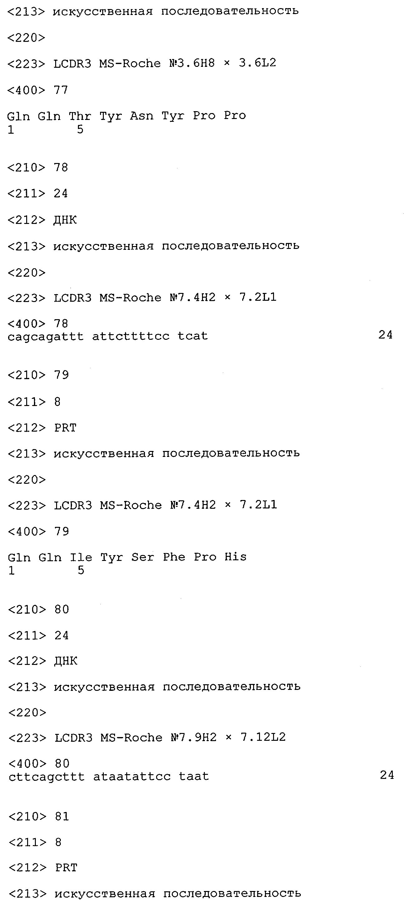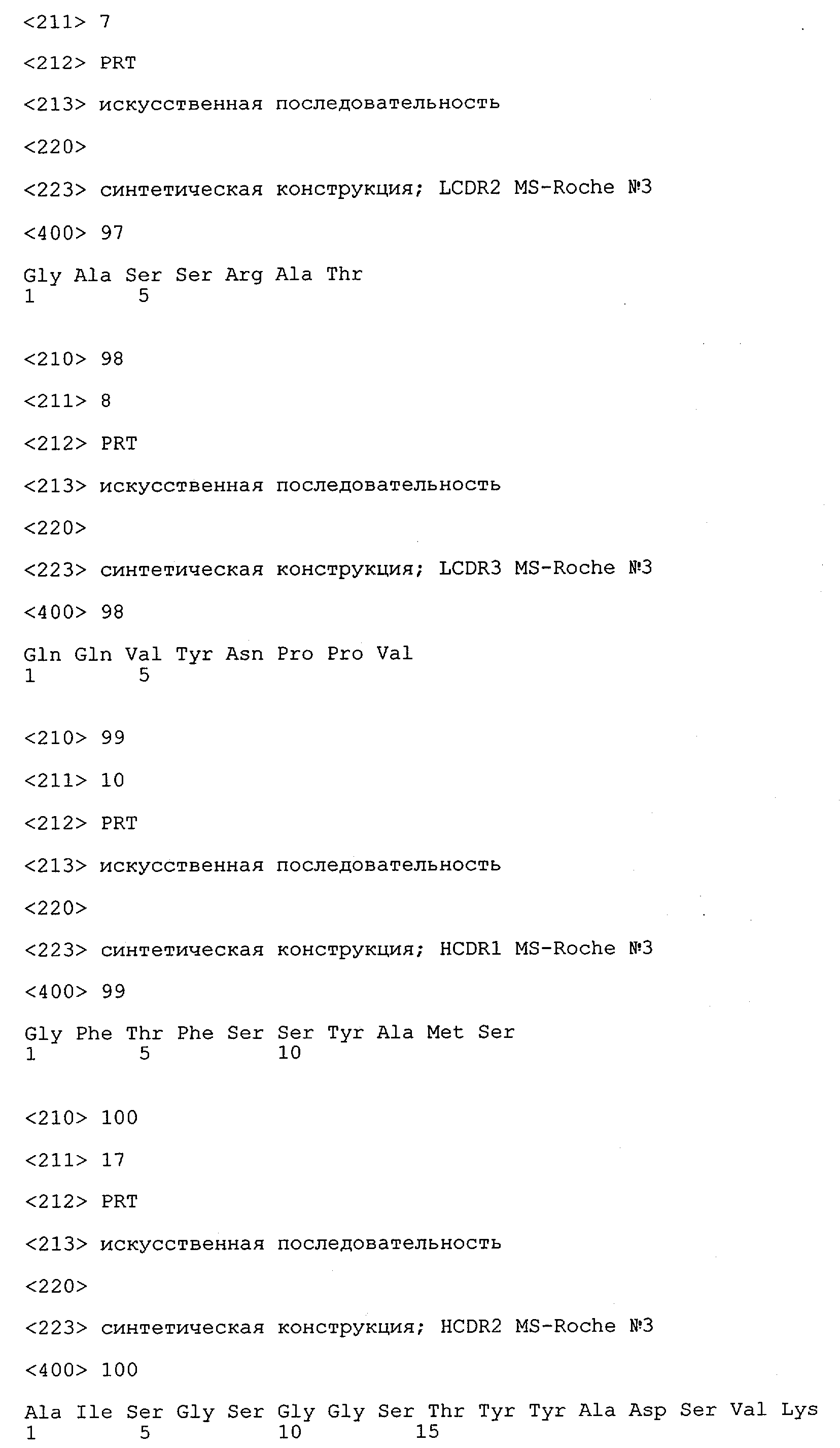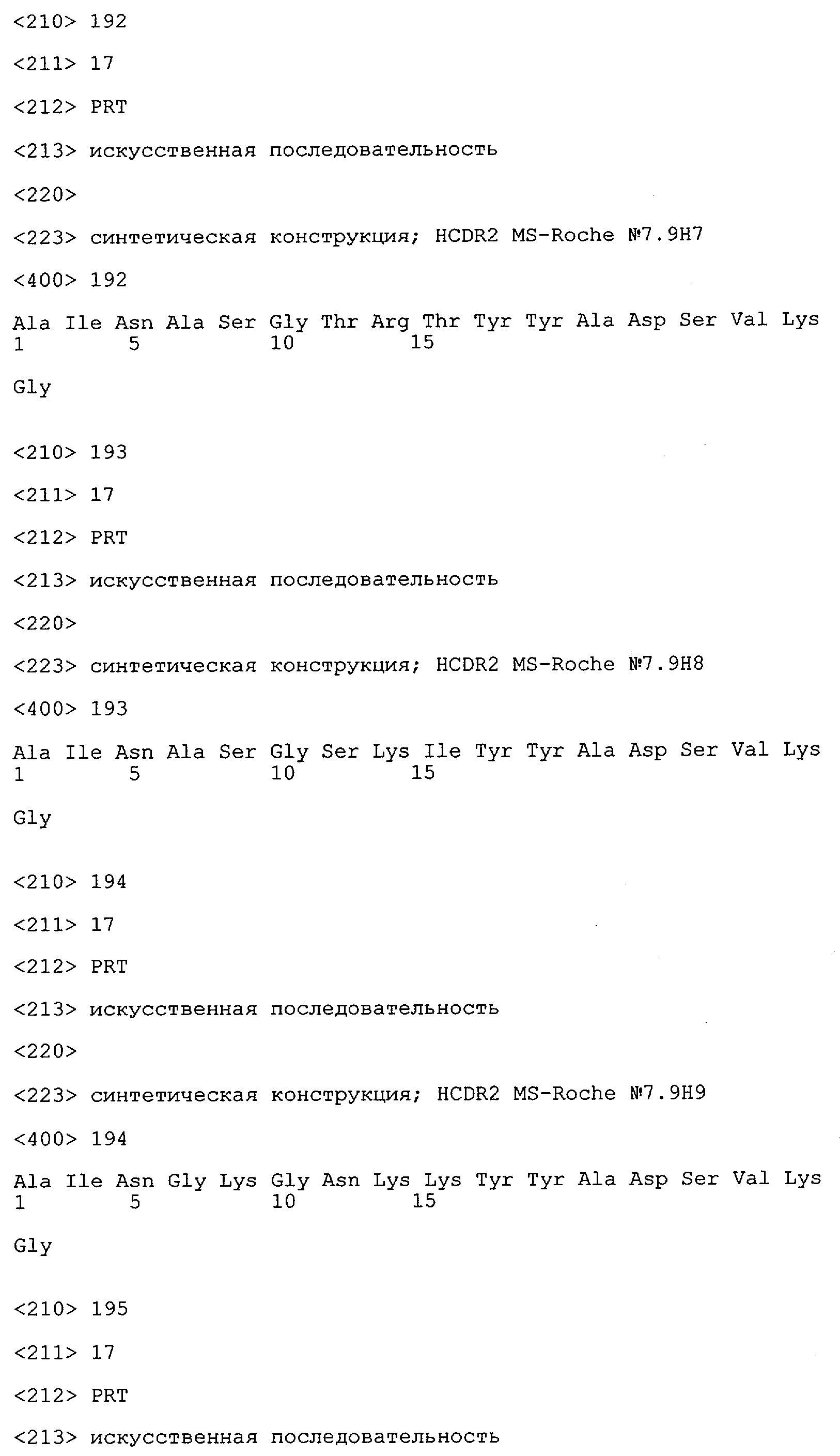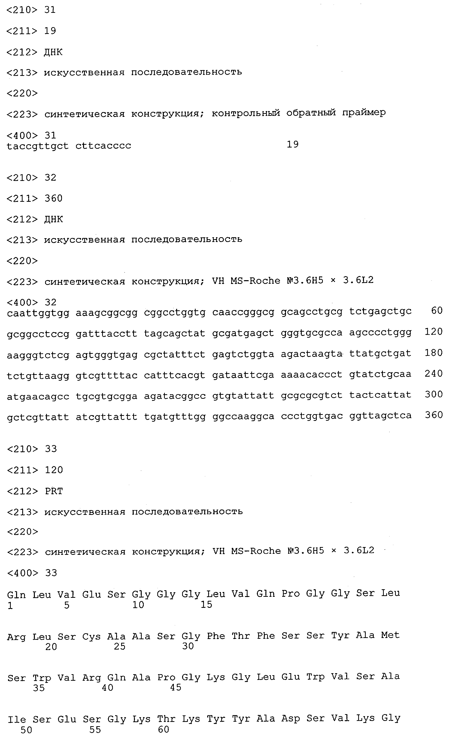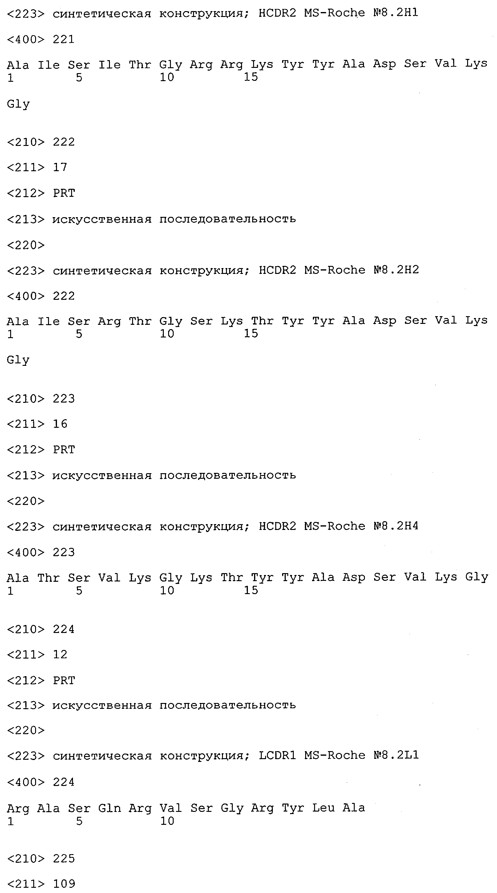 Получение антител перекрестным клонированием проиллюстрировано также в приведенных ниже примерах. Перечисленные выше предпочтительные полученные перекрестным клонированием антитела/молекулы антител представляют собой оптимизированные/созревшие молекулы антител, выведенные из описанных родительских антител, в частности из MSR-3 и MSR-7. Кроме того, характерные CDR-последовательности и V-области полученных перекрестным клонированием молекул антител/антител представлены ниже в SEQ ID NO:32, 33, 46 и 47 (MSR 3.6H5×3.6.L2; VH-, VL-области); 34, 35, 48 и 49 (MSR 3.6H8×3.6.L2; VH-, VL-области); 36, 37, 50 и 51 (MSR 7.4H2×7.2.L1; VH-, VL-области); 38, 39, 52 и 53 (MSR 7.9H2×7.12.L2; VH-, VL-области); 40, 41, 54 и 55 (MSR №7-9H4×7.12.L2; VH-, VL-области); 42, 43, 56 и 57 (MSR №7.11Н1×7.11.L1; VH-, VL-области) и 44, 45, 58 и 59 (MSR №7.11H1×7.2.L1; VH-, VL-области). Соответствующие CDR3-участки этих особенно предпочтительных полученных перекрестным клонированием молекул антител представлены в SEQ ID NO:60-87. Для других молекул MSR-антител CDR-участки VH-, VL-области можно обнаружить ниже в таблицах 8 или 10 и в прилагаемом перечне последовательностей, в частности SEQ ID NO:32-95 для MS-R- антител/молекул антител №3.6Н5×3.6L2, №3.6Н8×3.6L2, №7.4Н2×7.2L1, №7.9Н2×7.12L2, №7.9Н4×7.12L2, №7.11Н1×7.11L1, №7.11Н1×7.2L1 и №7.9Н7 или SEQ ID NO:294-413 для MSR-R-антител/молекул антител №3.3Н1×3.4L1, №3.4Н1×3.4L9, №3.4Н3×3.4L7, №3.4Н3×3.4L9, №3.4Н7×3.4L9, №3.4Н7×3.4L7, №3.6Н5×3.6L1, №7.2Н2×7.2L1, №7.4Н2×7.12L2, №7.9Н2×7.2L1, №7.9Н2×7.12L1, №7.11Н2×7.2L1, №7.11Н2×7.9L1, №7.11Н2×7.12L1 или №8.1Н1×8.2L1. Таким образом, помимо указанных выше VH-областей предпочтительные молекулы антител, предлагаемые в изобретении, могут содержать VH-области, указанные в любой из SEQ ID NO:294-323. Аналогично этому, в SEQ ID NO:324-353 представлены VL-области, которые помимо указанных выше VL-областей, могут нести молекулы антител, предлагаемые в изобретении. Соответствующие CDR-участки указаны выше, а также могут быть представлены последовательностями, указанными в SEQ ID NO:354-413.