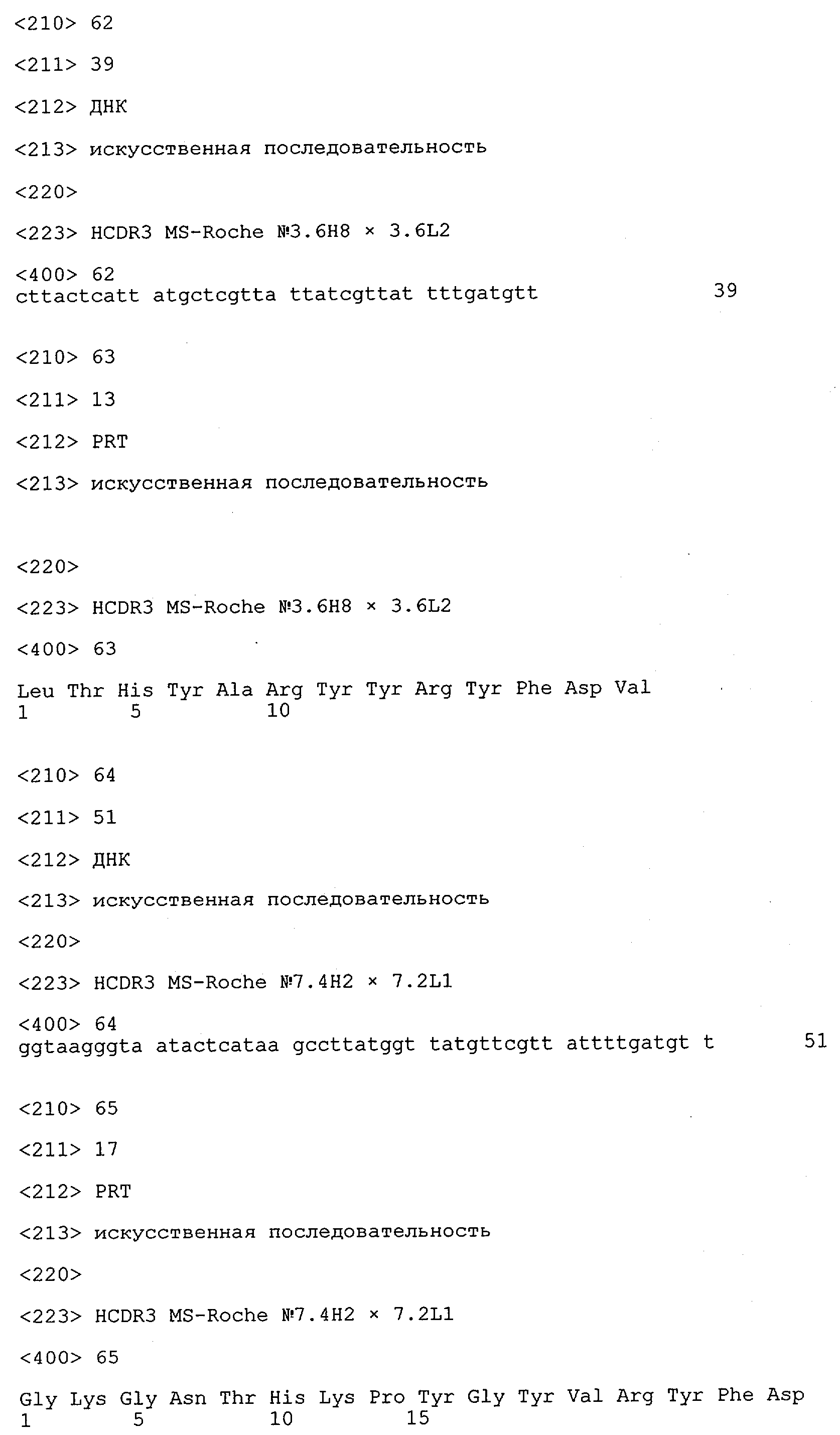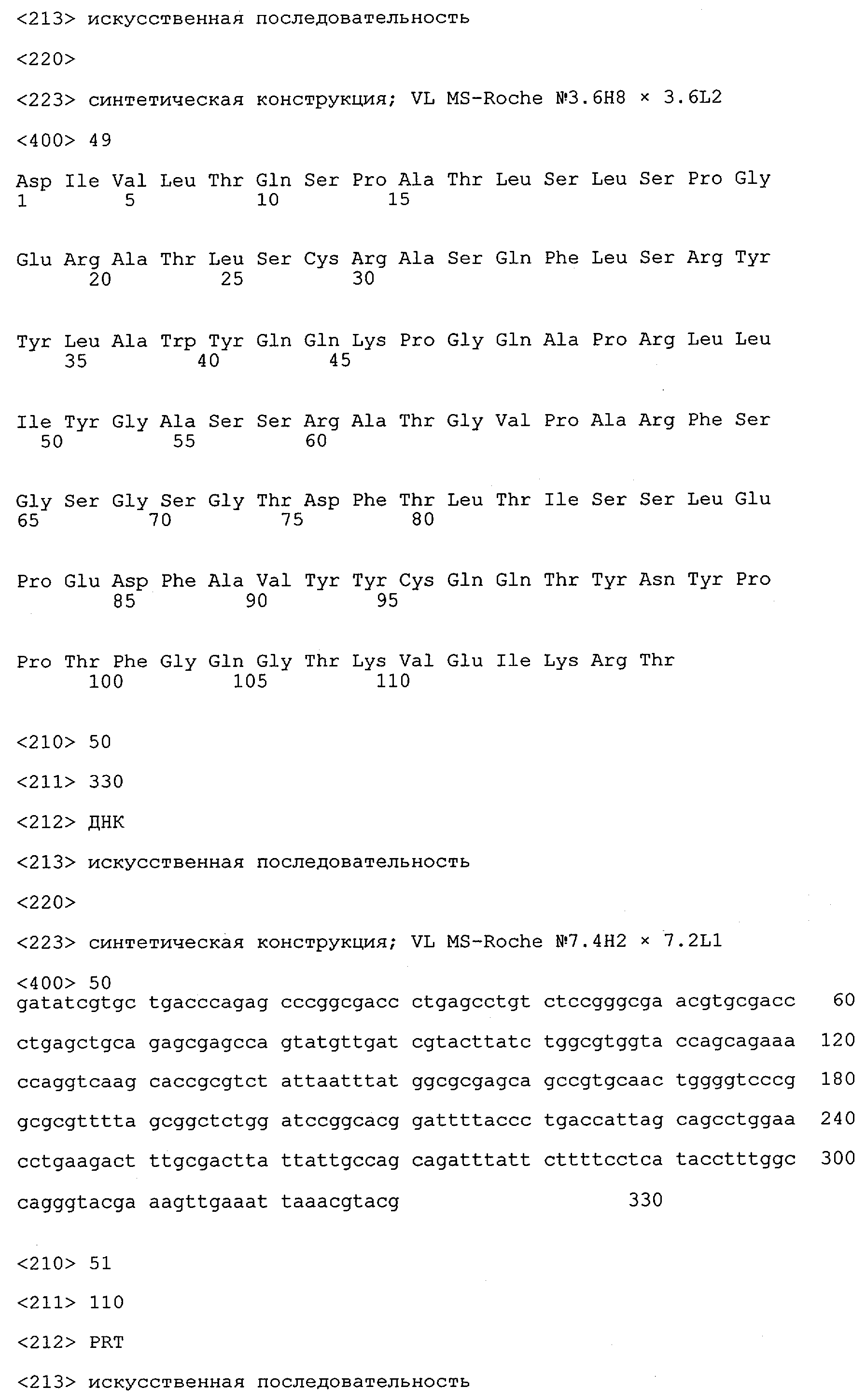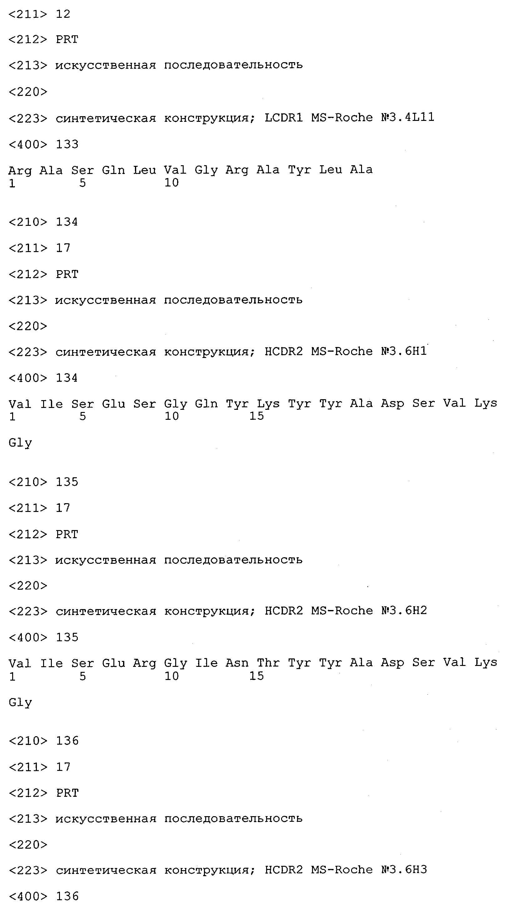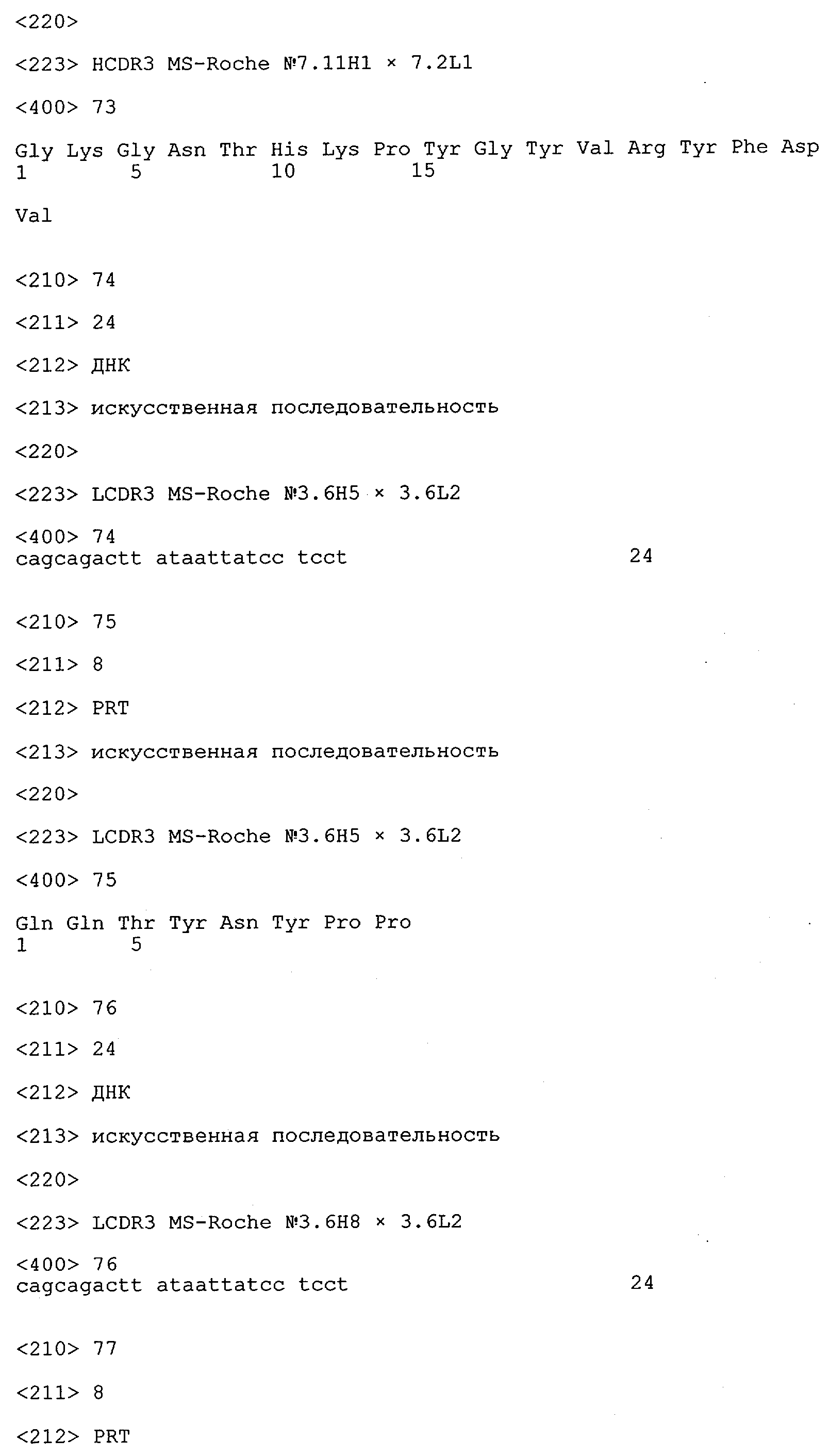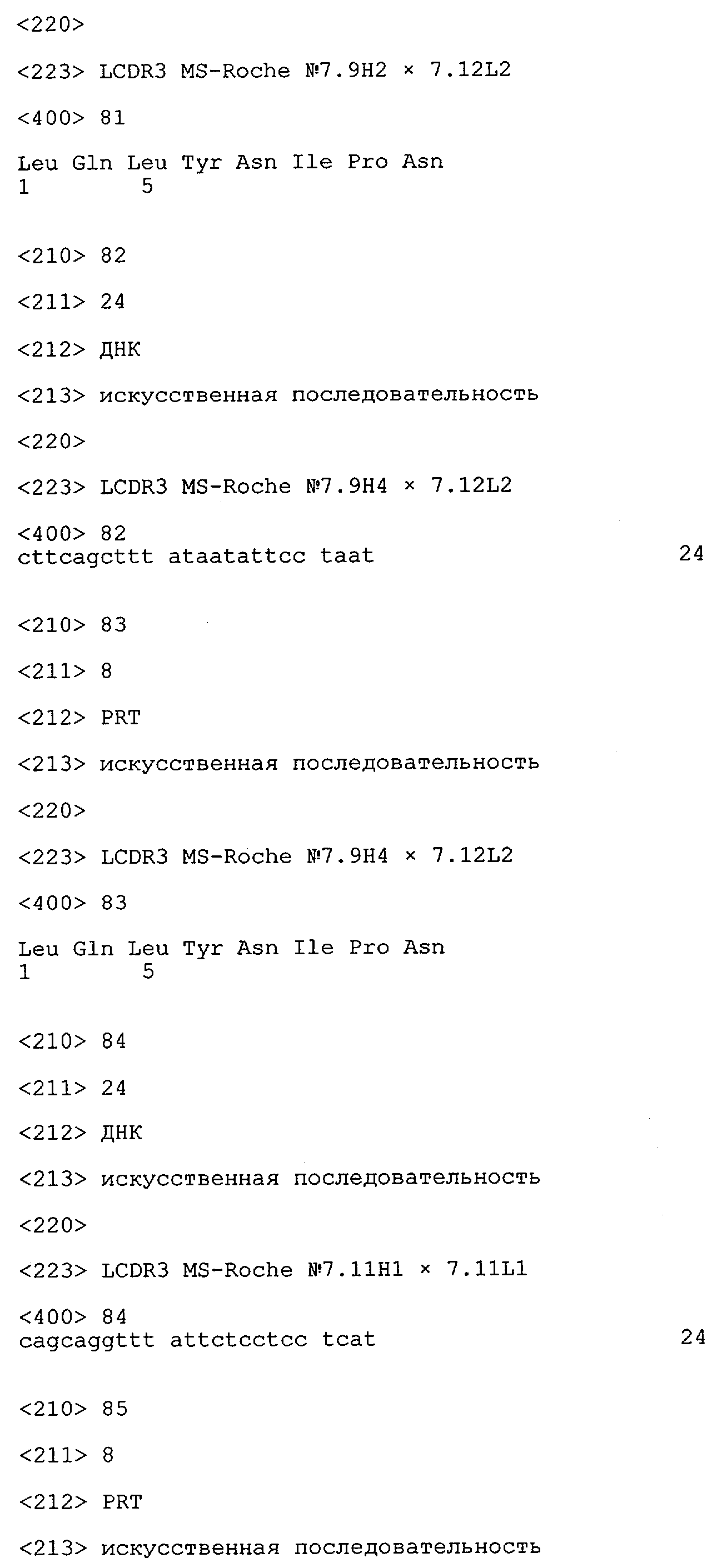 Получение антител перекрестным клонированием проиллюстрировано также в приведенных ниже примерах. Перечисленные выше предпочтительные полученные перекрестным клонированием антитела/молекулы антител представляют собой оптимизированные/созревшие молекулы антител, выведенные из описанных родительских антител, в частности из MSR-3 и MSR-7. Кроме того, характерные CDR-последовательности и V-области полученных перекрестным клонированием молекул антител/антител представлены ниже в SEQ ID NO:32, 33, 46 и 47 (MSR 3.6H5×3.6.L2; VH-, VL-области); 34, 35, 48 и 49 (MSR 3.6H8×3.6.L2; VH-, VL-области); 36, 37, 50 и 51 (MSR 7.4H2×7.2.L1; VH-, VL-области); 38, 39, 52 и 53 (MSR 7.9H2×7.12.L2; VH-, VL-области); 40, 41, 54 и 55 (MSR №7-9H4×7.12.L2; VH-, VL-области); 42, 43, 56 и 57 (MSR №7.11Н1×7.11.L1; VH-, VL-области) и 44, 45, 58 и 59 (MSR №7.11H1×7.2.L1; VH-, VL-области). Соответствующие CDR3-участки этих особенно предпочтительных полученных перекрестным клонированием молекул антител представлены в SEQ ID NO:60-87. Для других молекул MSR-антител CDR-участки VH-, VL-области можно обнаружить ниже в таблицах 8 или 10 и в прилагаемом перечне последовательностей, в частности SEQ ID NO:32-95 для MS-R- антител/молекул антител №3.6Н5×3.6L2, №3.6Н8×3.6L2, №7.4Н2×7.2L1, №7.9Н2×7.12L2, №7.9Н4×7.12L2, №7.11Н1×7.11L1, №7.11Н1×7.2L1 и №7.9Н7 или SEQ ID NO:294-413 для MSR-R-антител/молекул антител №3.3Н1×3.4L1, №3.4Н1×3.4L9, №3.4Н3×3.4L7, №3.4Н3×3.4L9, №3.4Н7×3.4L9, №3.4Н7×3.4L7, №3.6Н5×3.6L1, №7.2Н2×7.2L1, №7.4Н2×7.12L2, №7.9Н2×7.2L1, №7.9Н2×7.12L1, №7.11Н2×7.2L1, №7.11Н2×7.9L1, №7.11Н2×7.12L1 или №8.1Н1×8.2L1. Таким образом, помимо указанных выше VH-областей предпочтительные молекулы антител, предлагаемые в изобретении, могут содержать VH-области, указанные в любой из SEQ ID NO:294-323. Аналогично этому, в SEQ ID NO:324-353 представлены VL-области, которые помимо указанных выше VL-областей, могут нести молекулы антител, предлагаемые в изобретении. Соответствующие CDR-участки указаны выше, а также могут быть представлены последовательностями, указанными в SEQ ID NO:354-413.