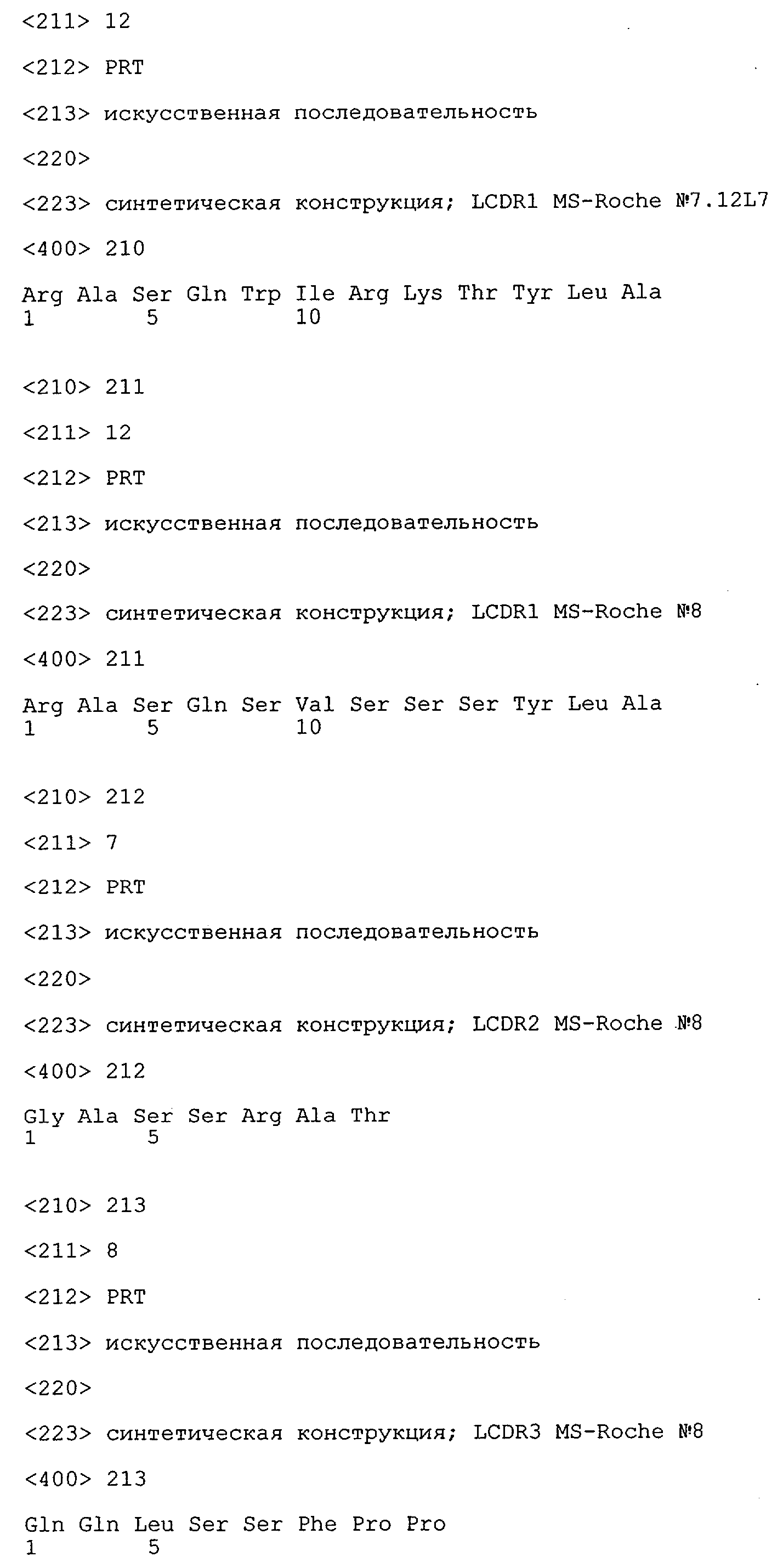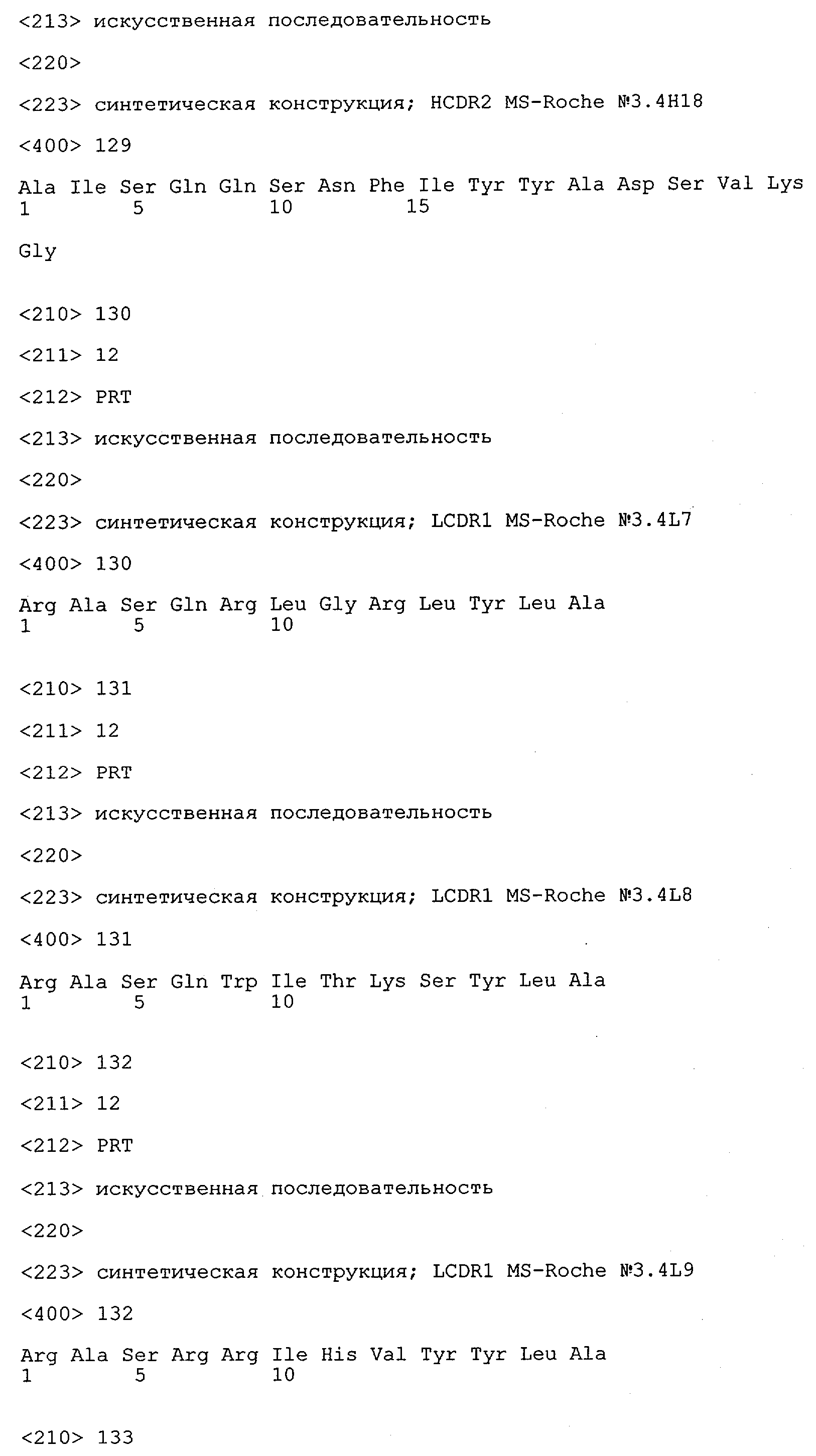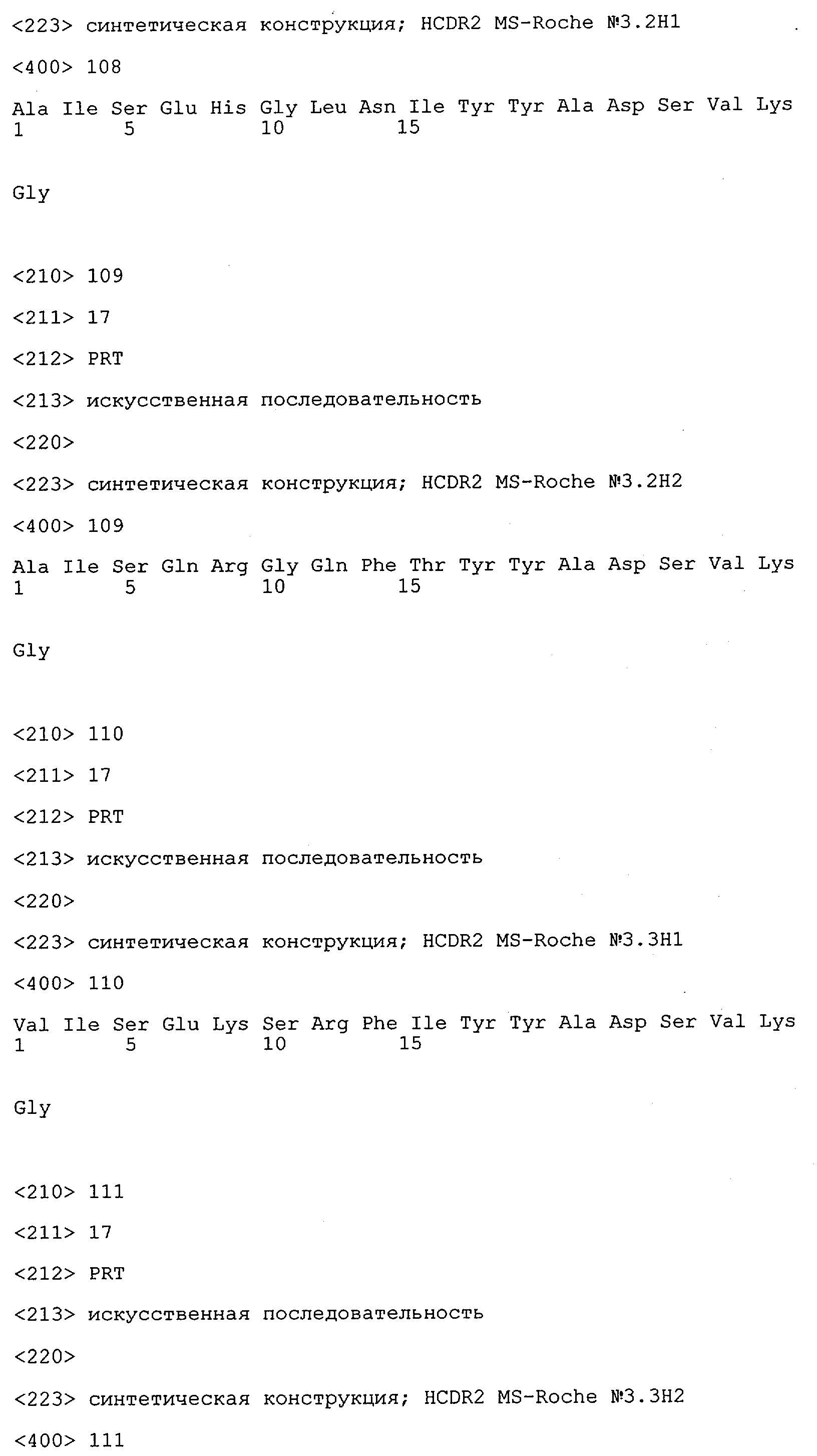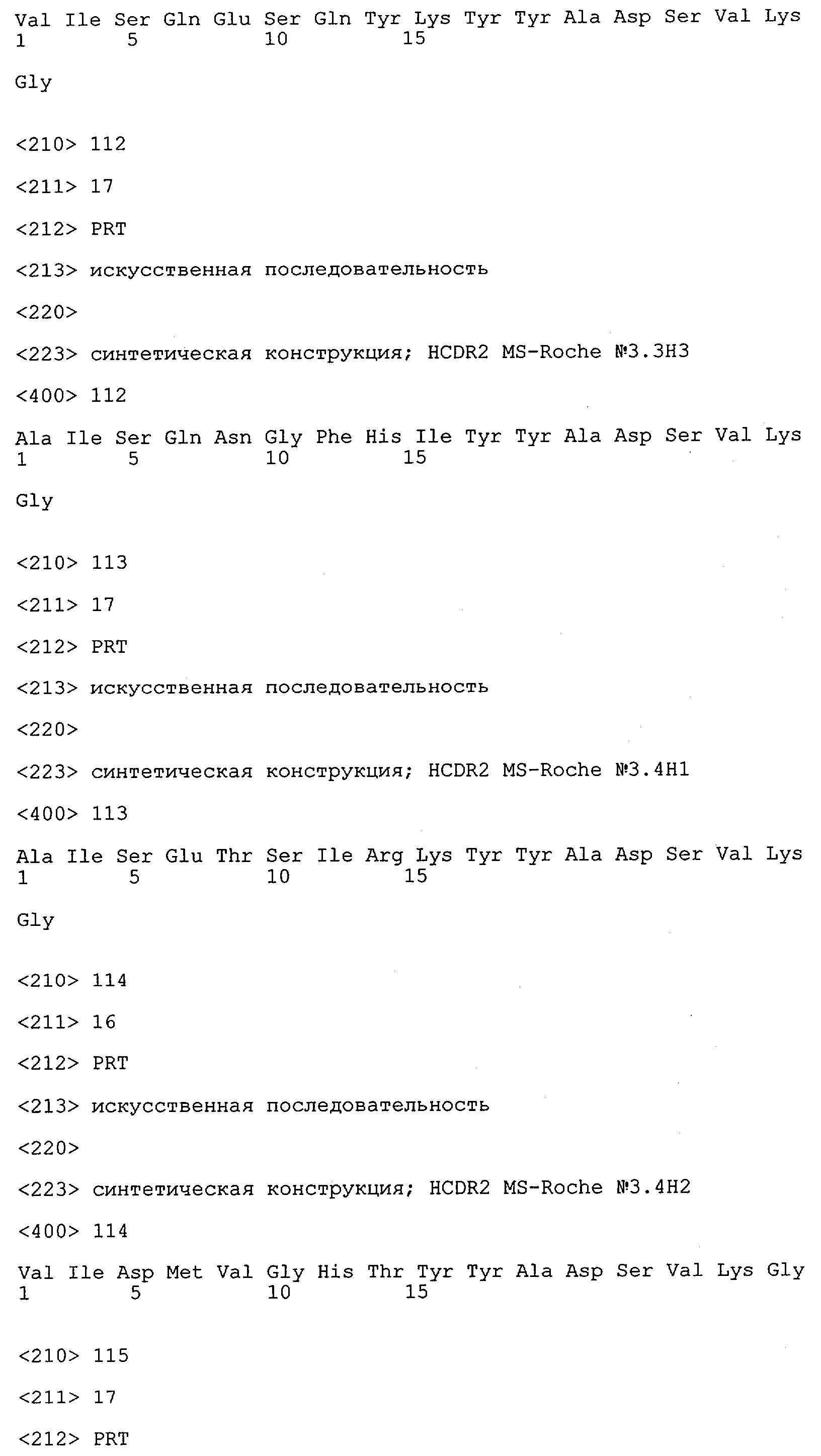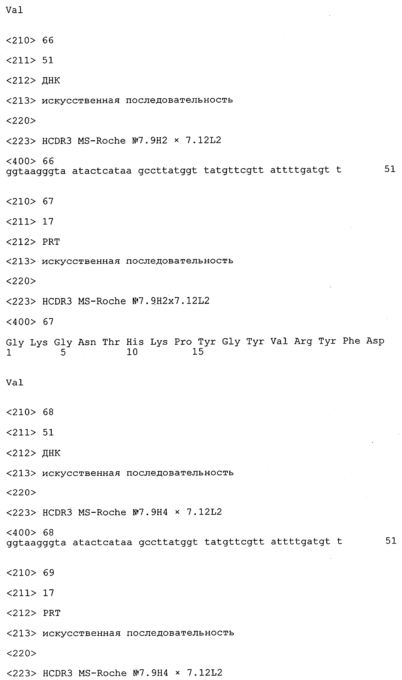 Получение антител перекрестным клонированием проиллюстрировано также в приведенных ниже примерах. Перечисленные выше предпочтительные полученные перекрестным клонированием антитела/молекулы антител представляют собой оптимизированные/созревшие молекулы антител, выведенные из описанных родительских антител, в частности из MSR-3 и MSR-7. Кроме того, характерные CDR-последовательности и V-области полученных перекрестным клонированием молекул антител/антител представлены ниже в SEQ ID NO:32, 33, 46 и 47 (MSR 3.6H5×3.6.L2; VH-, VL-области); 34, 35, 48 и 49 (MSR 3.6H8×3.6.L2; VH-, VL-области); 36, 37, 50 и 51 (MSR 7.4H2×7.2.L1; VH-, VL-области); 38, 39, 52 и 53 (MSR 7.9H2×7.12.L2; VH-, VL-области); 40, 41, 54 и 55 (MSR №7-9H4×7.12.L2; VH-, VL-области); 42, 43, 56 и 57 (MSR №7.11Н1×7.11.L1; VH-, VL-области) и 44, 45, 58 и 59 (MSR №7.11H1×7.2.L1; VH-, VL-области). Соответствующие CDR3-участки этих особенно предпочтительных полученных перекрестным клонированием молекул антител представлены в SEQ ID NO:60-87. Для других молекул MSR-антител CDR-участки VH-, VL-области можно обнаружить ниже в таблицах 8 или 10 и в прилагаемом перечне последовательностей, в частности SEQ ID NO:32-95 для MS-R- антител/молекул антител №3.6Н5×3.6L2, №3.6Н8×3.6L2, №7.4Н2×7.2L1, №7.9Н2×7.12L2, №7.9Н4×7.12L2, №7.11Н1×7.11L1, №7.11Н1×7.2L1 и №7.9Н7 или SEQ ID NO:294-413 для MSR-R-антител/молекул антител №3.3Н1×3.4L1, №3.4Н1×3.4L9, №3.4Н3×3.4L7, №3.4Н3×3.4L9, №3.4Н7×3.4L9, №3.4Н7×3.4L7, №3.6Н5×3.6L1, №7.2Н2×7.2L1, №7.4Н2×7.12L2, №7.9Н2×7.2L1, №7.9Н2×7.12L1, №7.11Н2×7.2L1, №7.11Н2×7.9L1, №7.11Н2×7.12L1 или №8.1Н1×8.2L1. Таким образом, помимо указанных выше VH-областей предпочтительные молекулы антител, предлагаемые в изобретении, могут содержать VH-области, указанные в любой из SEQ ID NO:294-323. Аналогично этому, в SEQ ID NO:324-353 представлены VL-области, которые помимо указанных выше VL-областей, могут нести молекулы антител, предлагаемые в изобретении. Соответствующие CDR-участки указаны выше, а также могут быть представлены последовательностями, указанными в SEQ ID NO:354-413.