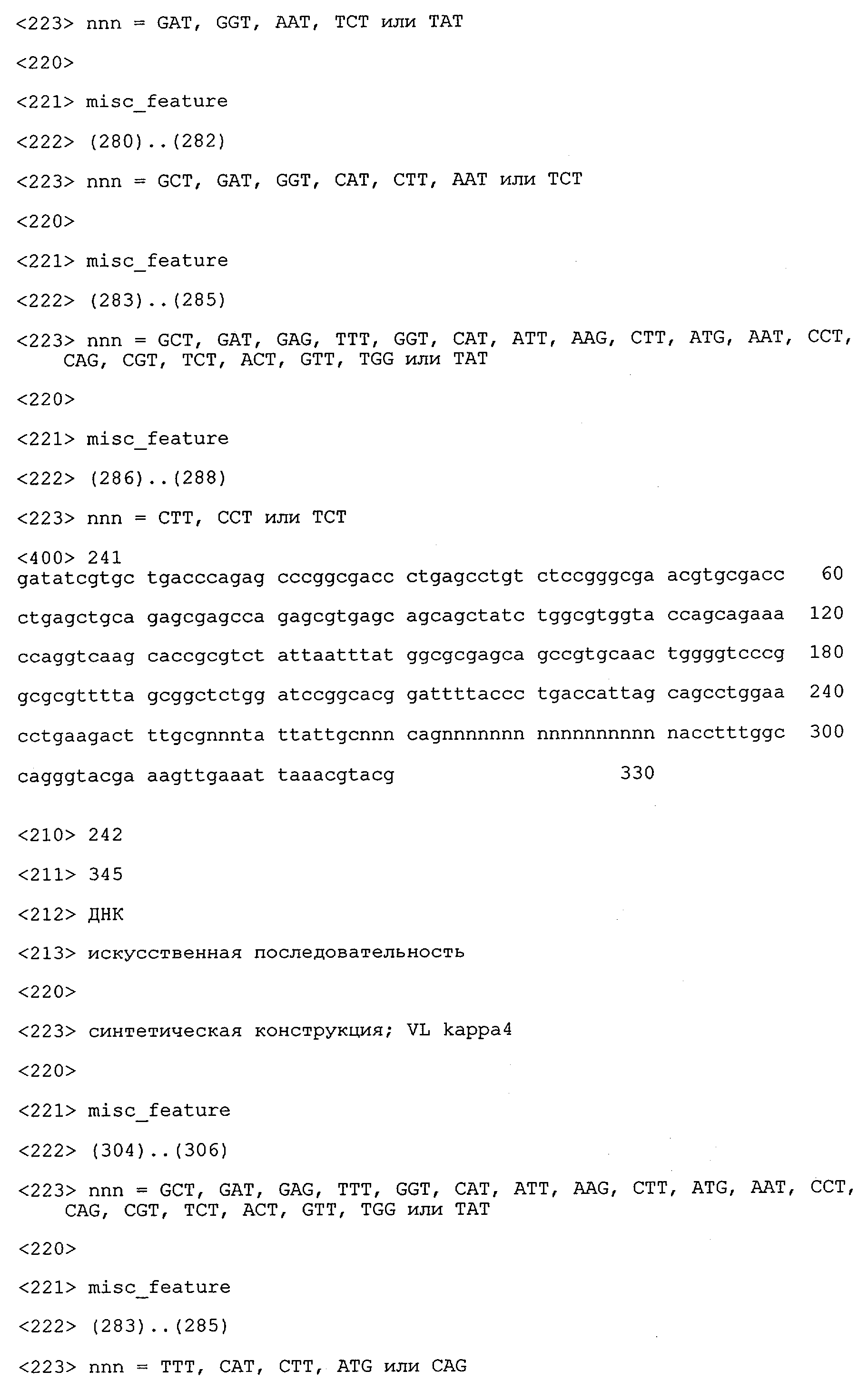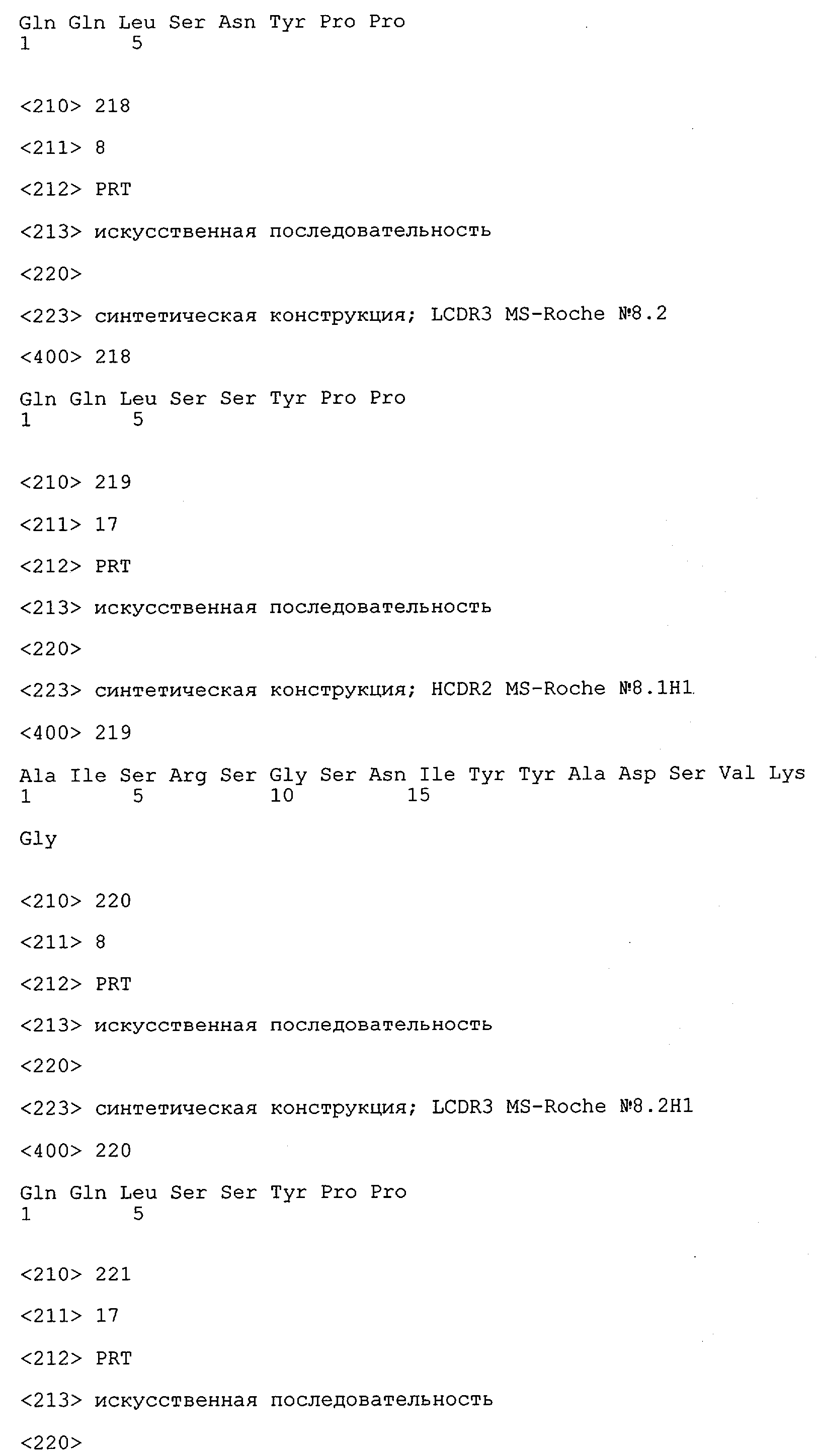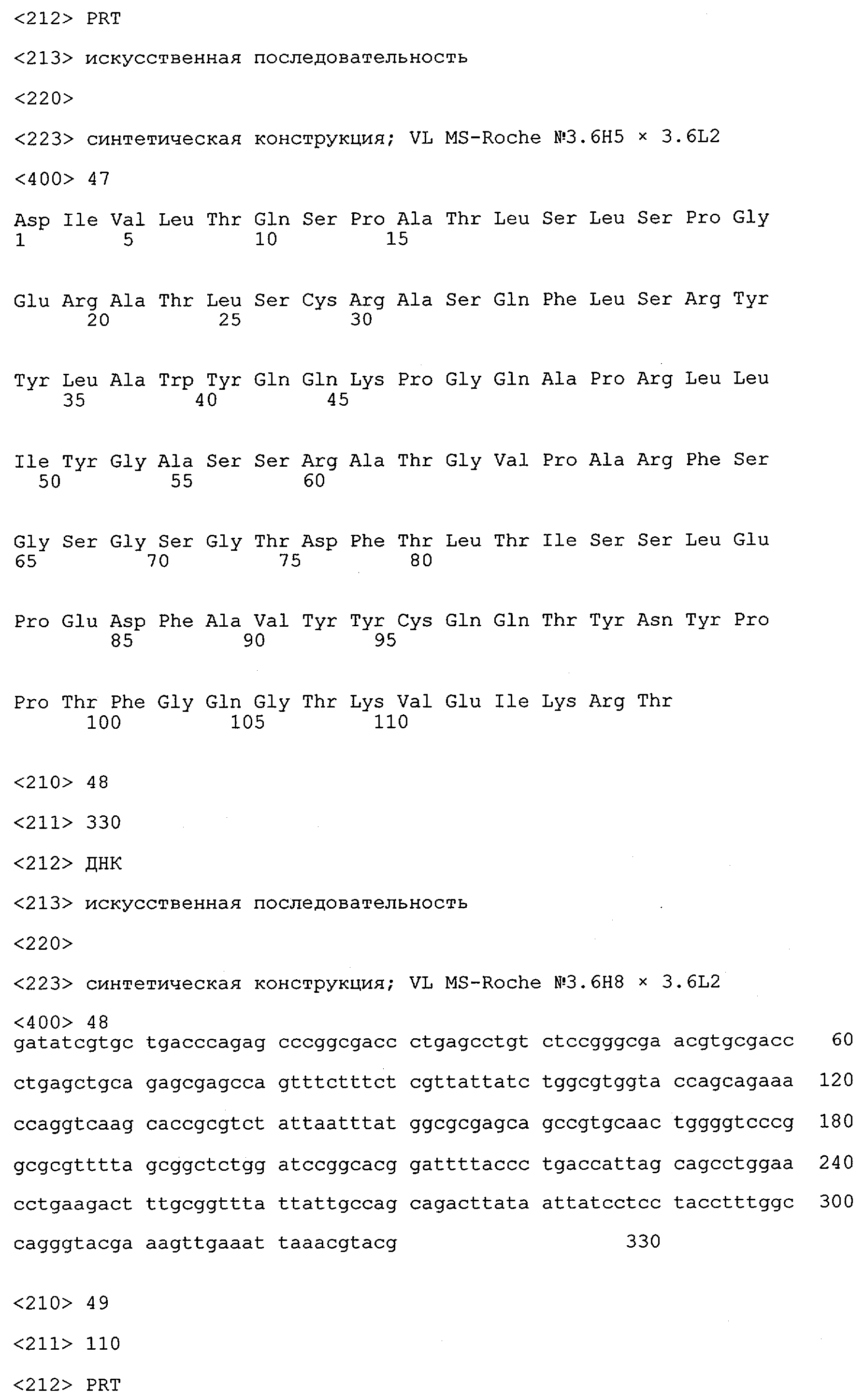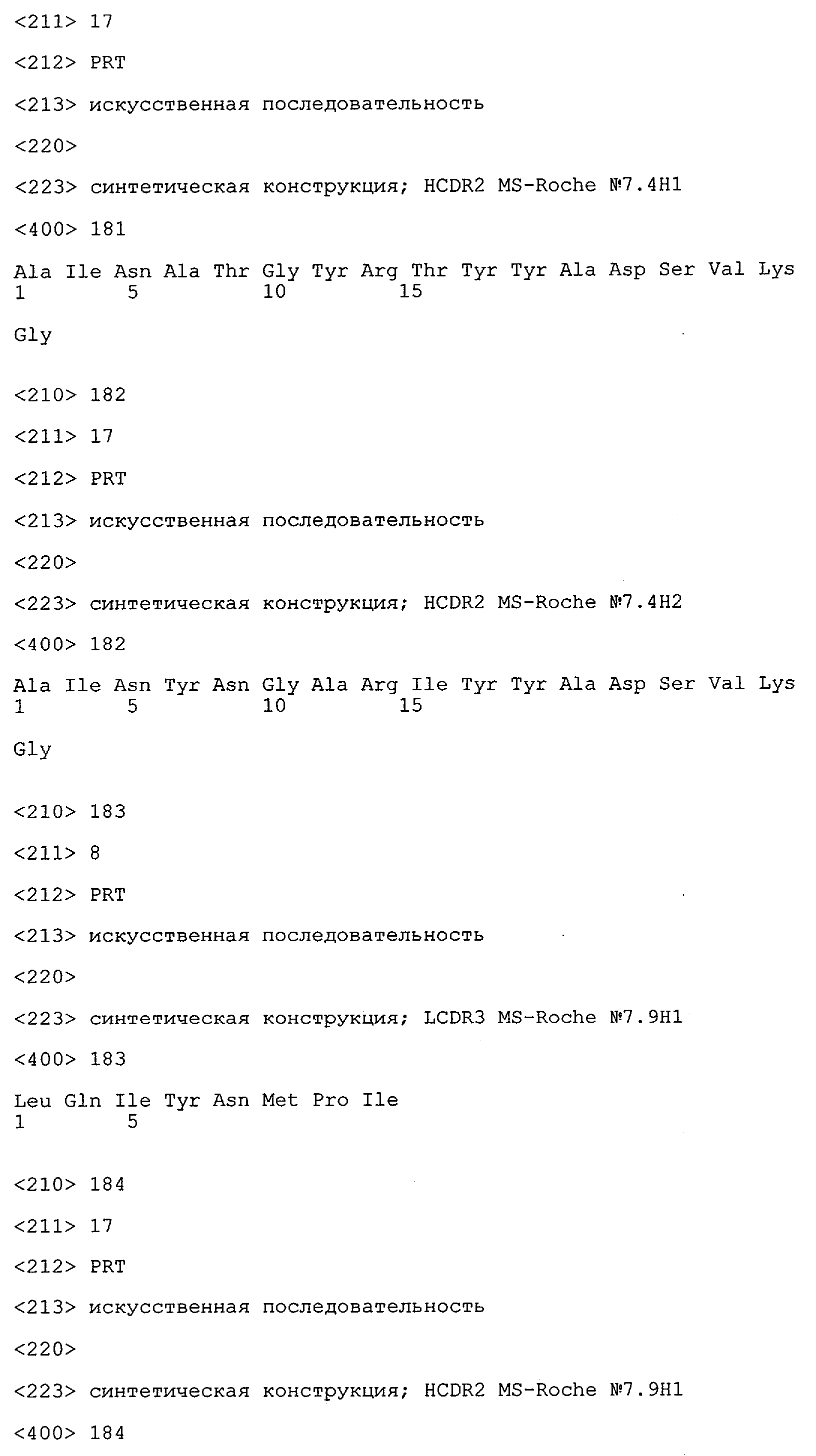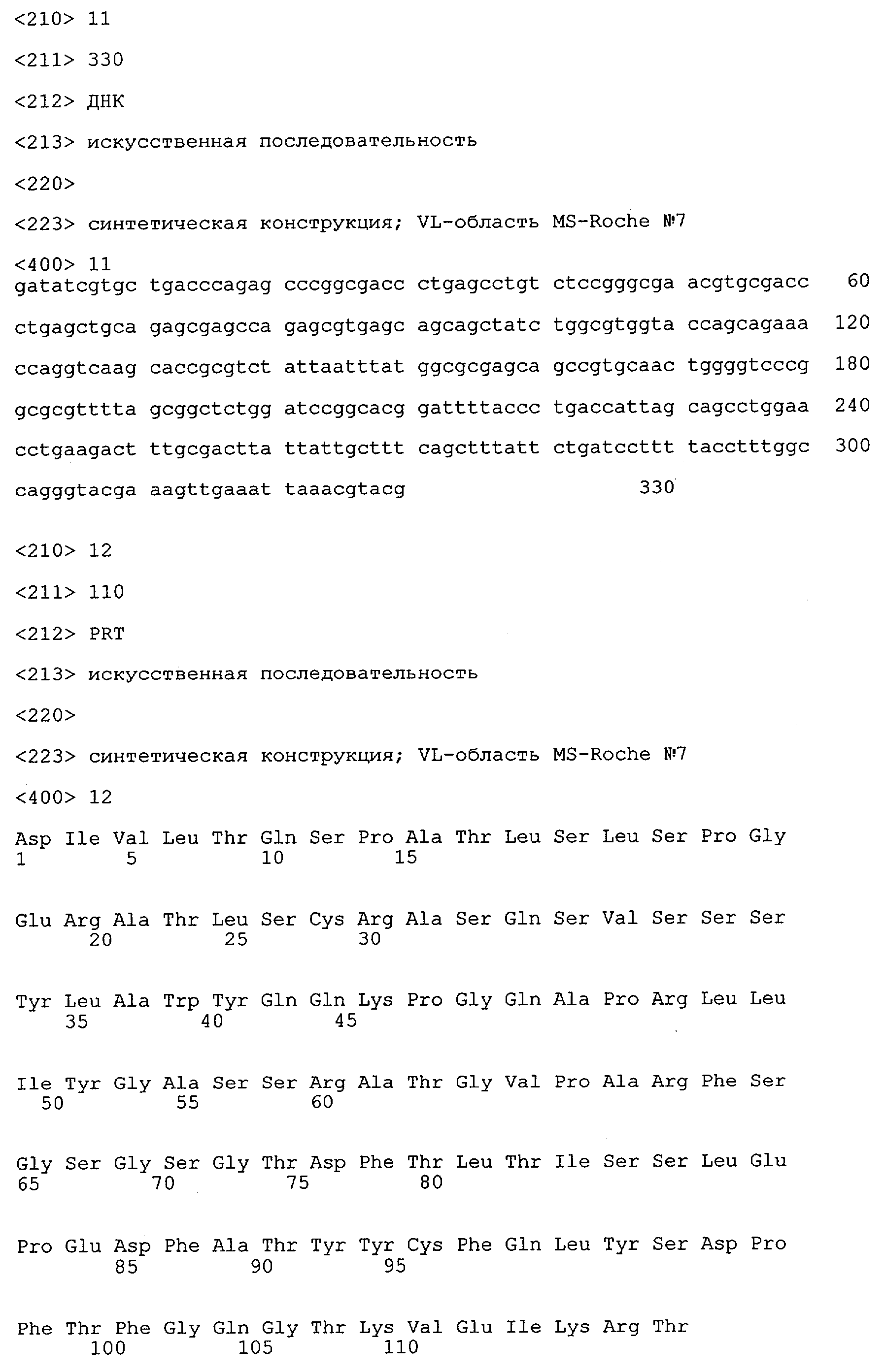 Получение антител перекрестным клонированием проиллюстрировано также в приведенных ниже примерах. Перечисленные выше предпочтительные полученные перекрестным клонированием антитела/молекулы антител представляют собой оптимизированные/созревшие молекулы антител, выведенные из описанных родительских антител, в частности из MSR-3 и MSR-7. Кроме того, характерные CDR-последовательности и V-области полученных перекрестным клонированием молекул антител/антител представлены ниже в SEQ ID NO:32, 33, 46 и 47 (MSR 3.6H5×3.6.L2; VH-, VL-области); 34, 35, 48 и 49 (MSR 3.6H8×3.6.L2; VH-, VL-области); 36, 37, 50 и 51 (MSR 7.4H2×7.2.L1; VH-, VL-области); 38, 39, 52 и 53 (MSR 7.9H2×7.12.L2; VH-, VL-области); 40, 41, 54 и 55 (MSR №7-9H4×7.12.L2; VH-, VL-области); 42, 43, 56 и 57 (MSR №7.11Н1×7.11.L1; VH-, VL-области) и 44, 45, 58 и 59 (MSR №7.11H1×7.2.L1; VH-, VL-области). Соответствующие CDR3-участки этих особенно предпочтительных полученных перекрестным клонированием молекул антител представлены в SEQ ID NO:60-87. Для других молекул MSR-антител CDR-участки VH-, VL-области можно обнаружить ниже в таблицах 8 или 10 и в прилагаемом перечне последовательностей, в частности SEQ ID NO:32-95 для MS-R- антител/молекул антител №3.6Н5×3.6L2, №3.6Н8×3.6L2, №7.4Н2×7.2L1, №7.9Н2×7.12L2, №7.9Н4×7.12L2, №7.11Н1×7.11L1, №7.11Н1×7.2L1 и №7.9Н7 или SEQ ID NO:294-413 для MSR-R-антител/молекул антител №3.3Н1×3.4L1, №3.4Н1×3.4L9, №3.4Н3×3.4L7, №3.4Н3×3.4L9, №3.4Н7×3.4L9, №3.4Н7×3.4L7, №3.6Н5×3.6L1, №7.2Н2×7.2L1, №7.4Н2×7.12L2, №7.9Н2×7.2L1, №7.9Н2×7.12L1, №7.11Н2×7.2L1, №7.11Н2×7.9L1, №7.11Н2×7.12L1 или №8.1Н1×8.2L1. Таким образом, помимо указанных выше VH-областей предпочтительные молекулы антител, предлагаемые в изобретении, могут содержать VH-области, указанные в любой из SEQ ID NO:294-323. Аналогично этому, в SEQ ID NO:324-353 представлены VL-области, которые помимо указанных выше VL-областей, могут нести молекулы антител, предлагаемые в изобретении. Соответствующие CDR-участки указаны выше, а также могут быть представлены последовательностями, указанными в SEQ ID NO:354-413.