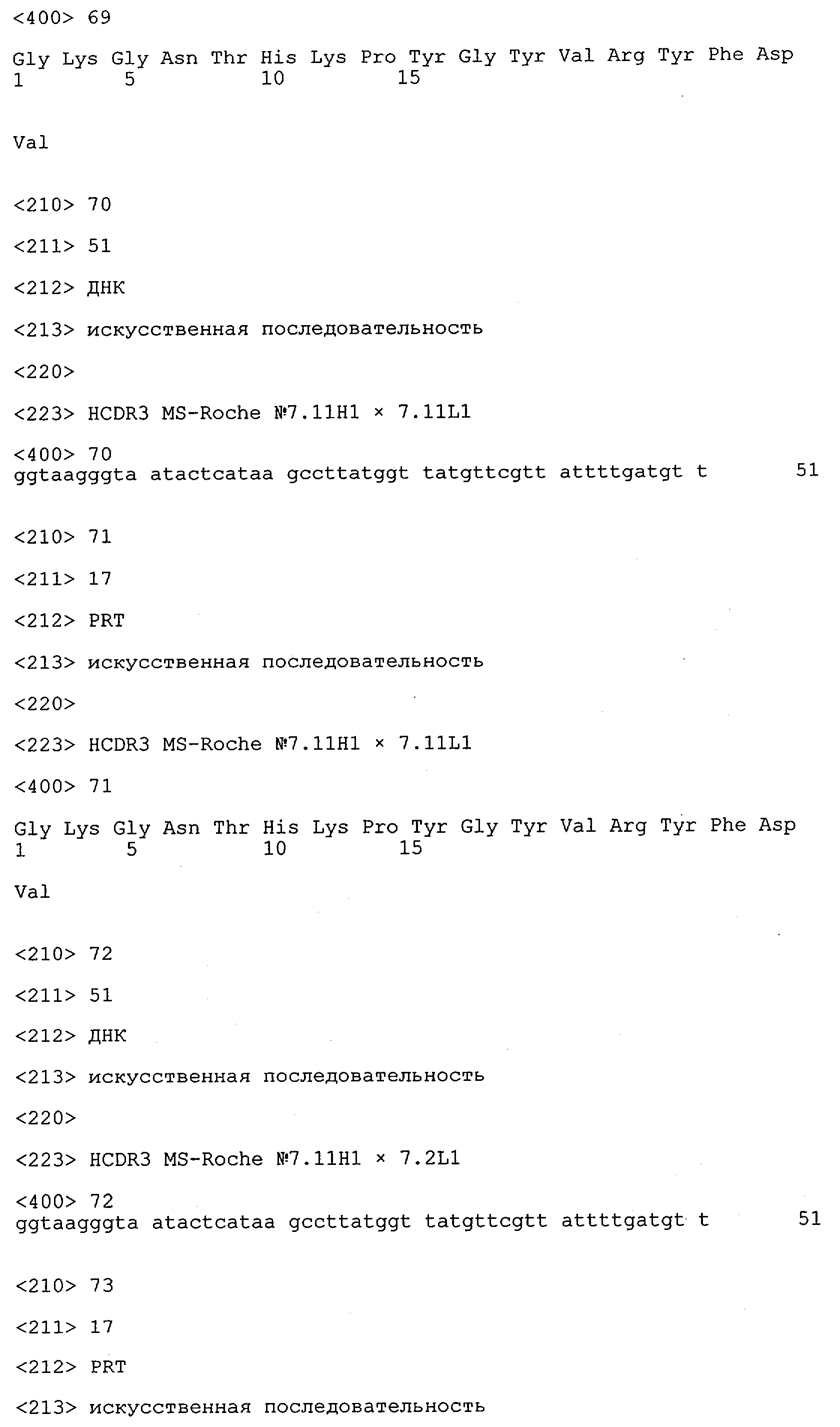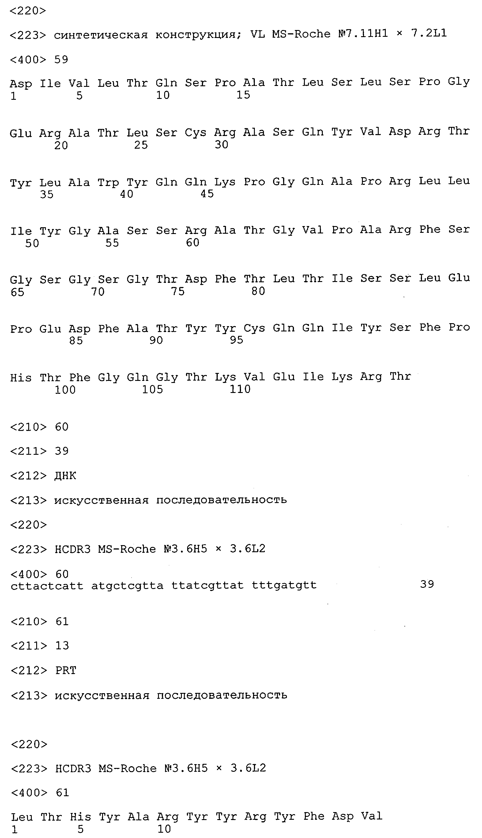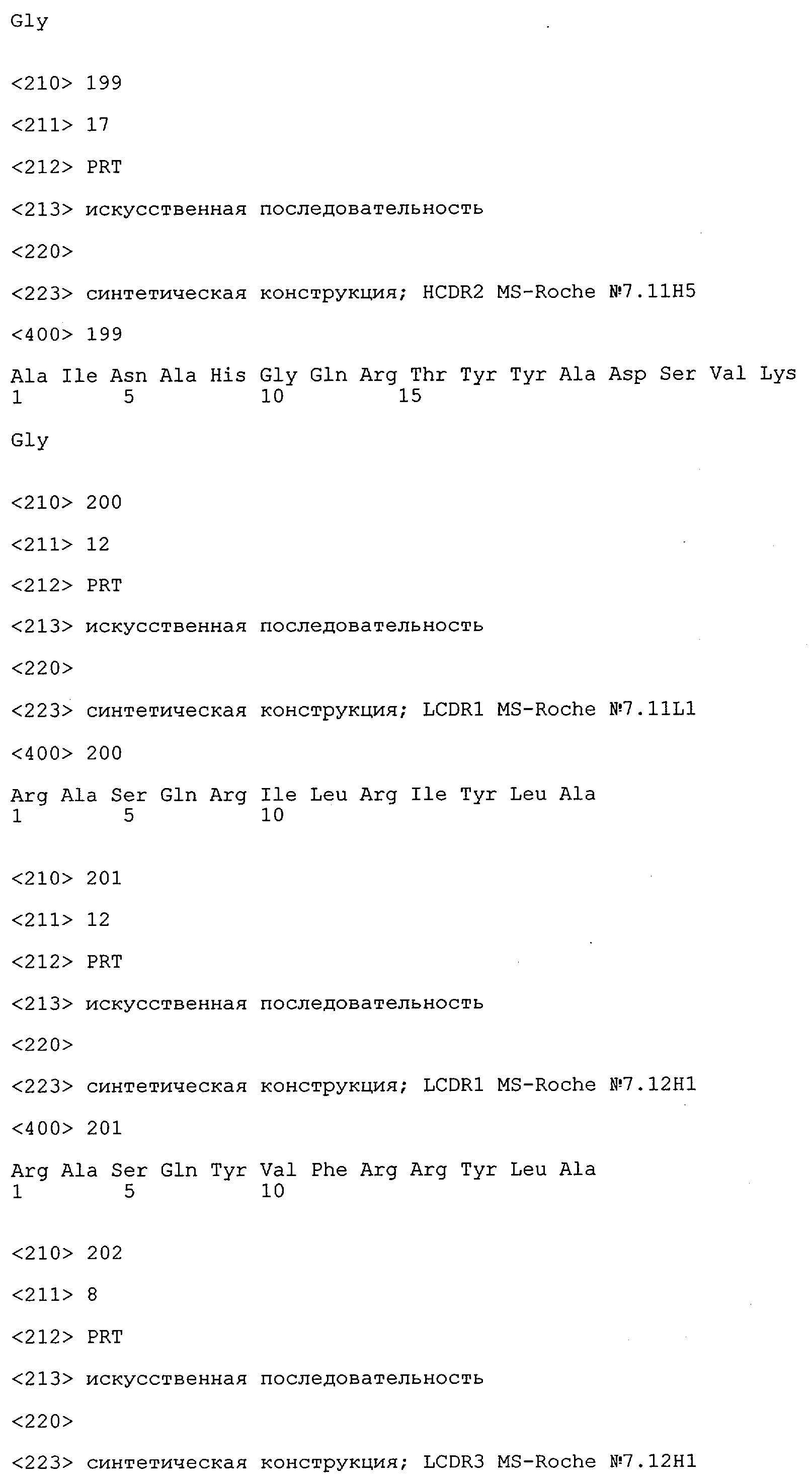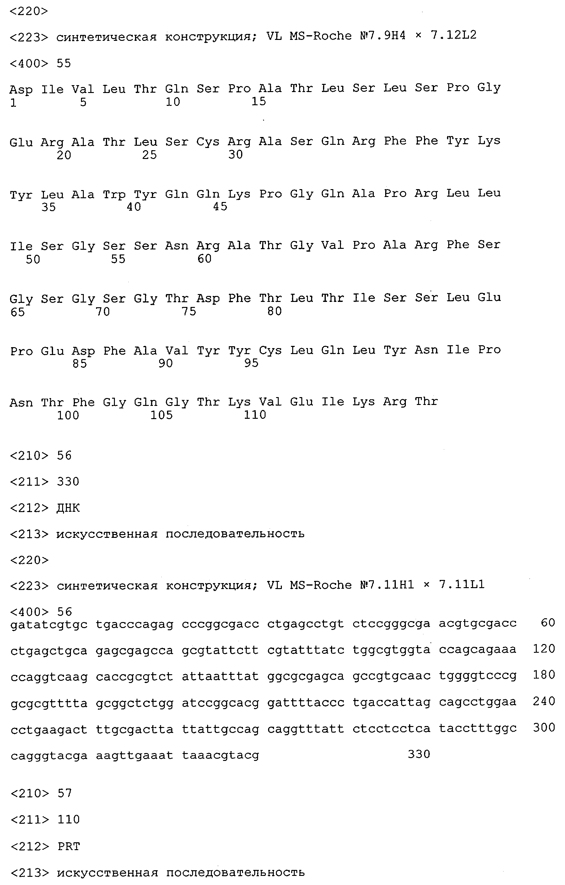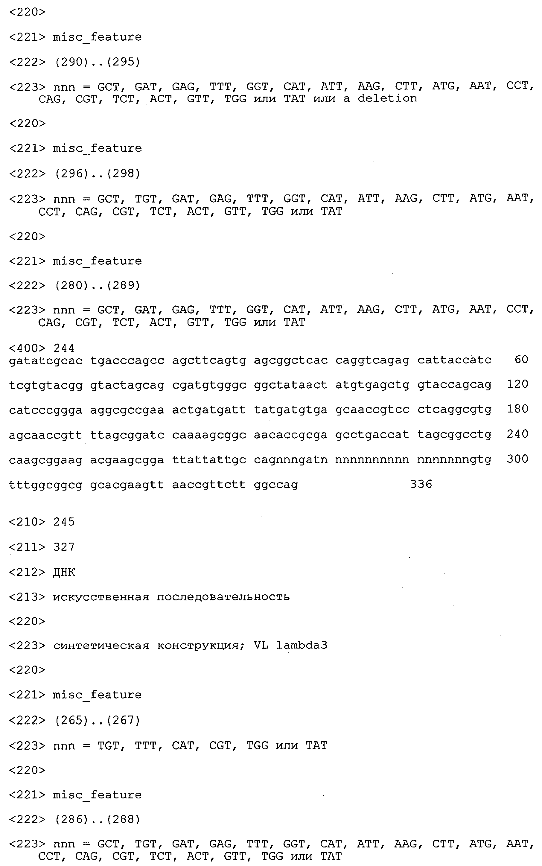 Получение антител перекрестным клонированием проиллюстрировано также в приведенных ниже примерах. Перечисленные выше предпочтительные полученные перекрестным клонированием антитела/молекулы антител представляют собой оптимизированные/созревшие молекулы антител, выведенные из описанных родительских антител, в частности из MSR-3 и MSR-7. Кроме того, характерные CDR-последовательности и V-области полученных перекрестным клонированием молекул антител/антител представлены ниже в SEQ ID NO:32, 33, 46 и 47 (MSR 3.6H5×3.6.L2; VH-, VL-области); 34, 35, 48 и 49 (MSR 3.6H8×3.6.L2; VH-, VL-области); 36, 37, 50 и 51 (MSR 7.4H2×7.2.L1; VH-, VL-области); 38, 39, 52 и 53 (MSR 7.9H2×7.12.L2; VH-, VL-области); 40, 41, 54 и 55 (MSR №7-9H4×7.12.L2; VH-, VL-области); 42, 43, 56 и 57 (MSR №7.11Н1×7.11.L1; VH-, VL-области) и 44, 45, 58 и 59 (MSR №7.11H1×7.2.L1; VH-, VL-области). Соответствующие CDR3-участки этих особенно предпочтительных полученных перекрестным клонированием молекул антител представлены в SEQ ID NO:60-87. Для других молекул MSR-антител CDR-участки VH-, VL-области можно обнаружить ниже в таблицах 8 или 10 и в прилагаемом перечне последовательностей, в частности SEQ ID NO:32-95 для MS-R- антител/молекул антител №3.6Н5×3.6L2, №3.6Н8×3.6L2, №7.4Н2×7.2L1, №7.9Н2×7.12L2, №7.9Н4×7.12L2, №7.11Н1×7.11L1, №7.11Н1×7.2L1 и №7.9Н7 или SEQ ID NO:294-413 для MSR-R-антител/молекул антител №3.3Н1×3.4L1, №3.4Н1×3.4L9, №3.4Н3×3.4L7, №3.4Н3×3.4L9, №3.4Н7×3.4L9, №3.4Н7×3.4L7, №3.6Н5×3.6L1, №7.2Н2×7.2L1, №7.4Н2×7.12L2, №7.9Н2×7.2L1, №7.9Н2×7.12L1, №7.11Н2×7.2L1, №7.11Н2×7.9L1, №7.11Н2×7.12L1 или №8.1Н1×8.2L1. Таким образом, помимо указанных выше VH-областей предпочтительные молекулы антител, предлагаемые в изобретении, могут содержать VH-области, указанные в любой из SEQ ID NO:294-323. Аналогично этому, в SEQ ID NO:324-353 представлены VL-области, которые помимо указанных выше VL-областей, могут нести молекулы антител, предлагаемые в изобретении. Соответствующие CDR-участки указаны выше, а также могут быть представлены последовательностями, указанными в SEQ ID NO:354-413.