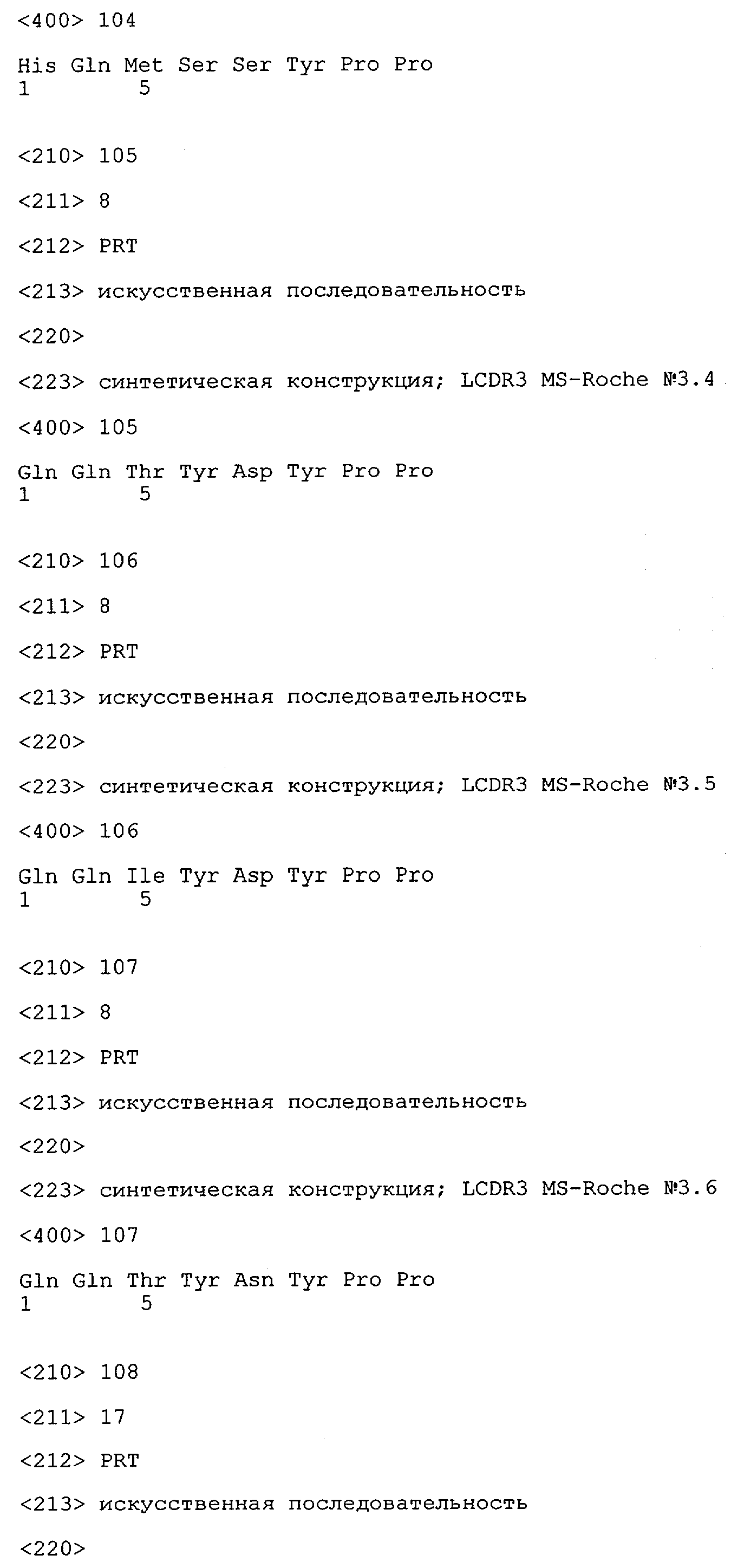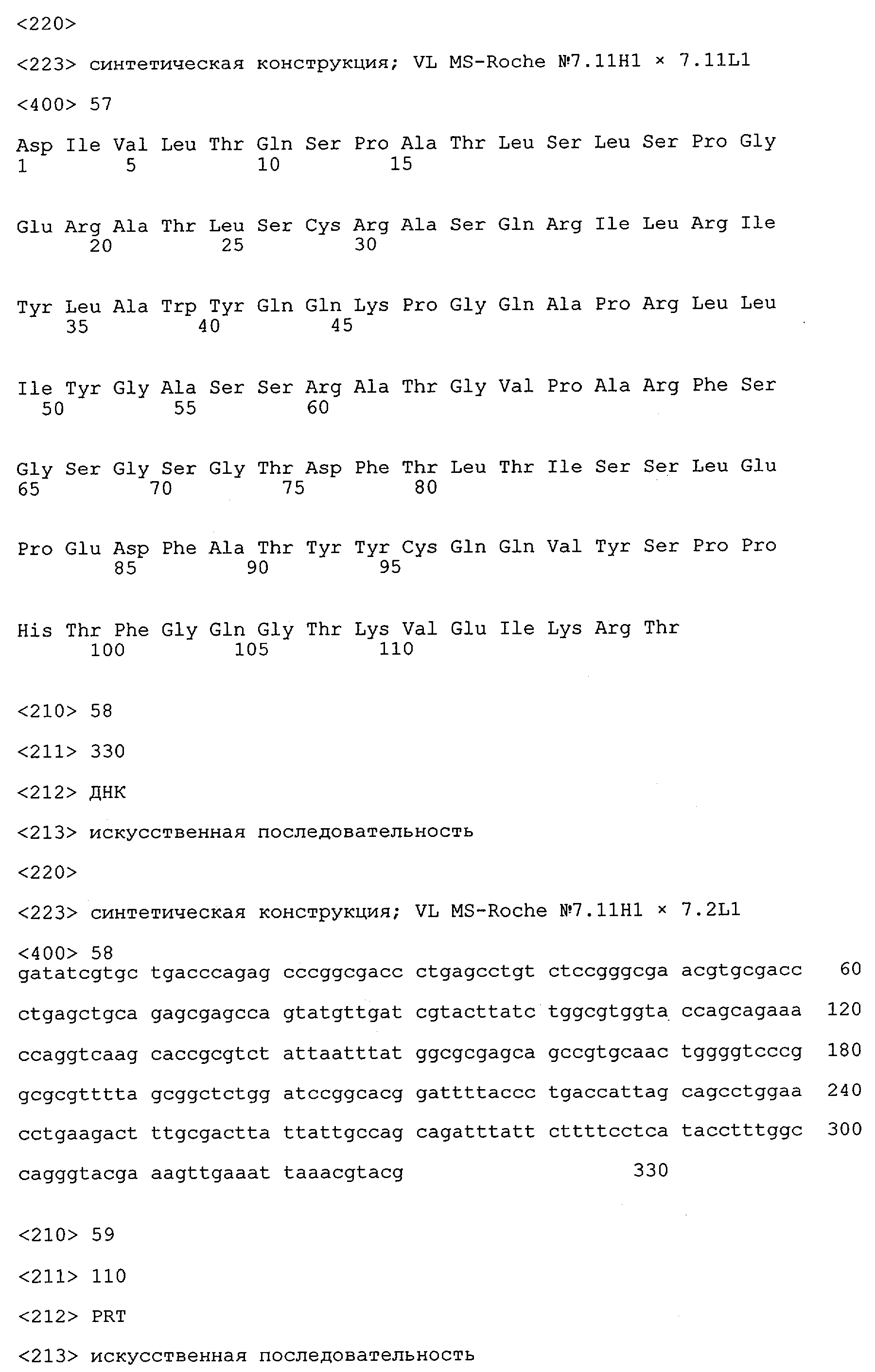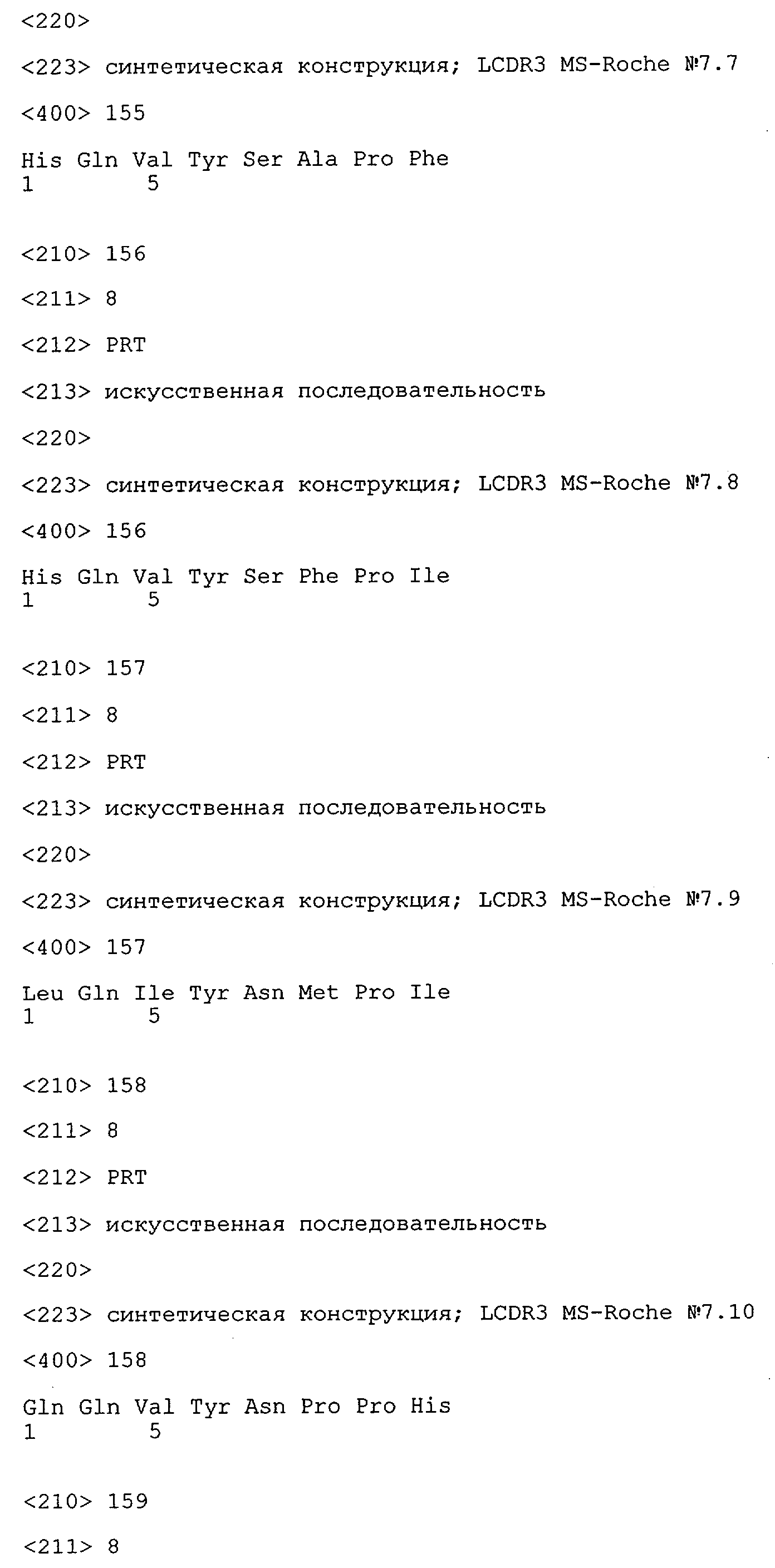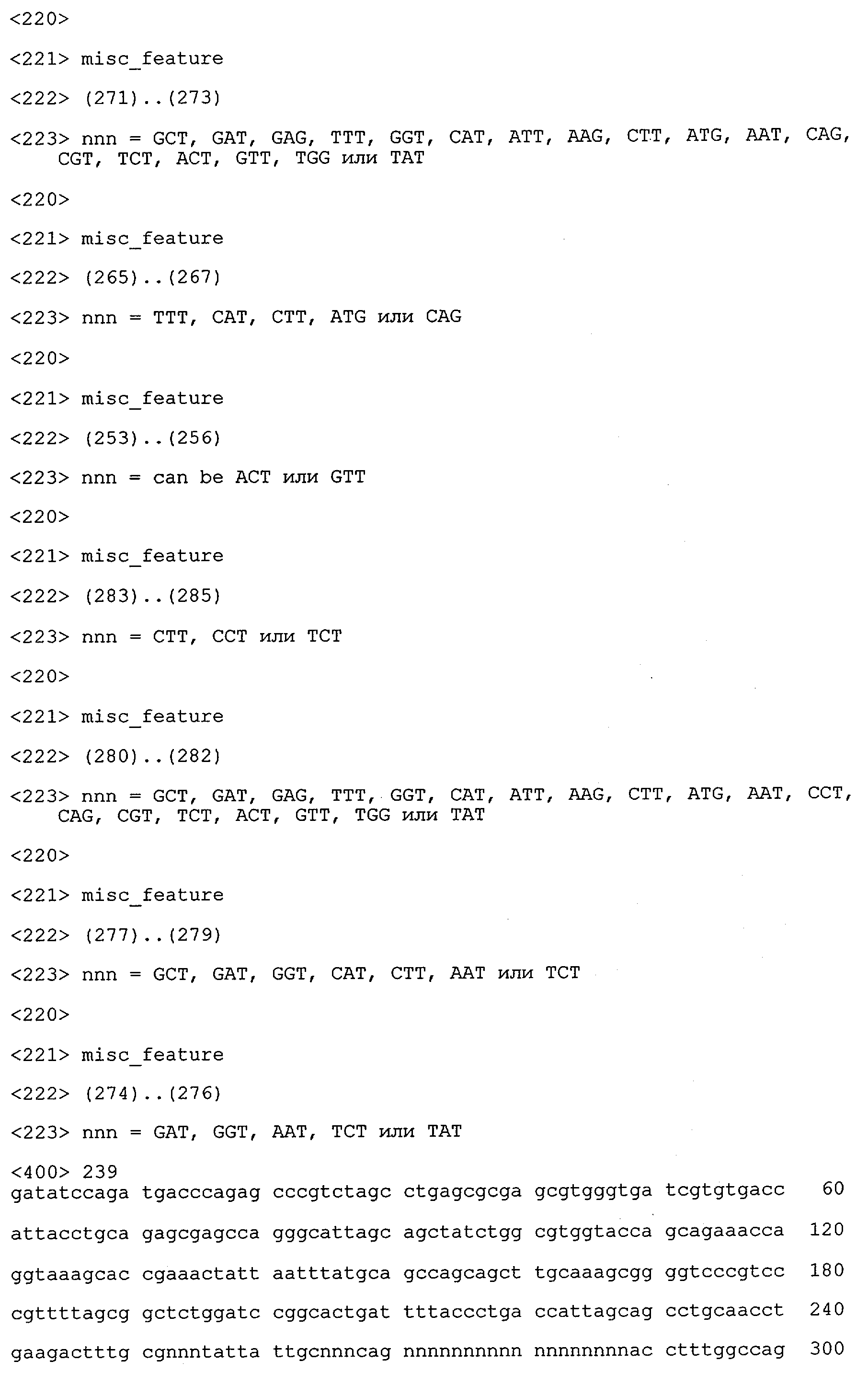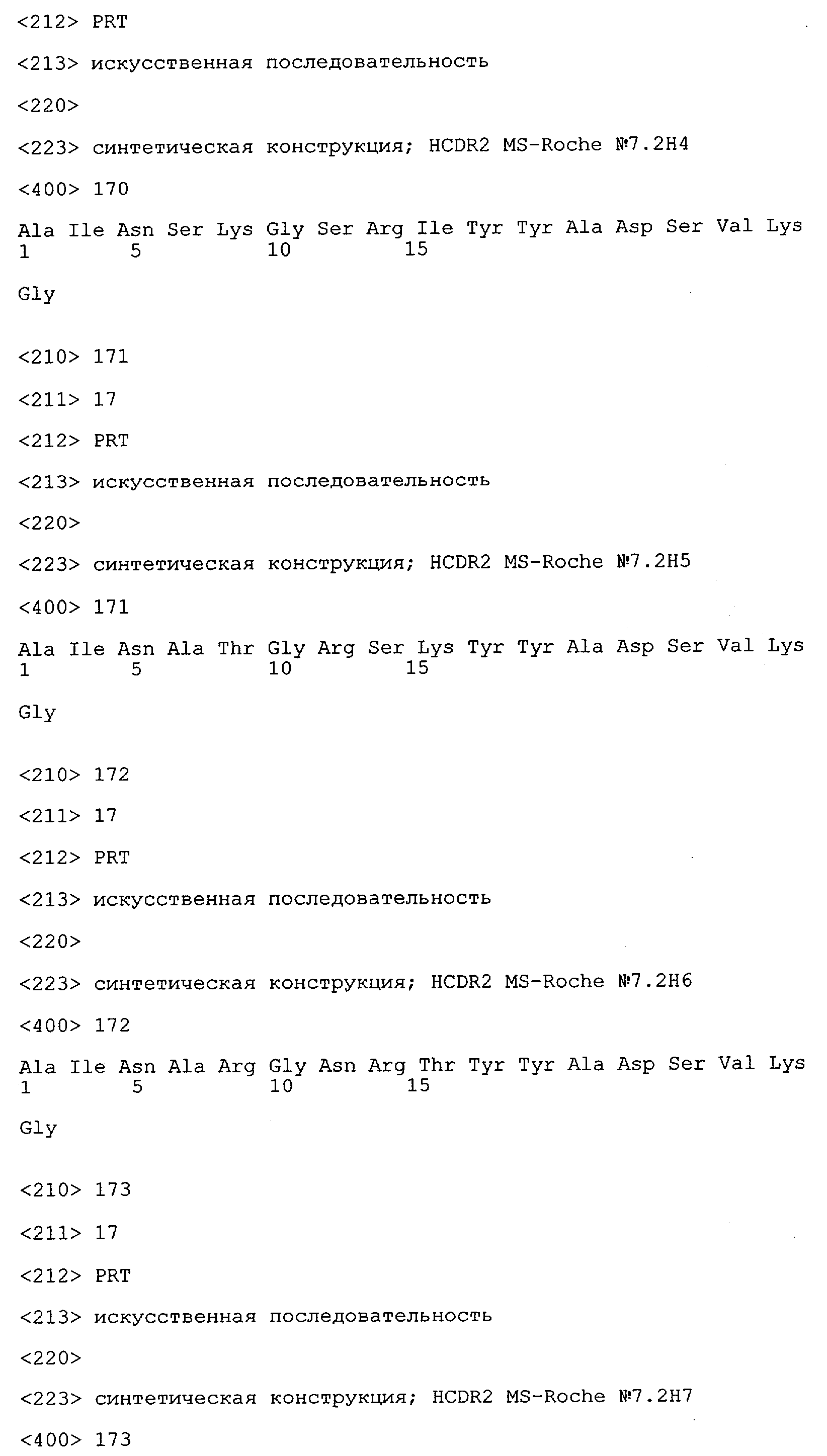 Получение антител перекрестным клонированием проиллюстрировано также в приведенных ниже примерах. Перечисленные выше предпочтительные полученные перекрестным клонированием антитела/молекулы антител представляют собой оптимизированные/созревшие молекулы антител, выведенные из описанных родительских антител, в частности из MSR-3 и MSR-7. Кроме того, характерные CDR-последовательности и V-области полученных перекрестным клонированием молекул антител/антител представлены ниже в SEQ ID NO:32, 33, 46 и 47 (MSR 3.6H5×3.6.L2; VH-, VL-области); 34, 35, 48 и 49 (MSR 3.6H8×3.6.L2; VH-, VL-области); 36, 37, 50 и 51 (MSR 7.4H2×7.2.L1; VH-, VL-области); 38, 39, 52 и 53 (MSR 7.9H2×7.12.L2; VH-, VL-области); 40, 41, 54 и 55 (MSR №7-9H4×7.12.L2; VH-, VL-области); 42, 43, 56 и 57 (MSR №7.11Н1×7.11.L1; VH-, VL-области) и 44, 45, 58 и 59 (MSR №7.11H1×7.2.L1; VH-, VL-области). Соответствующие CDR3-участки этих особенно предпочтительных полученных перекрестным клонированием молекул антител представлены в SEQ ID NO:60-87. Для других молекул MSR-антител CDR-участки VH-, VL-области можно обнаружить ниже в таблицах 8 или 10 и в прилагаемом перечне последовательностей, в частности SEQ ID NO:32-95 для MS-R- антител/молекул антител №3.6Н5×3.6L2, №3.6Н8×3.6L2, №7.4Н2×7.2L1, №7.9Н2×7.12L2, №7.9Н4×7.12L2, №7.11Н1×7.11L1, №7.11Н1×7.2L1 и №7.9Н7 или SEQ ID NO:294-413 для MSR-R-антител/молекул антител №3.3Н1×3.4L1, №3.4Н1×3.4L9, №3.4Н3×3.4L7, №3.4Н3×3.4L9, №3.4Н7×3.4L9, №3.4Н7×3.4L7, №3.6Н5×3.6L1, №7.2Н2×7.2L1, №7.4Н2×7.12L2, №7.9Н2×7.2L1, №7.9Н2×7.12L1, №7.11Н2×7.2L1, №7.11Н2×7.9L1, №7.11Н2×7.12L1 или №8.1Н1×8.2L1. Таким образом, помимо указанных выше VH-областей предпочтительные молекулы антител, предлагаемые в изобретении, могут содержать VH-области, указанные в любой из SEQ ID NO:294-323. Аналогично этому, в SEQ ID NO:324-353 представлены VL-области, которые помимо указанных выше VL-областей, могут нести молекулы антител, предлагаемые в изобретении. Соответствующие CDR-участки указаны выше, а также могут быть представлены последовательностями, указанными в SEQ ID NO:354-413.