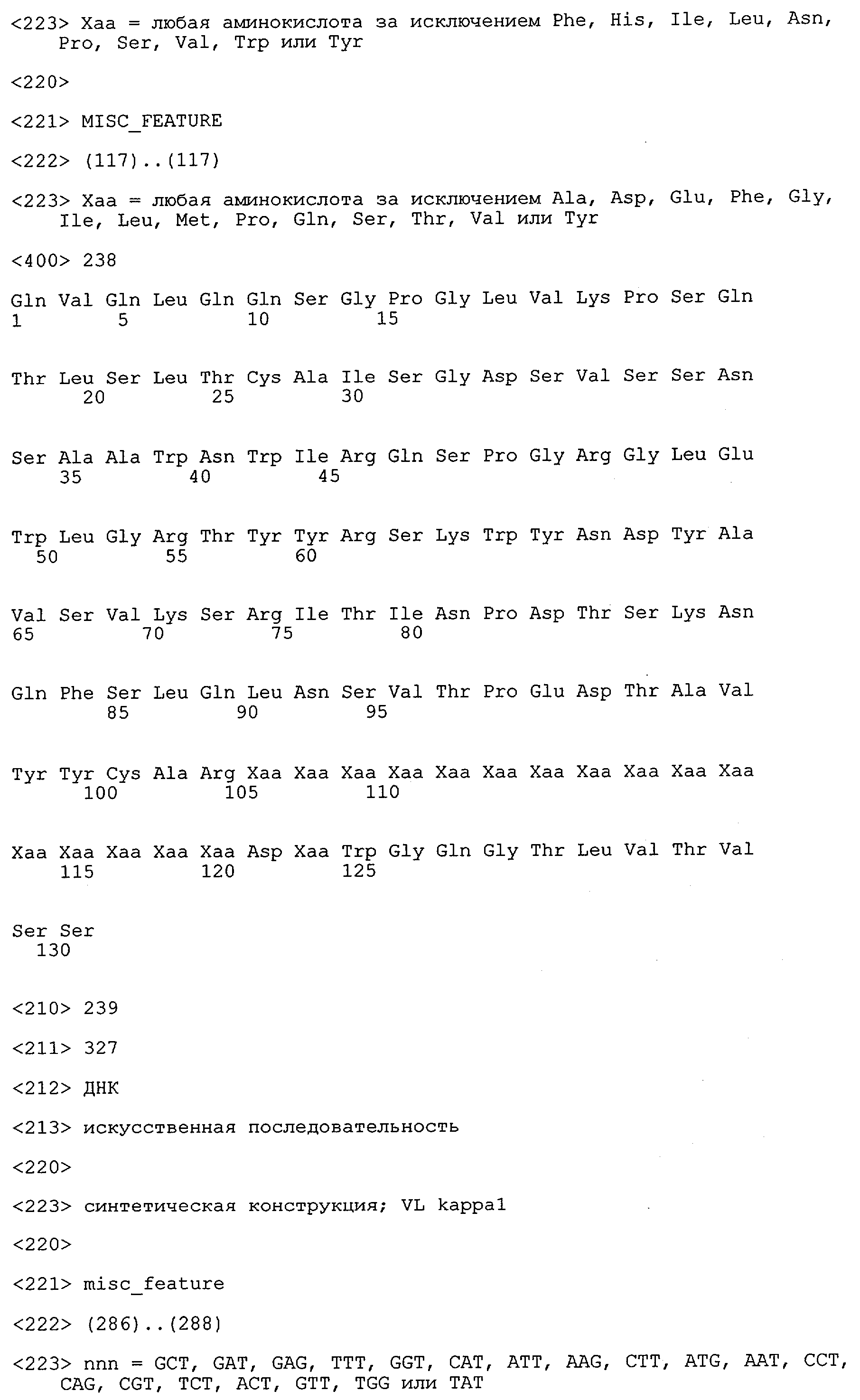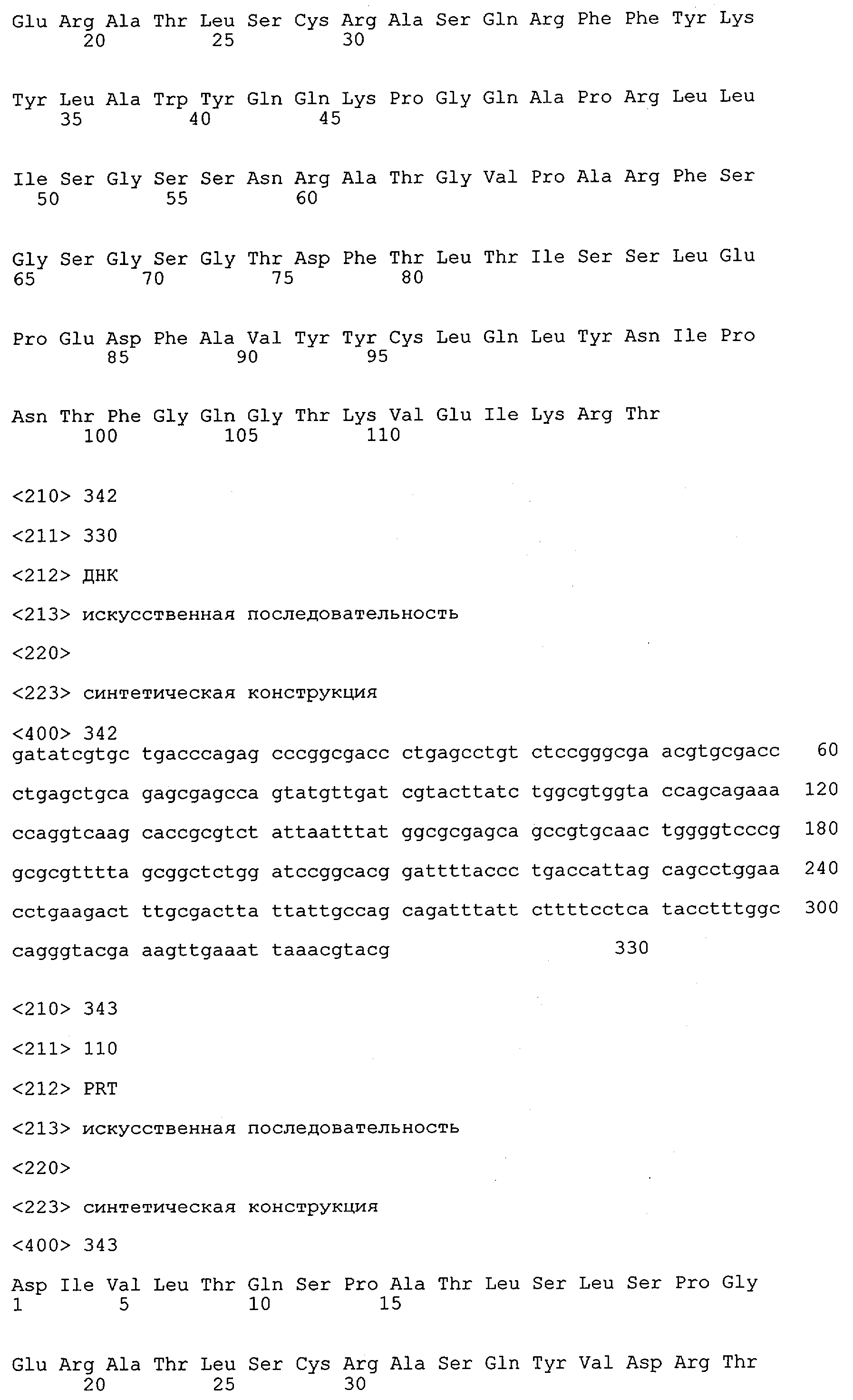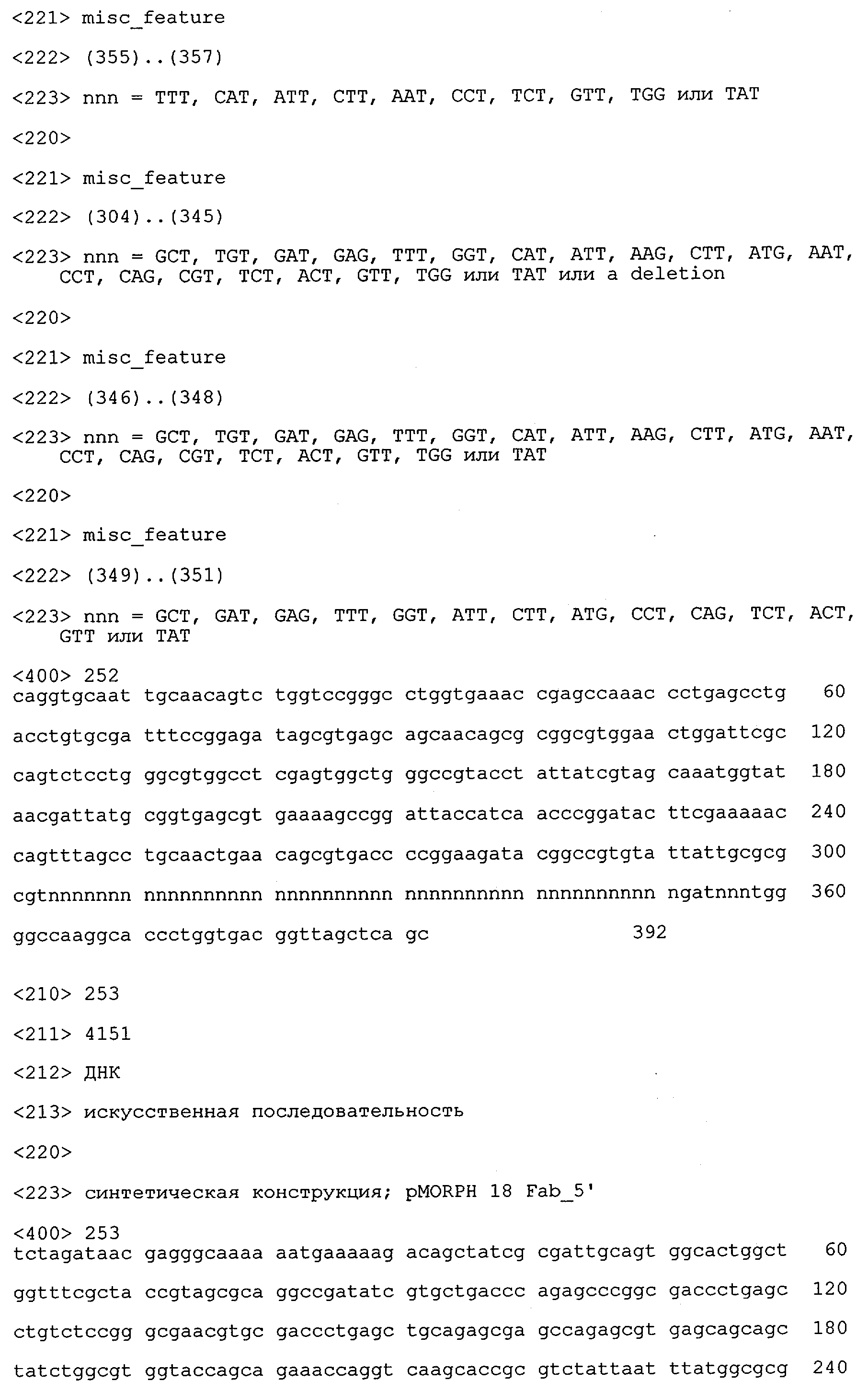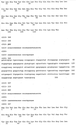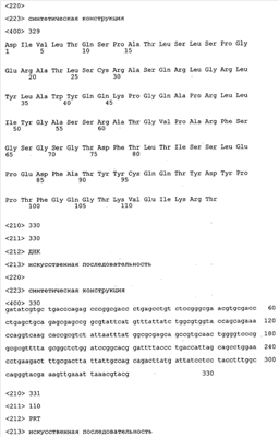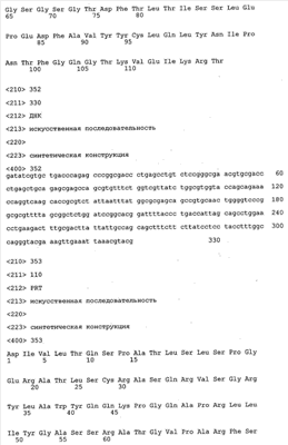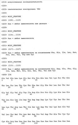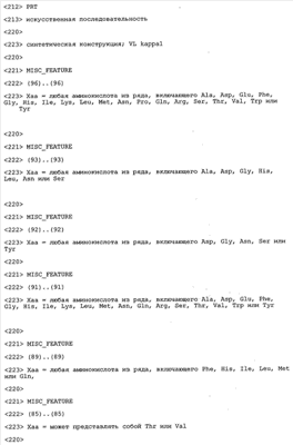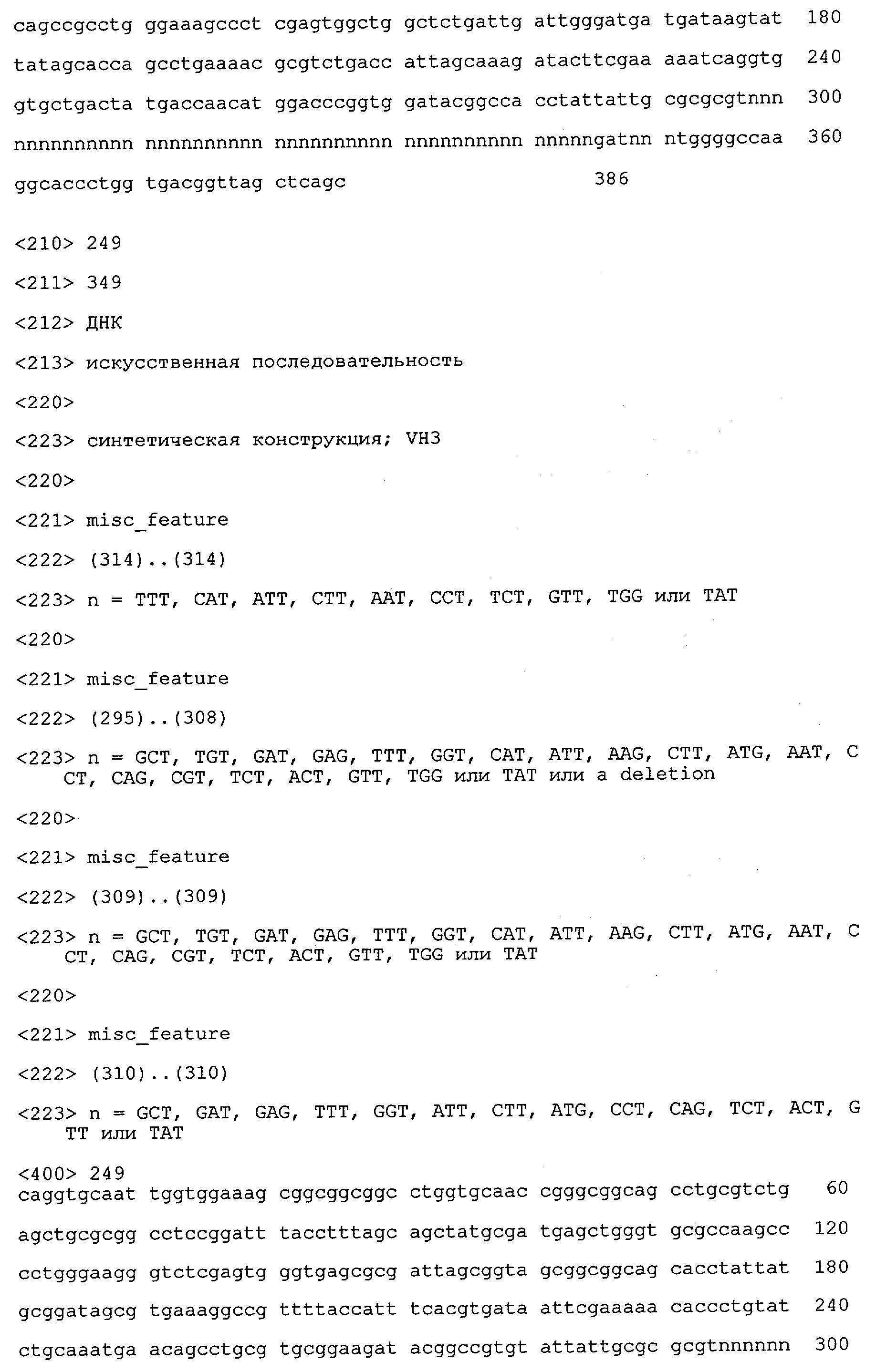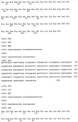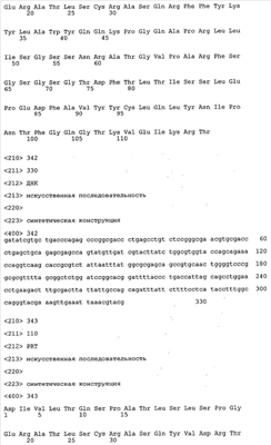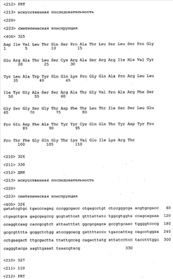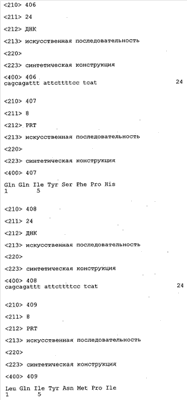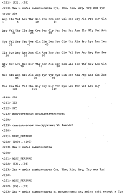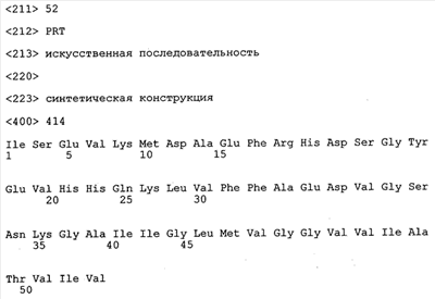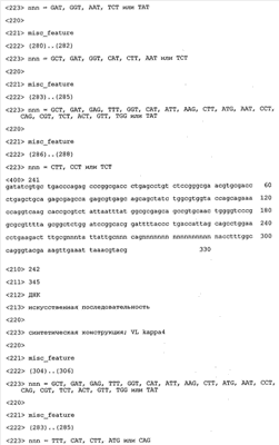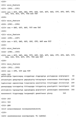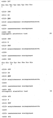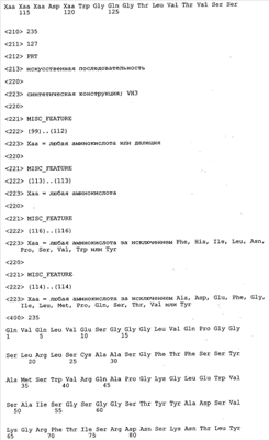 В противоположность этому отбор антител/молекул антител, предлагаемых в настоящем изобретении, обусловливается физической адгезией экспрессирующих Fab-фрагменты фагов с антигеном. В этом процессе отбора in vitro отсутствует стадия расщепления антигена. Фаги, экспрессирующие Fab-фрагмент, который обладает наиболее высокой аффинностью к антигену, отбирают и размножают. Синтетическая библиотека, применяемая в приведенных ниже примерах для отбора специфических молекул антител, предлагаемых в настоящем изобретении, наиболее пригодна для исключения любых стандартных ошибок, связанных с индивидуальными непрерывными эпитопами, которые часто встречаются в библиотеках, выведенных из иммунизированных В-клеток.